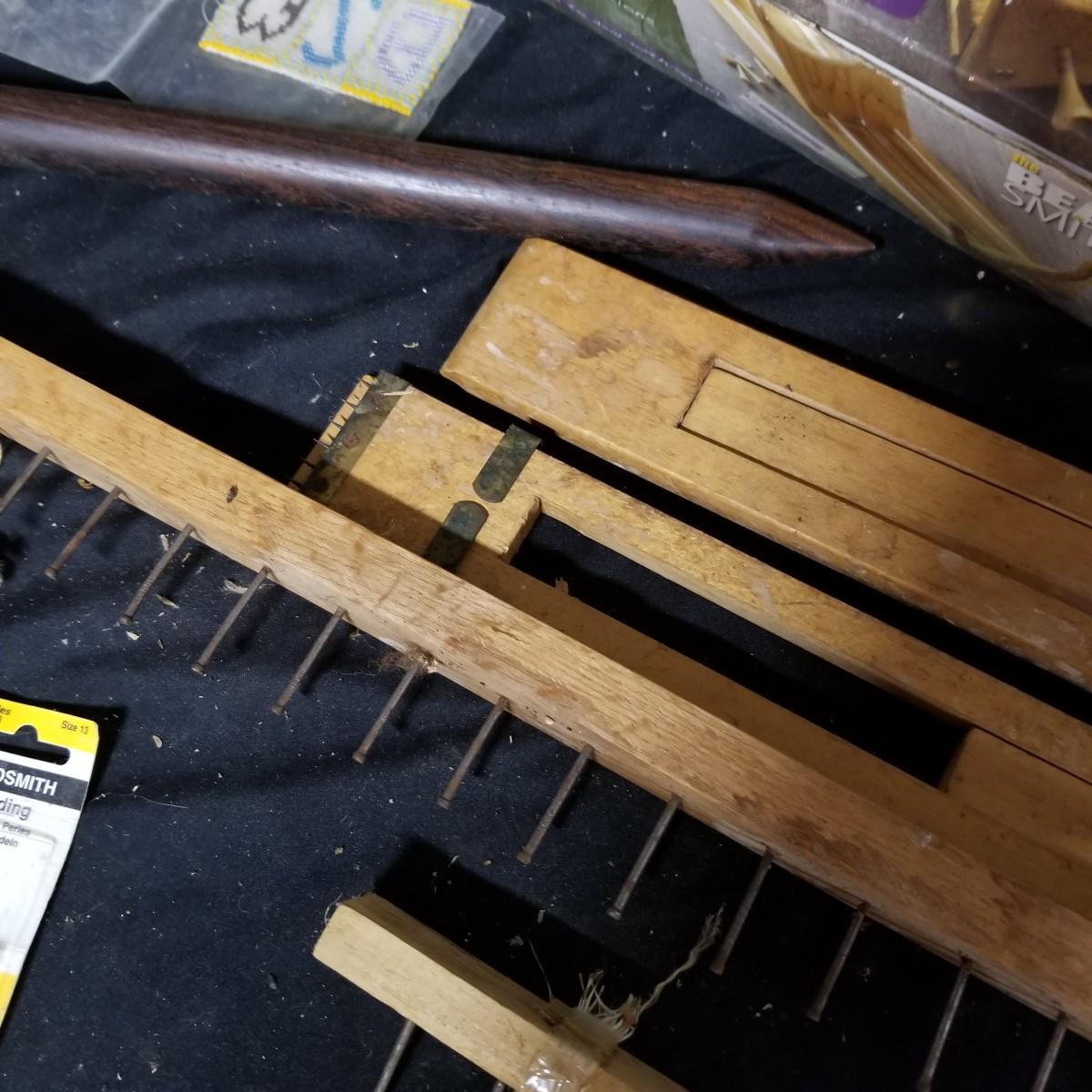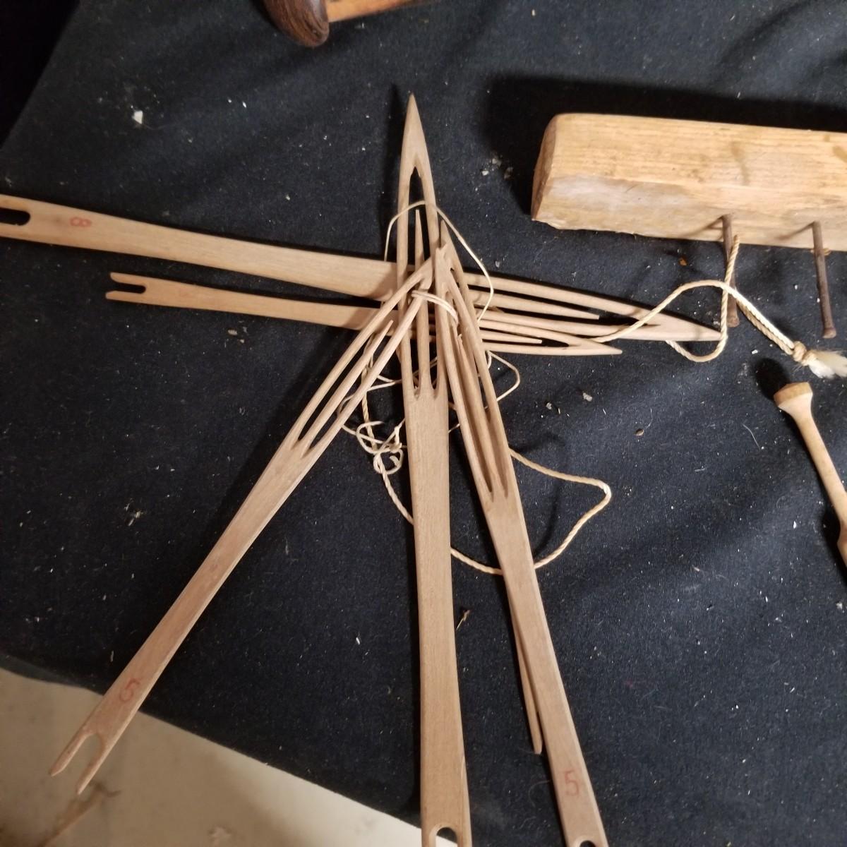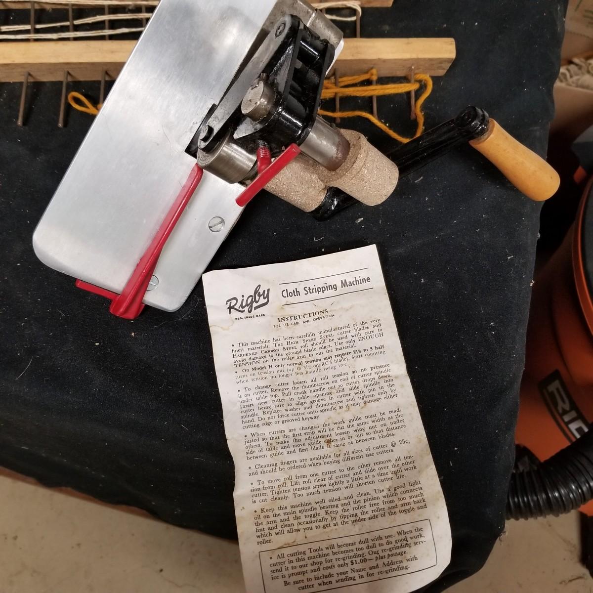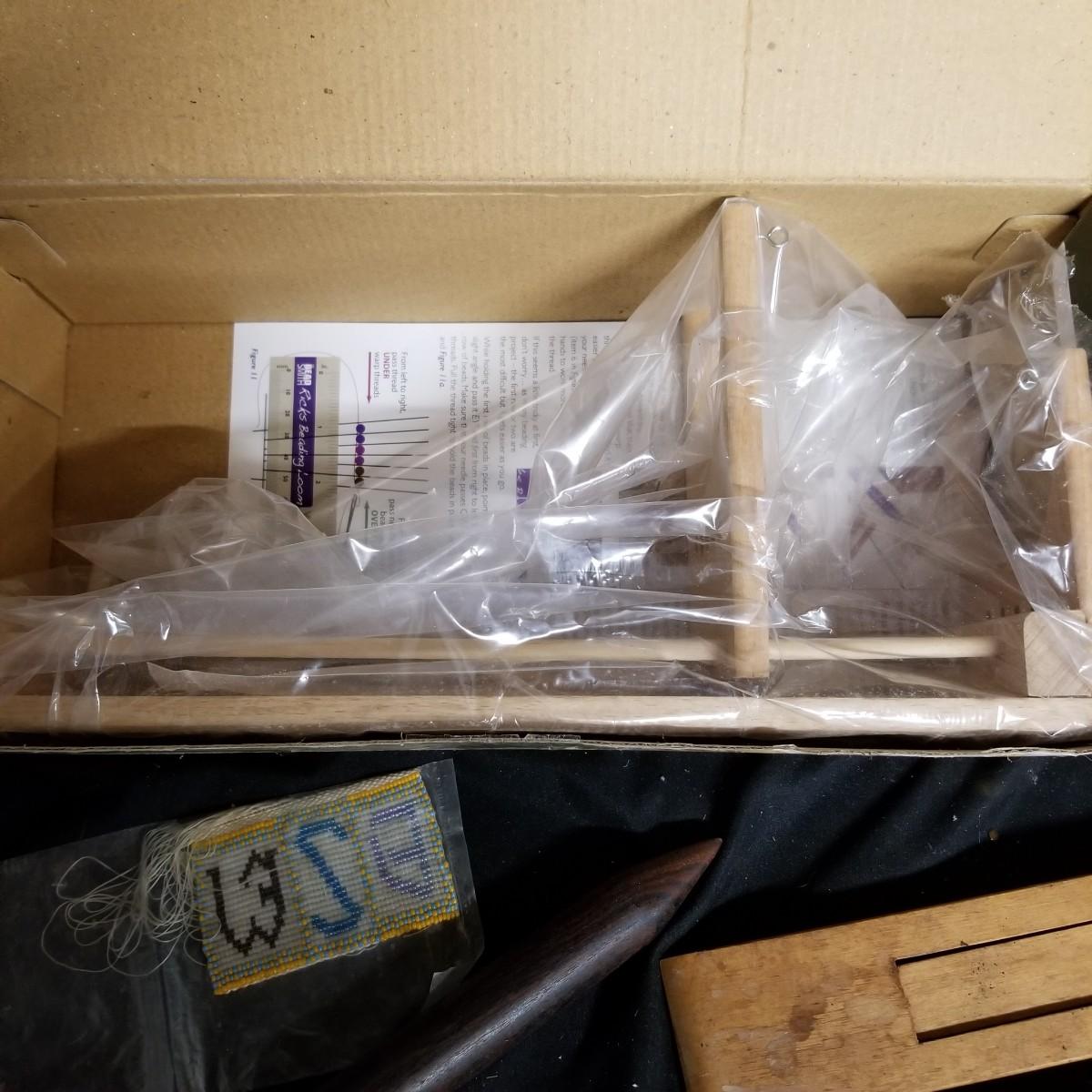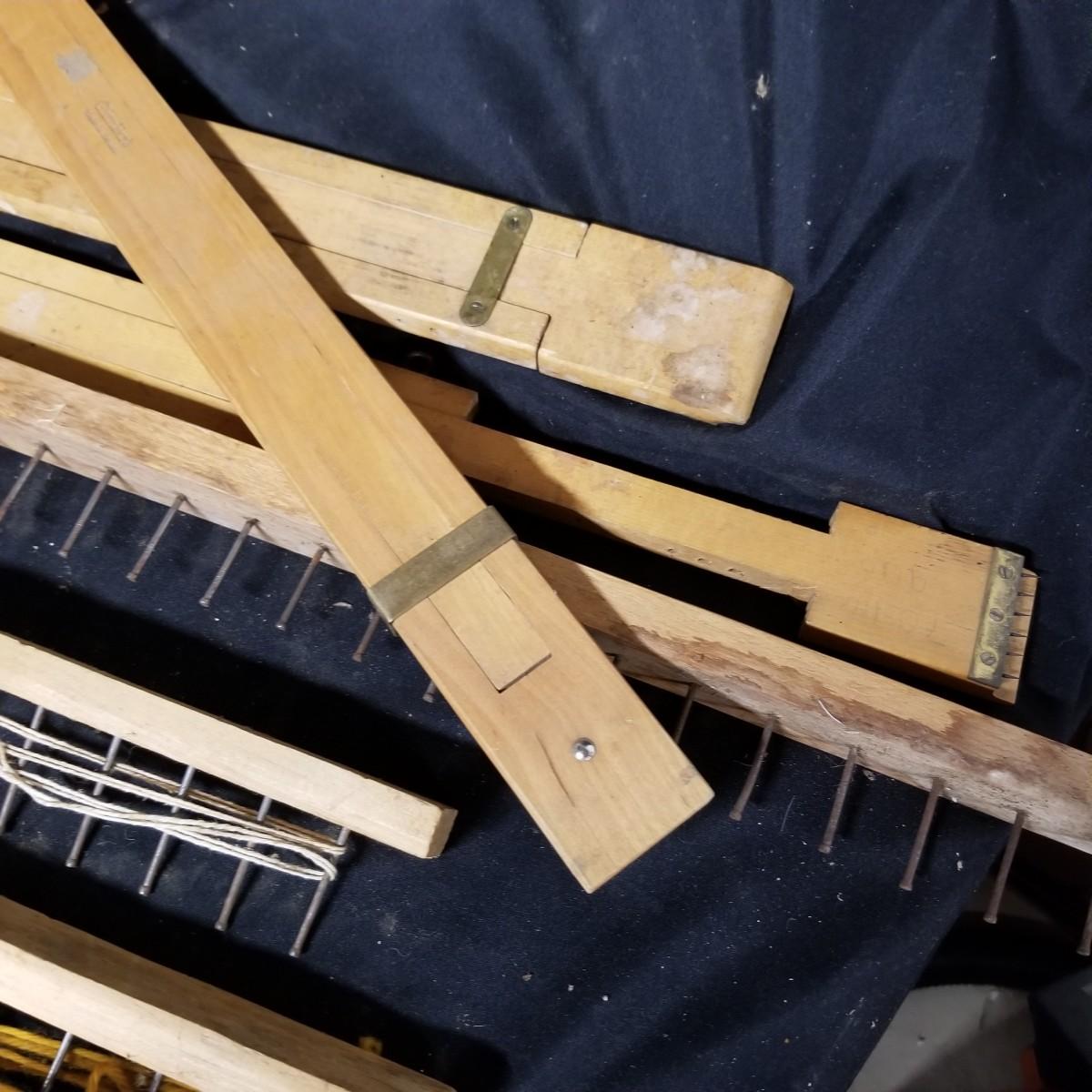 Various items for weaving.   New Rick's beading loom +needles, a Rigby cloth stripping machine, table mount, and several warp stretching items, some handmade and one Glimakra made in Sweden. Also a walnut knitting needle, 14" x1" d.  And #3, #5,and #8 netting or knife shuttles. Shipping available.