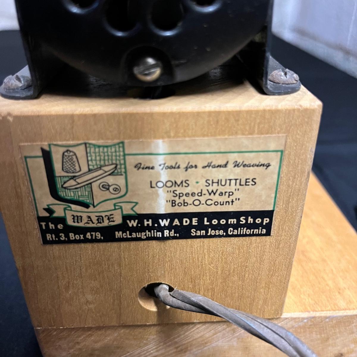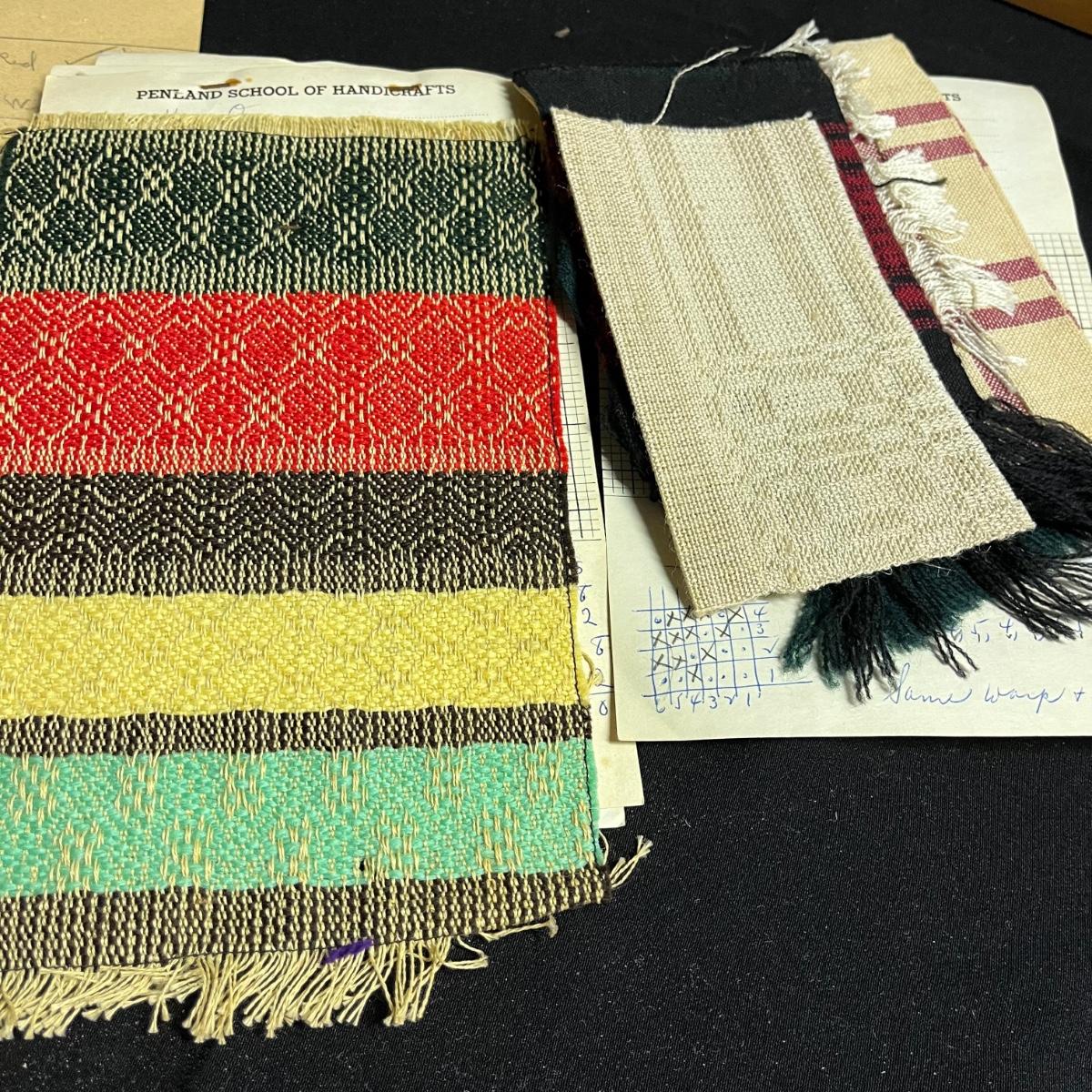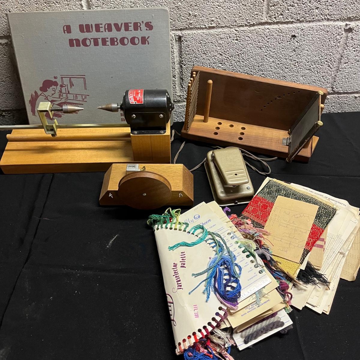 Lot includes a Counter, electric bobbin winder with foot control that worked when tested, A Weavers Notebook, Samples, yarn counter and more.