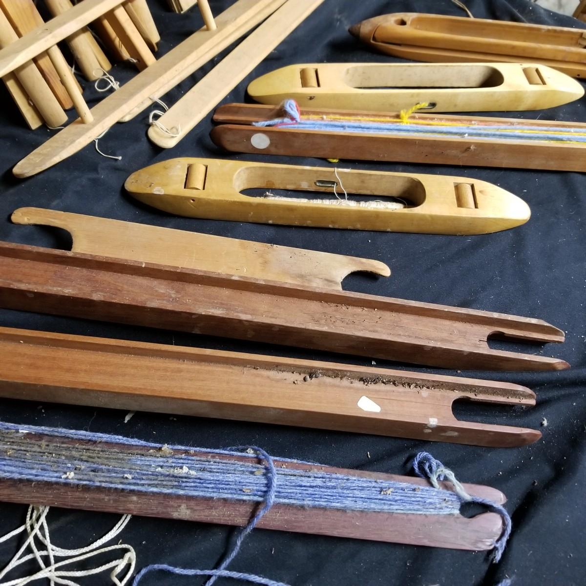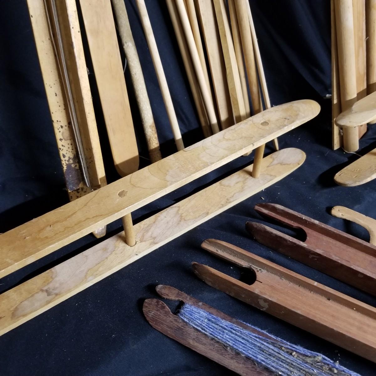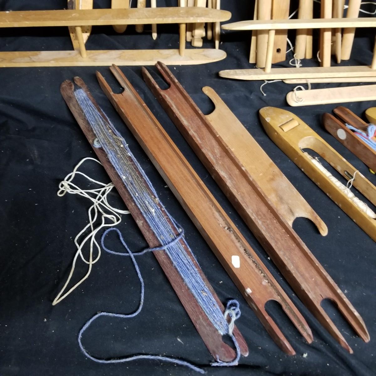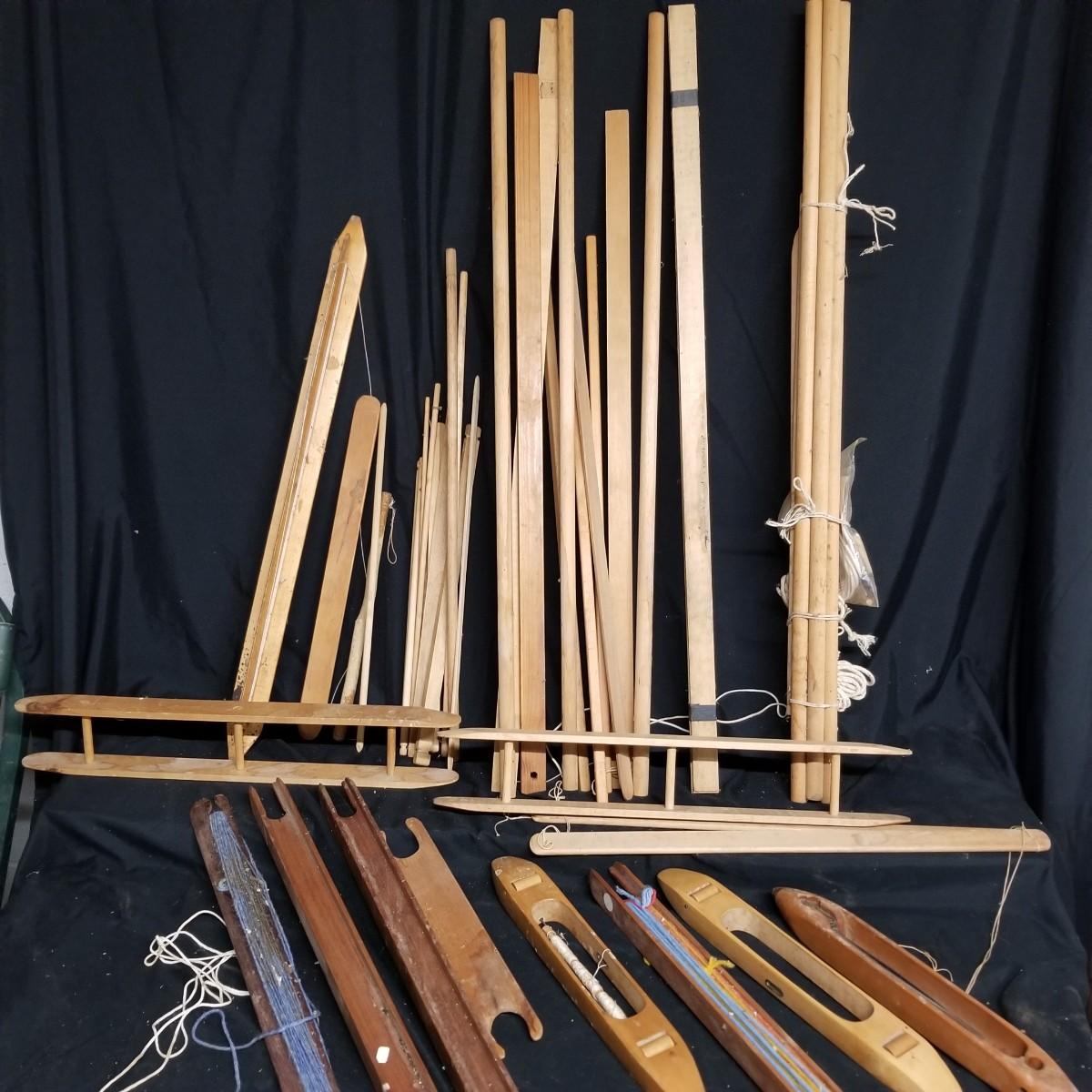 An assortment of shuttles, lease sticks and more. Shuttles vary in length from 15" to 28" and include standard as well as rug styles. One item marked with Lowell Shuttle Co, Mass. Lease sticks and others up to 36" in length Many handmade items. Local pickup only.