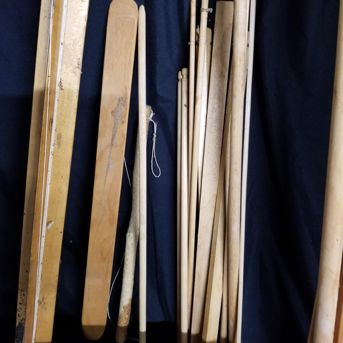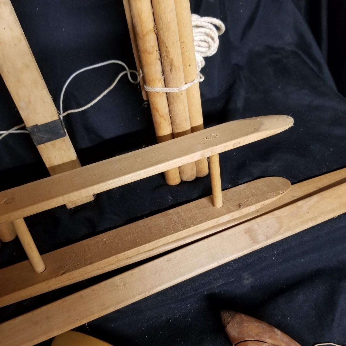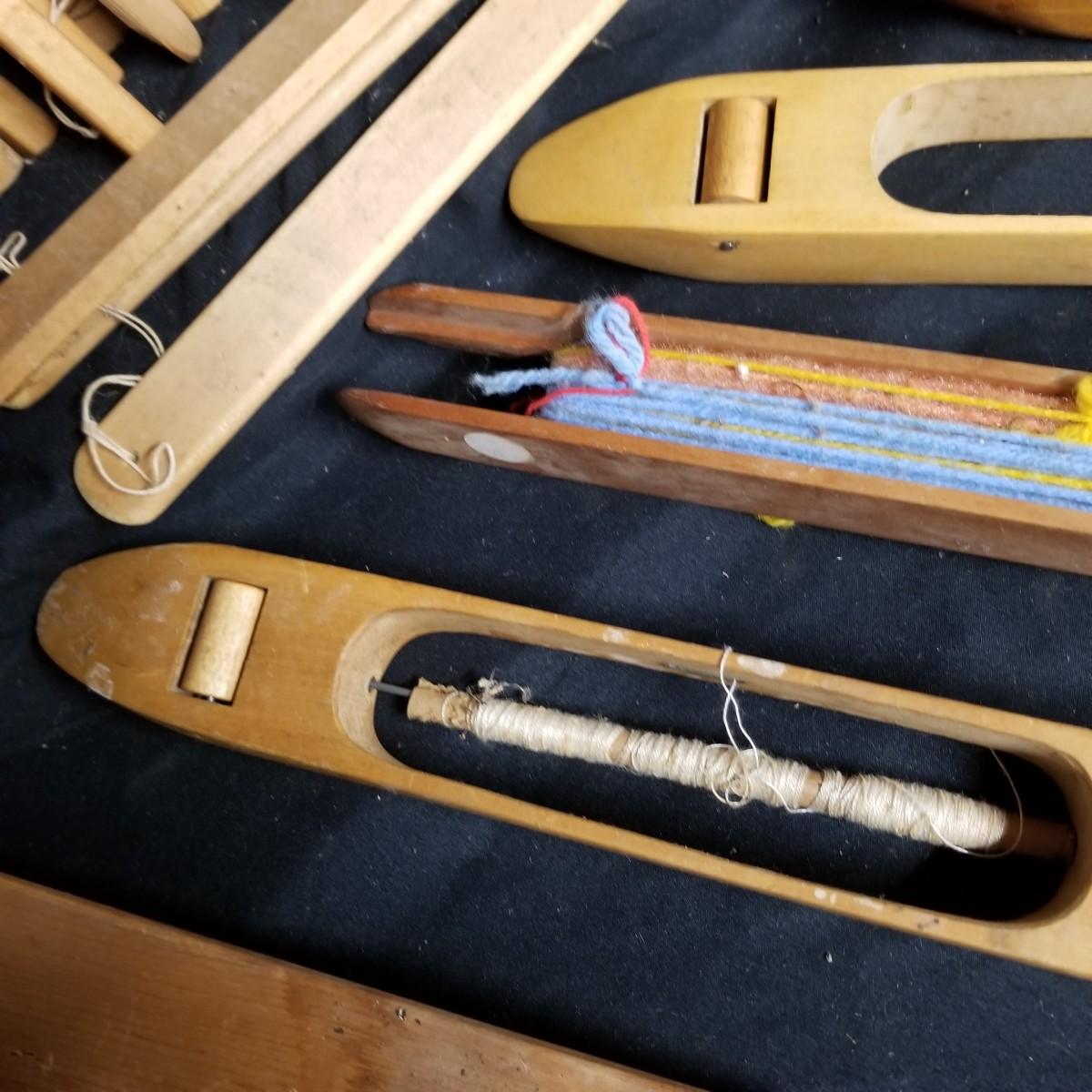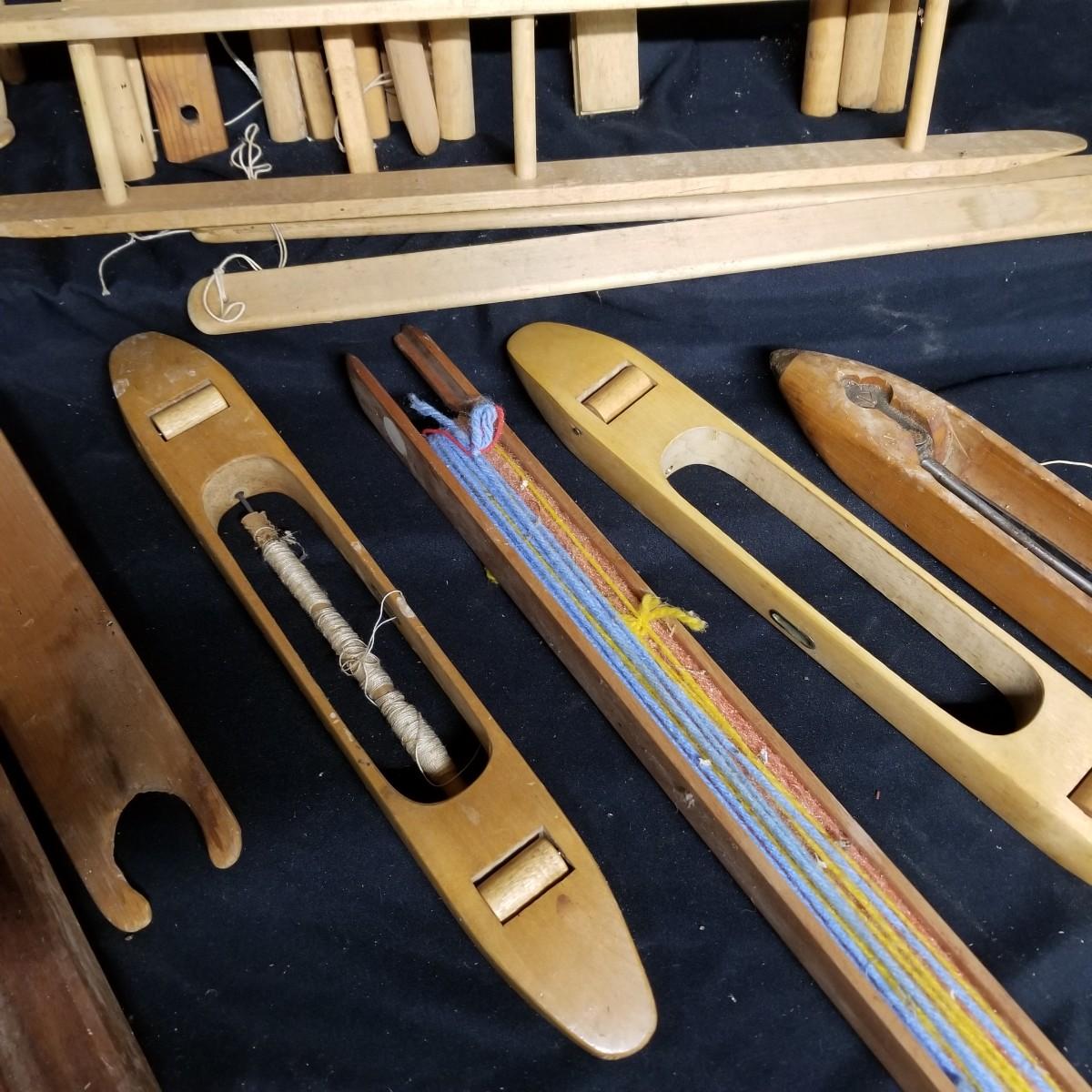 An assortment of shuttles, lease sticks and more. Shuttles vary in length from 15" to 28" and include standard as well as rug styles. One item marked with Lowell Shuttle Co, Mass. Lease sticks and others up to 36" in length Many handmade items. Local pickup only.