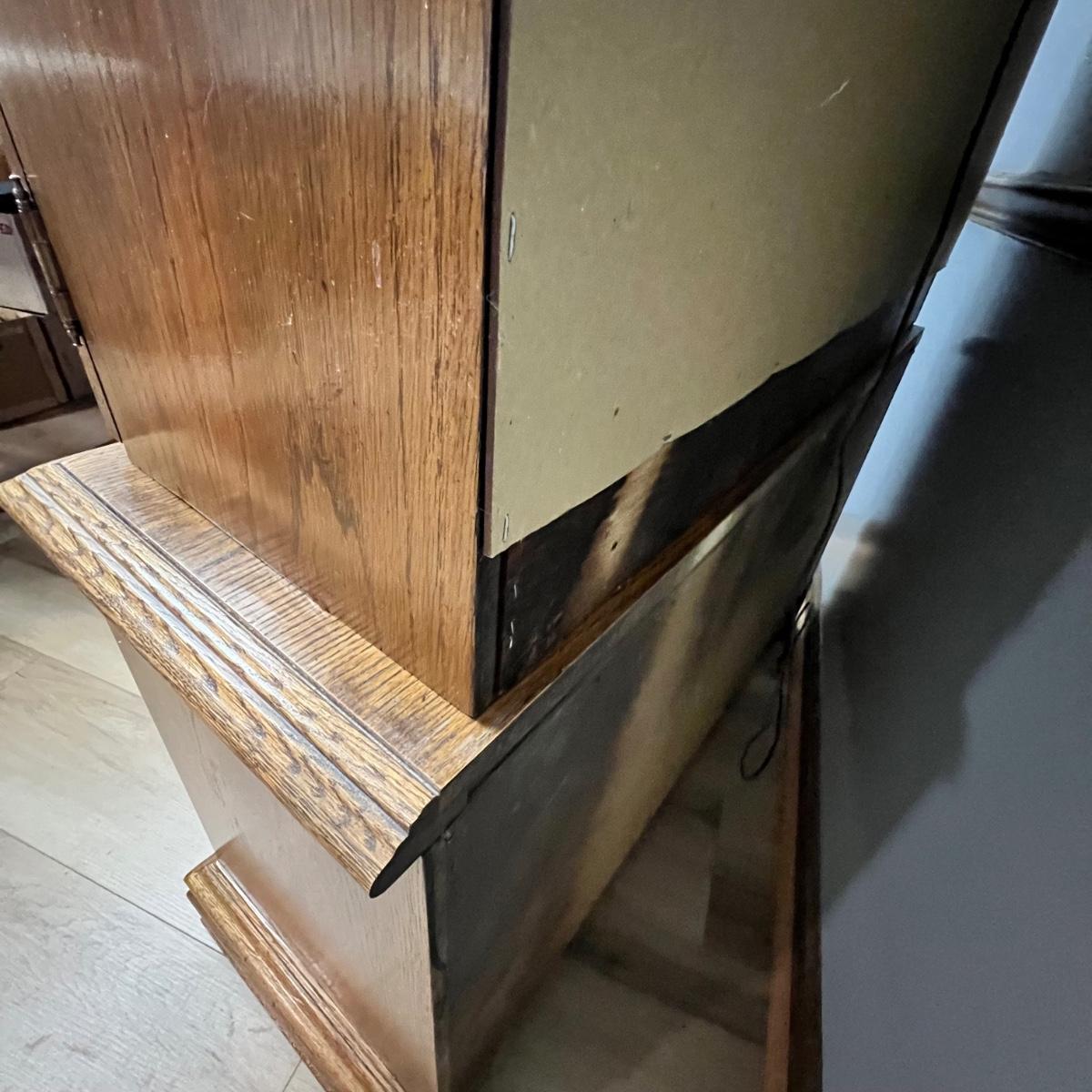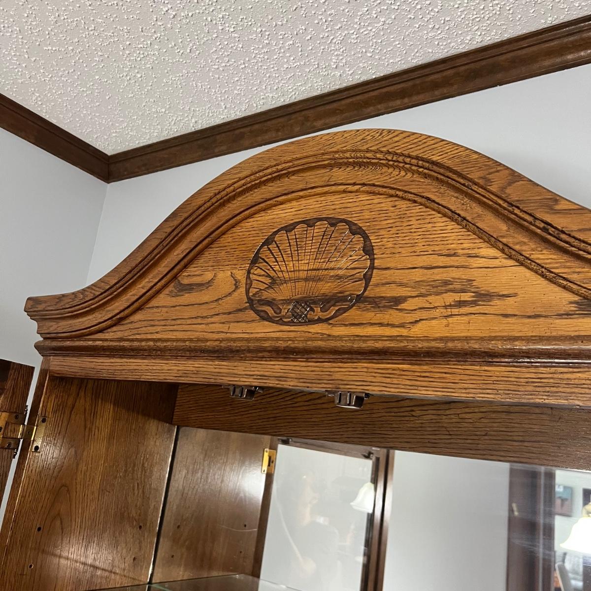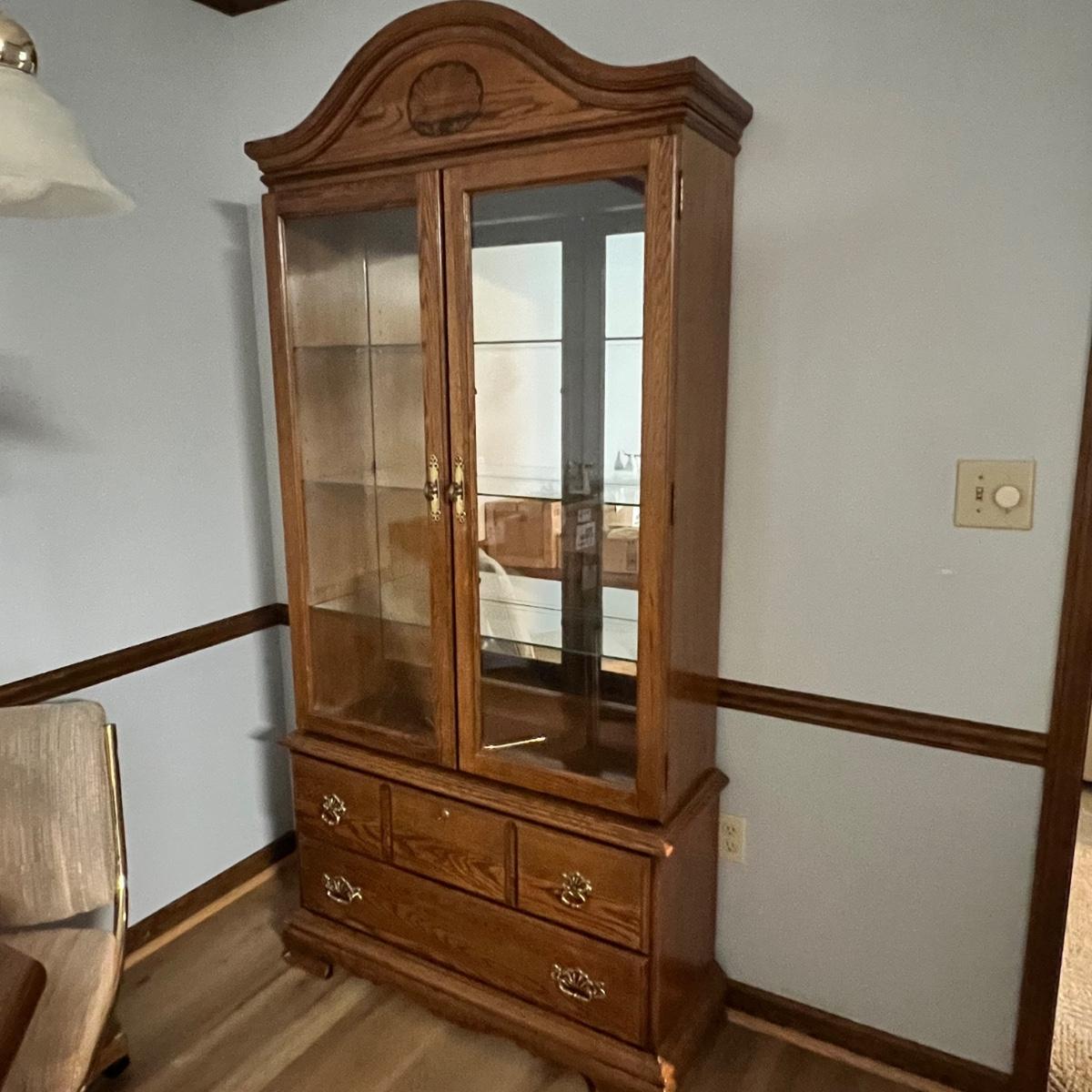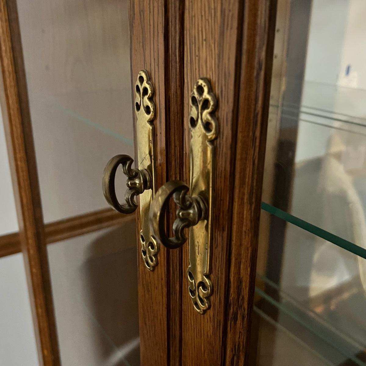 This solid wood display cabinet is two pieces. It’s adjustable and removable glass shelves have plate rails. Comes with key but note that it appears to be missing the locking lever. Note that left door looks hazy in photos but is just a reflection.
