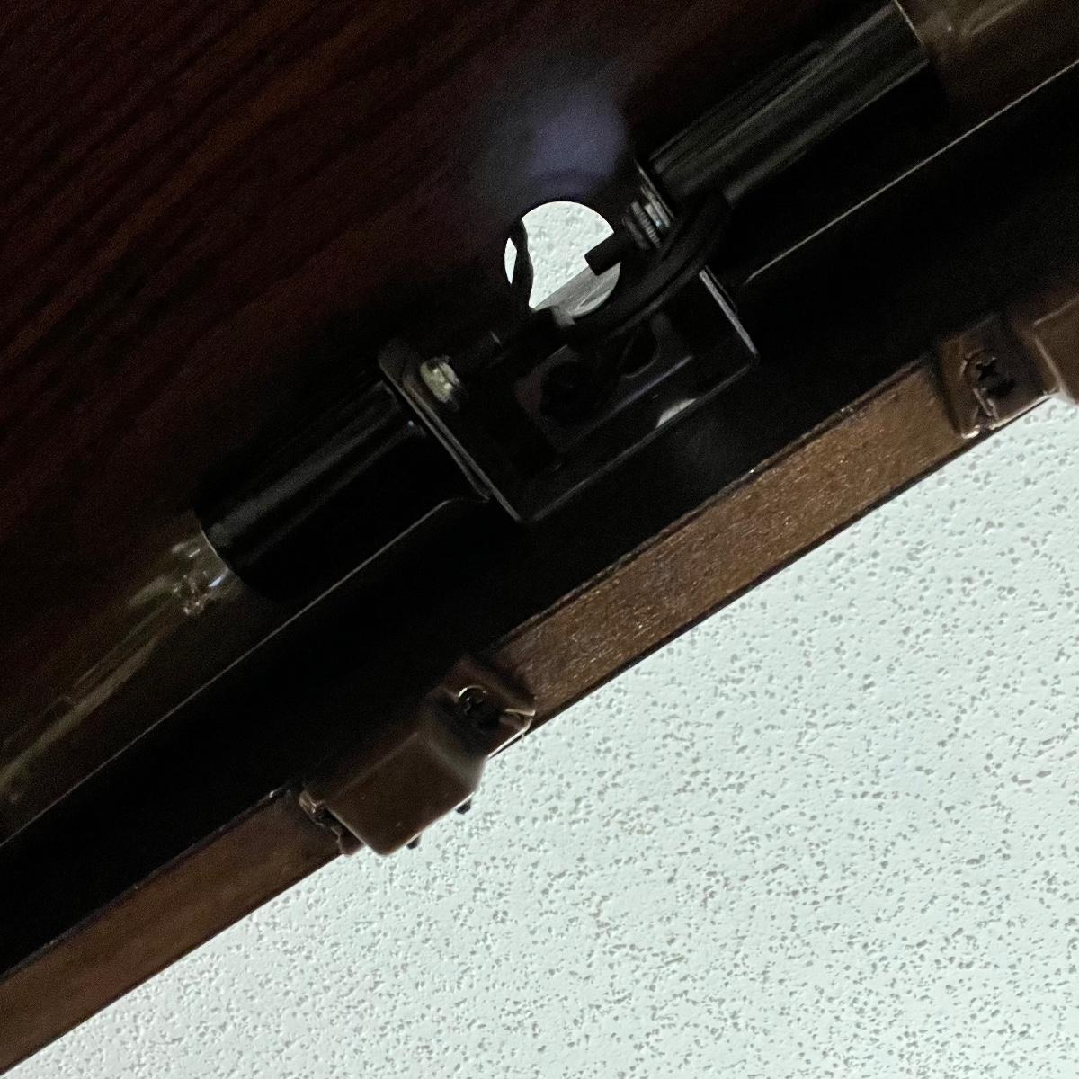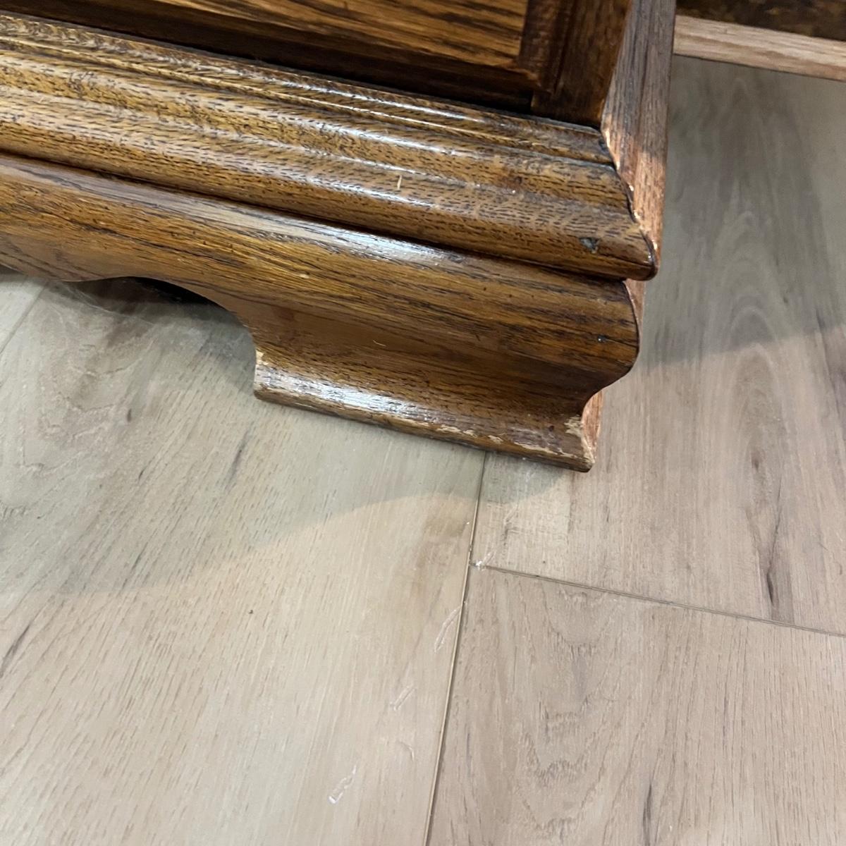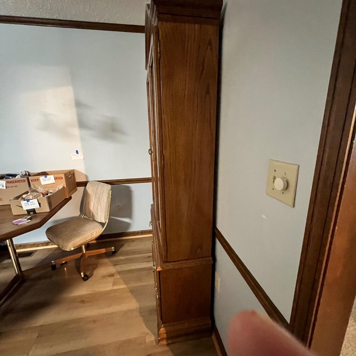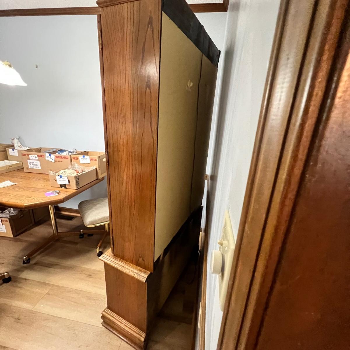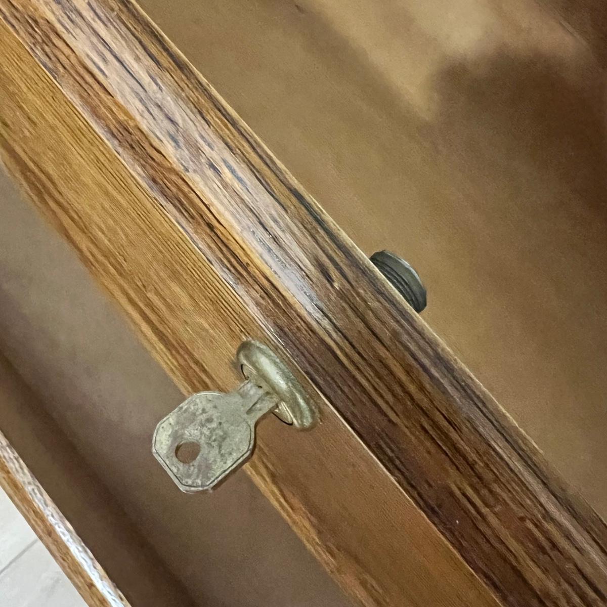 This solid wood display cabinet is two pieces. It’s adjustable and removable glass shelves have plate rails. Comes with key but note that it appears to be missing the locking lever. Note that left door looks hazy in photos but is just a reflection.