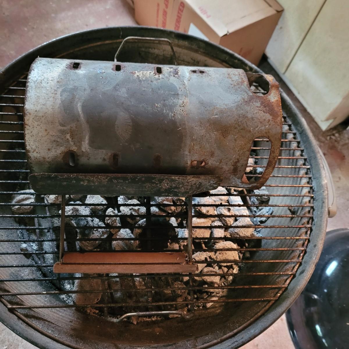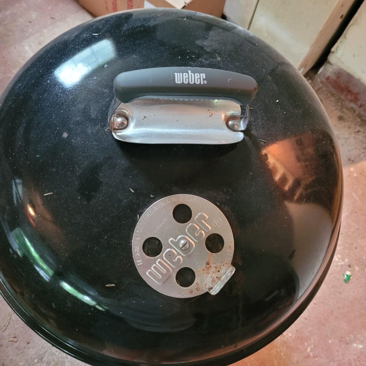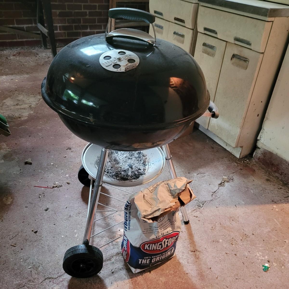 Weber charcoal grill with charcoal chimney starter and a partial bag of charcoal. Grate has buildup but appears to be easily cleanable. Interior of lid has ash build-up but is cleanable. Very little rusting. Grill top measures approximately 23"DIA. Grill without lid measures approximately 24.5"H, with lid 41"H. Local pickup only.