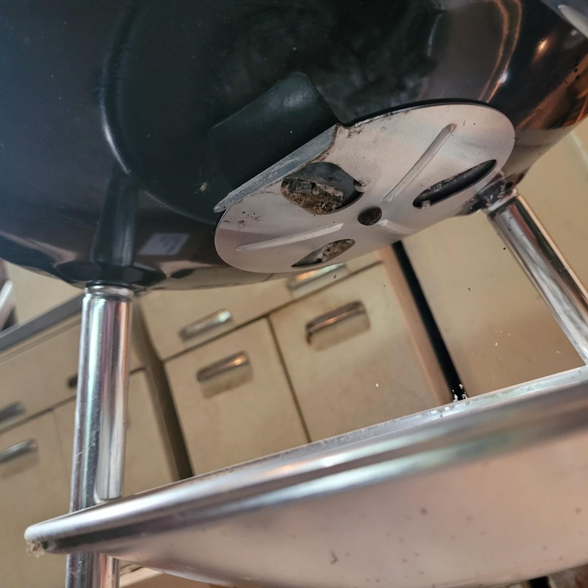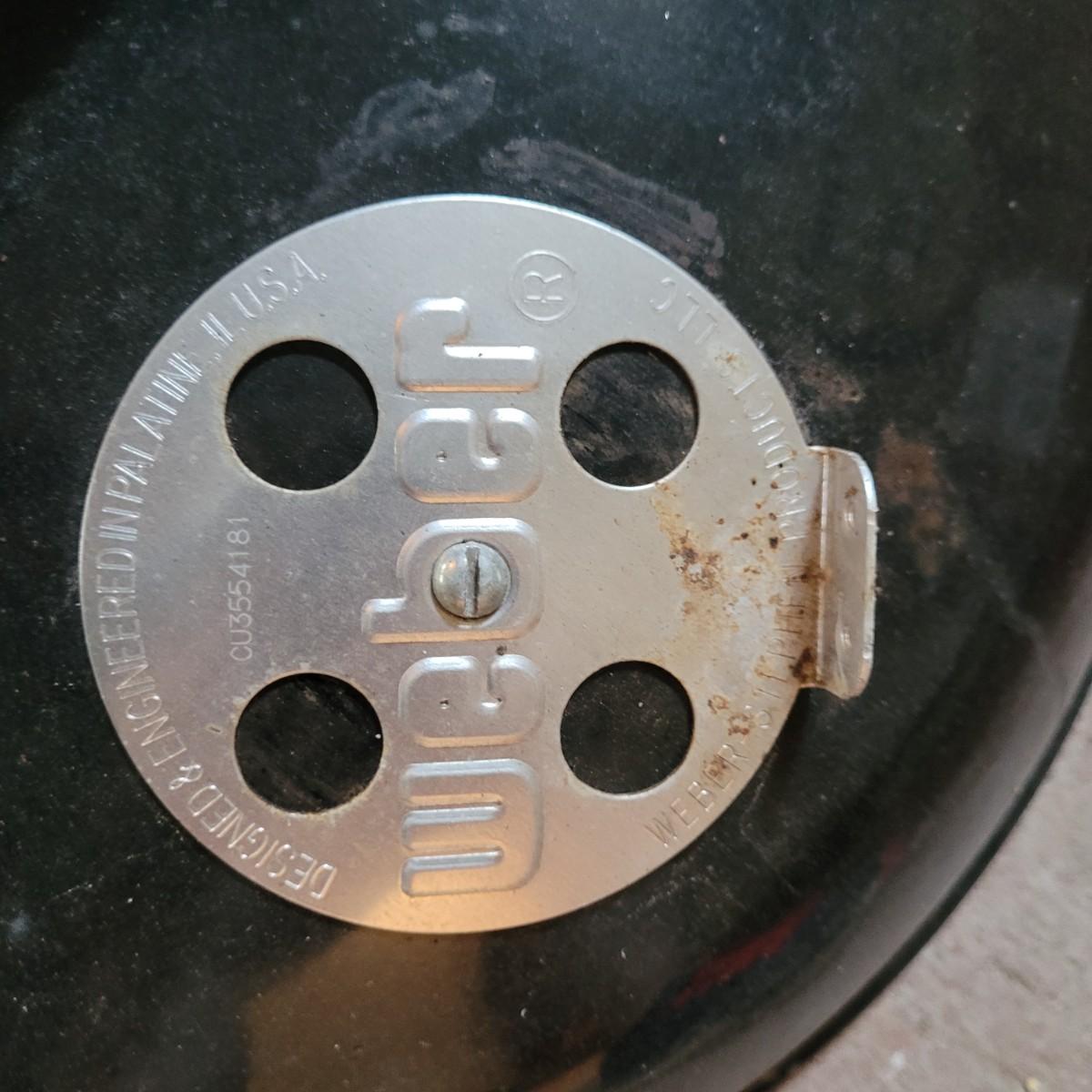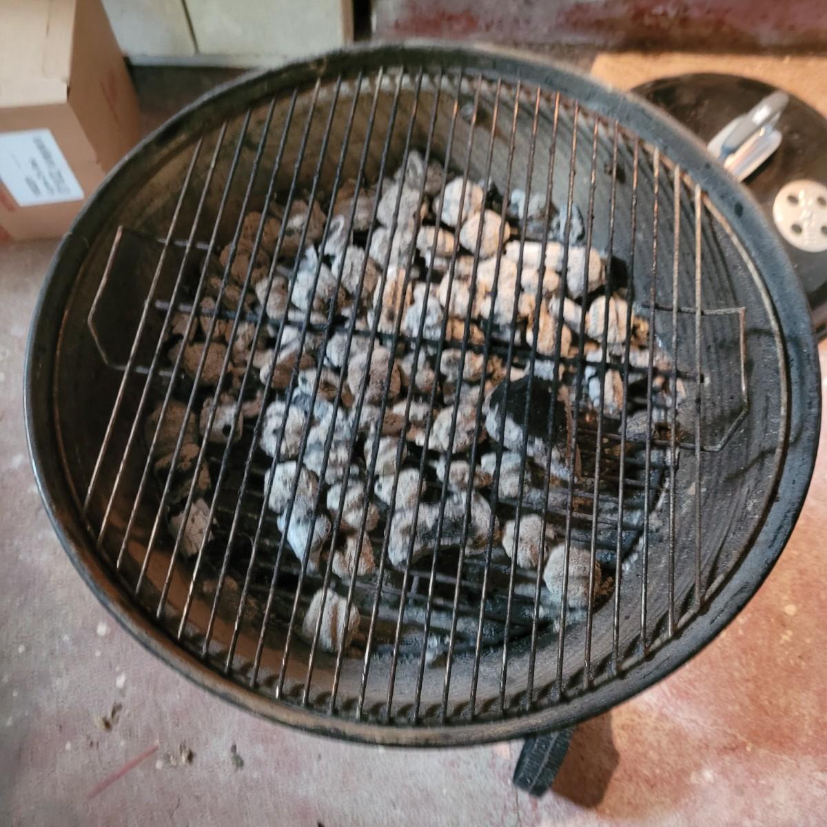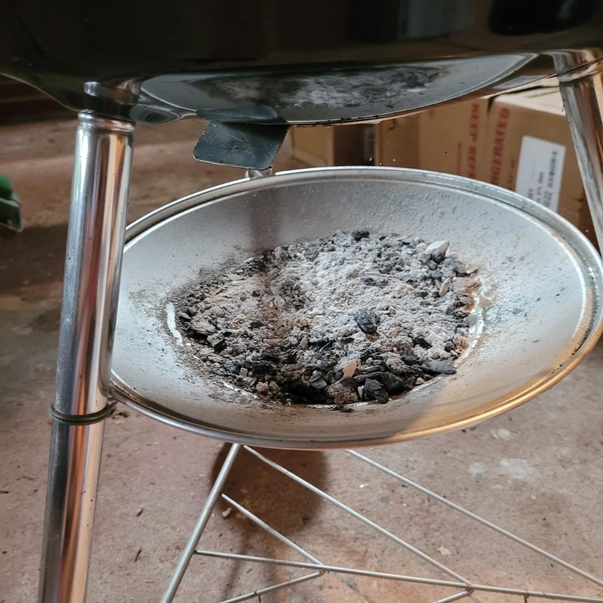 Weber charcoal grill with charcoal chimney starter and a partial bag of charcoal. Grate has buildup but appears to be easily cleanable. Interior of lid has ash build-up but is cleanable. Very little rusting. Grill top measures approximately 23"DIA. Grill without lid measures approximately 24.5"H, with lid 41"H. Local pickup only.