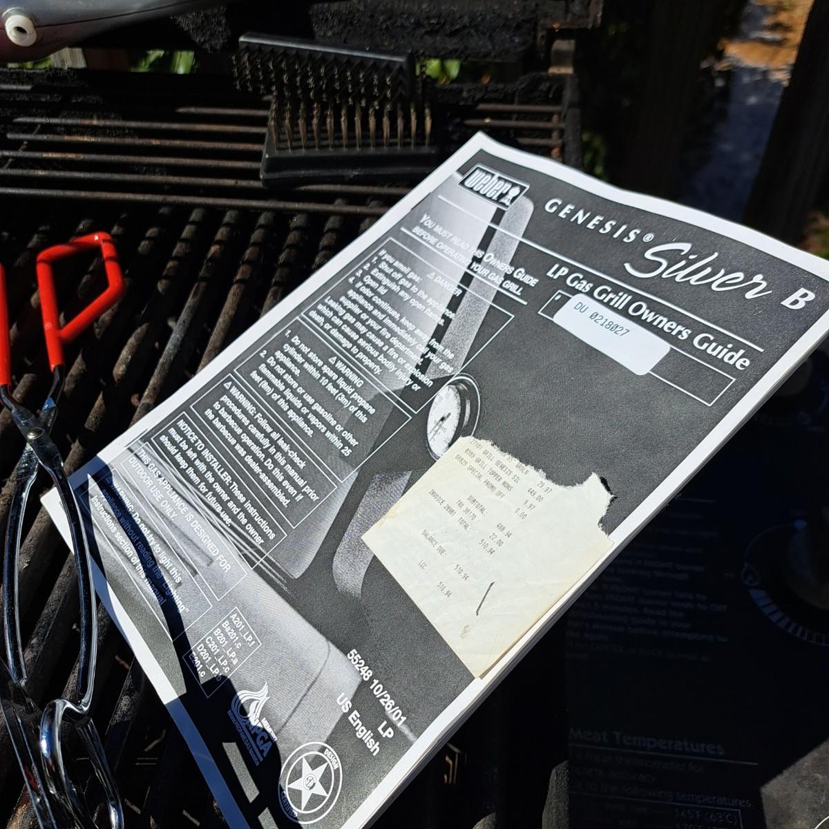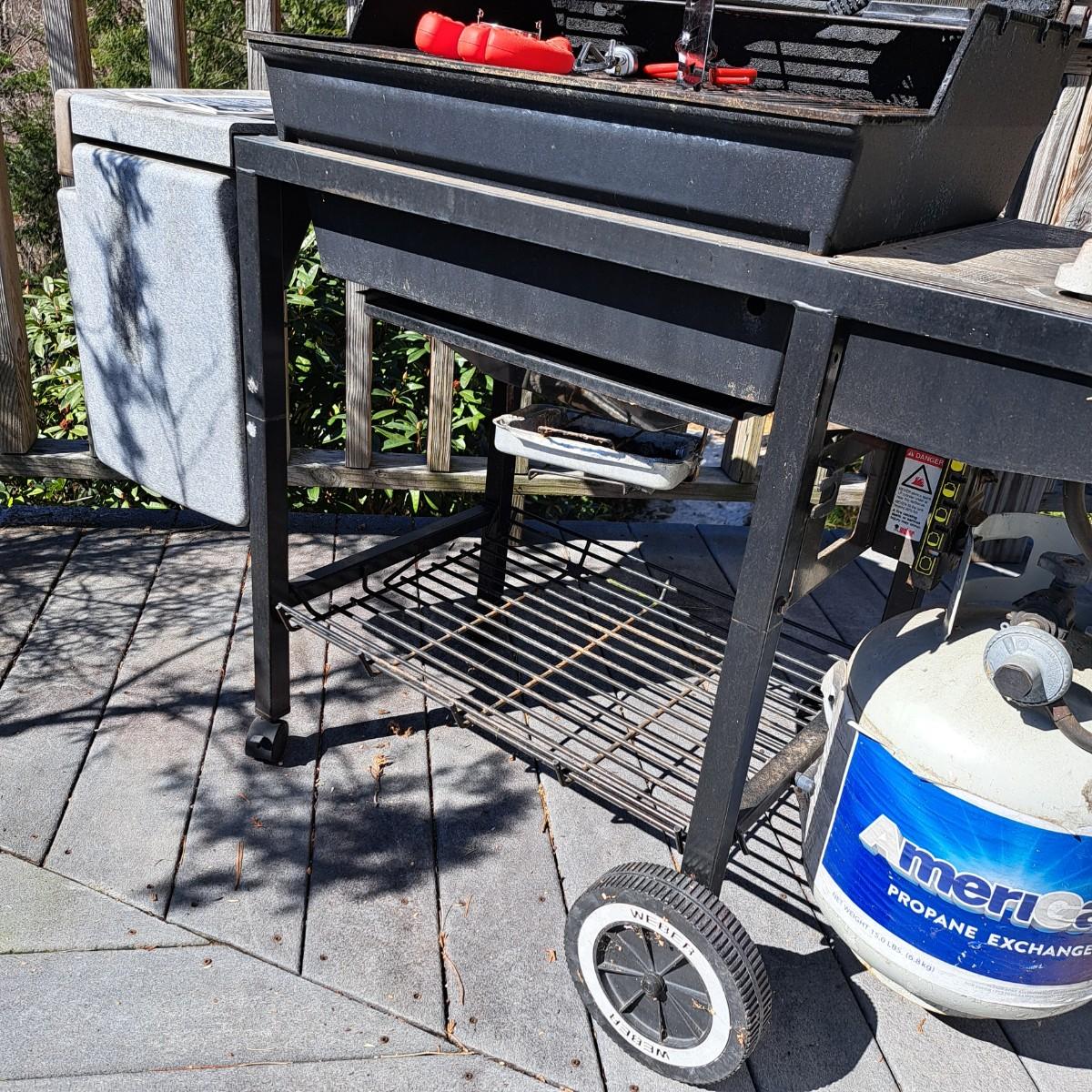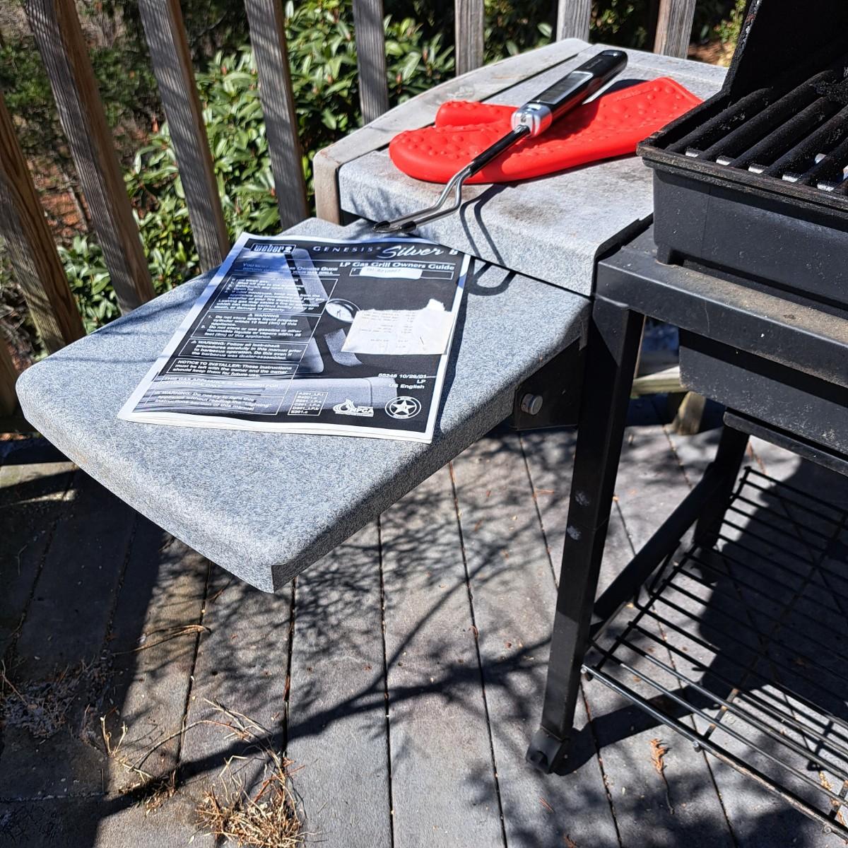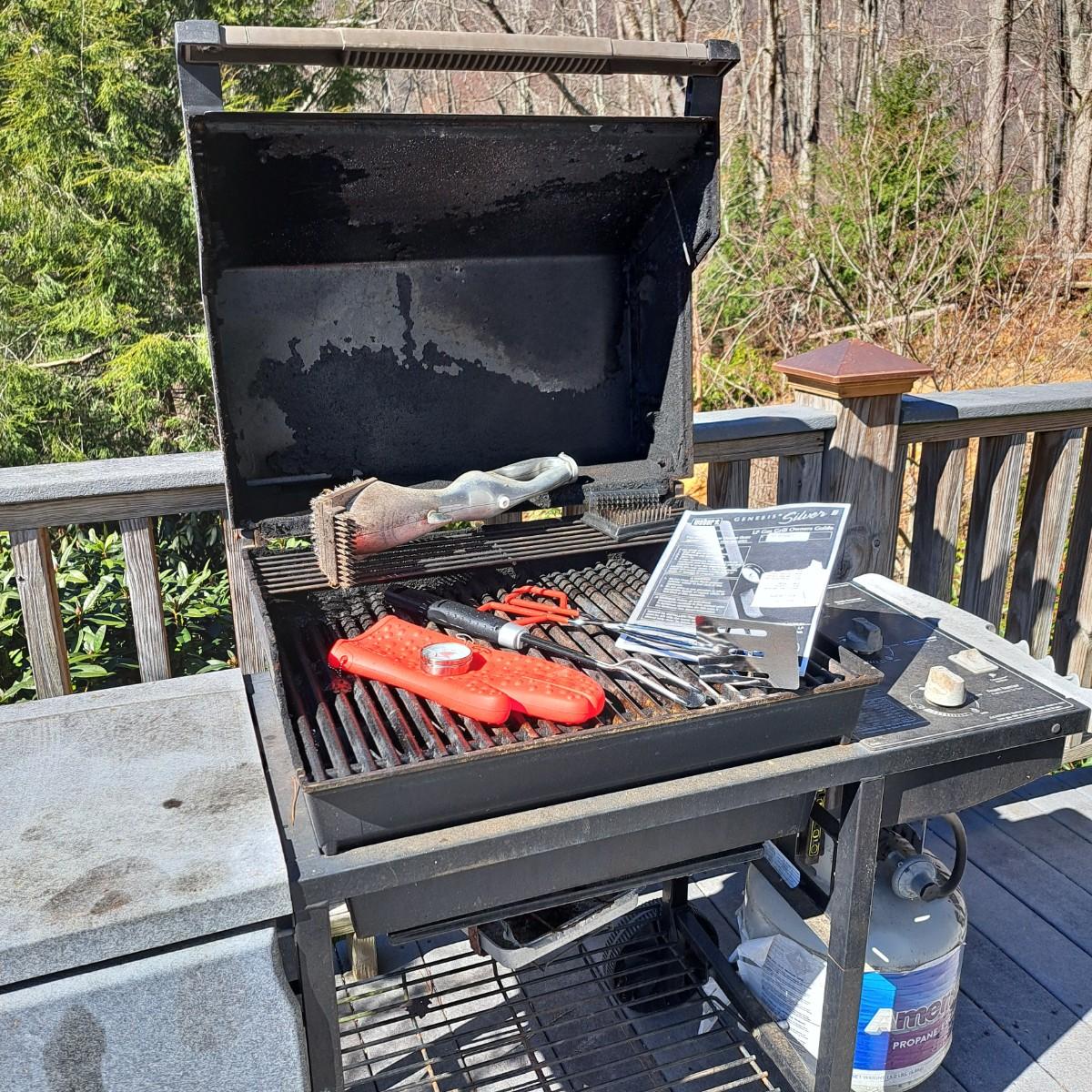 Weber model "Genesis Silver B" propane grill is 51" x 19" x 45"H and comes with a retractable arm/tray at one end for additional grilling space. Is equipped with a crossover ignition system, manual lighting and a meat temperatures adjustment. Plus, a handy equipment holder at end with a grease catcher. Included is a wire brush cleaner with attachments, tongs, fork, spatula thermometer and rubber glove. Complete with owner's manual! Grill is untested and contents of attached propane tank cannot be verified. Grill rack could use a bit of cleaning and there is a bit of creosote build-upon inside of cover. Get those burgers ready! Local pickup only.