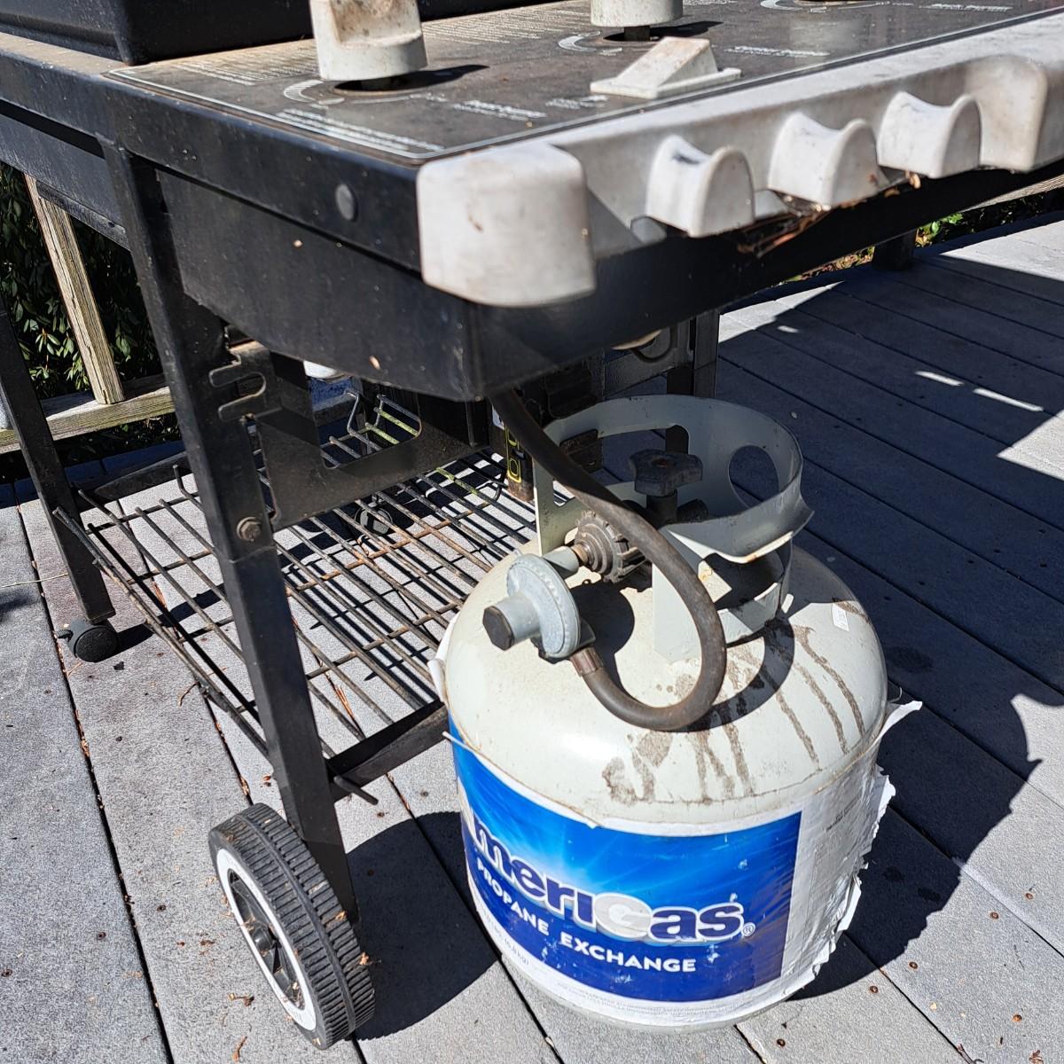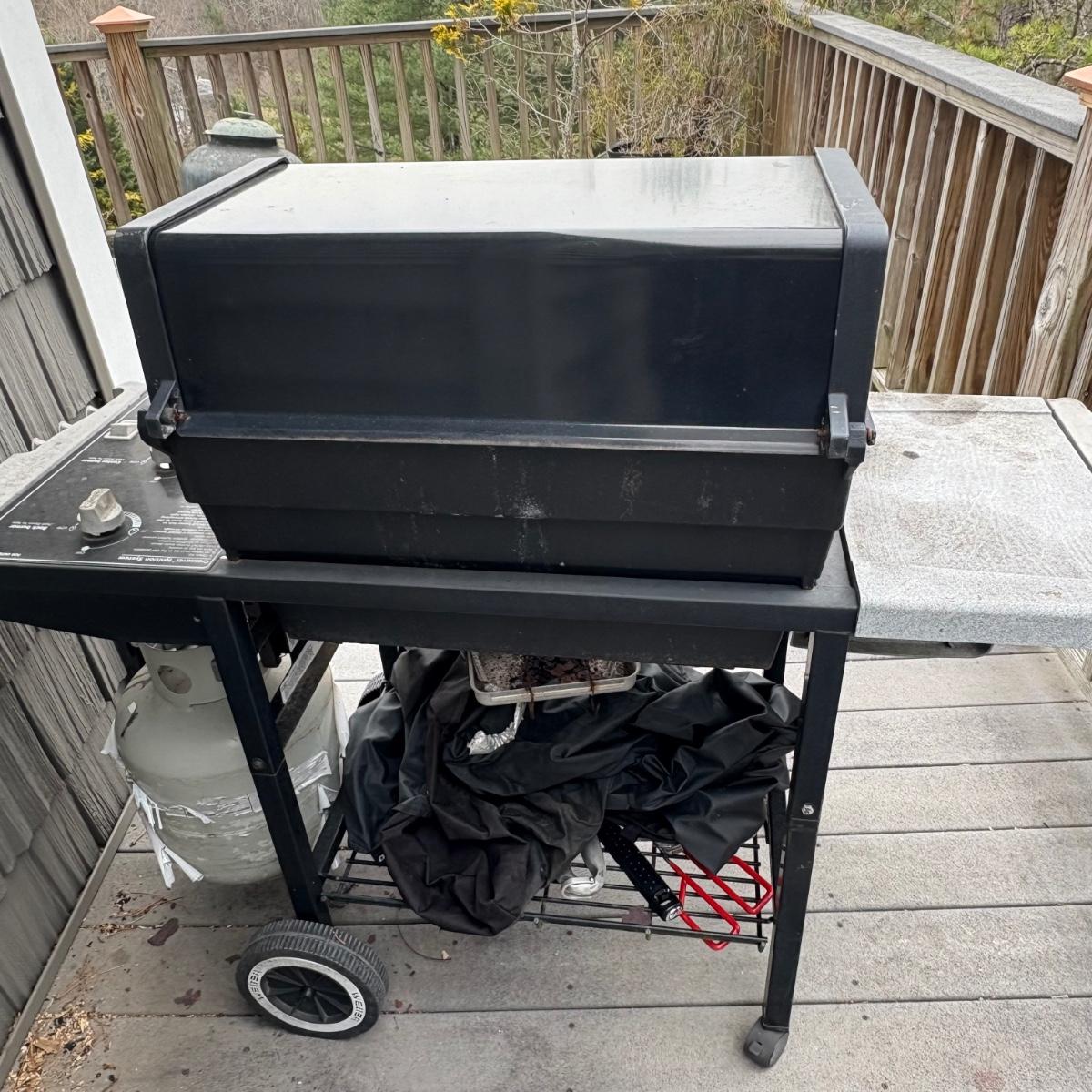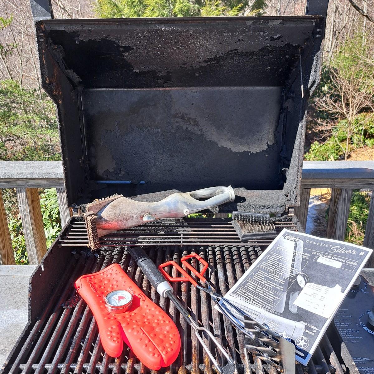 Weber model "Genesis Silver B" propane grill is 51" x 19" x 45"H and comes with a retractable arm/tray at one end for additional grilling space. Is equipped with a crossover ignition system, manual lighting and a meat temperatures adjustment. Plus, a handy equipment holder at end with a grease catcher. Included is a wire brush cleaner with attachments, tongs, fork, spatula thermometer and rubber glove. Complete with owner's manual! Grill is untested and contents of attached propane tank cannot be verified. Grill rack could use a bit of cleaning and there is a bit of creosote build-upon inside of cover. Get those burgers ready! Local pickup only.