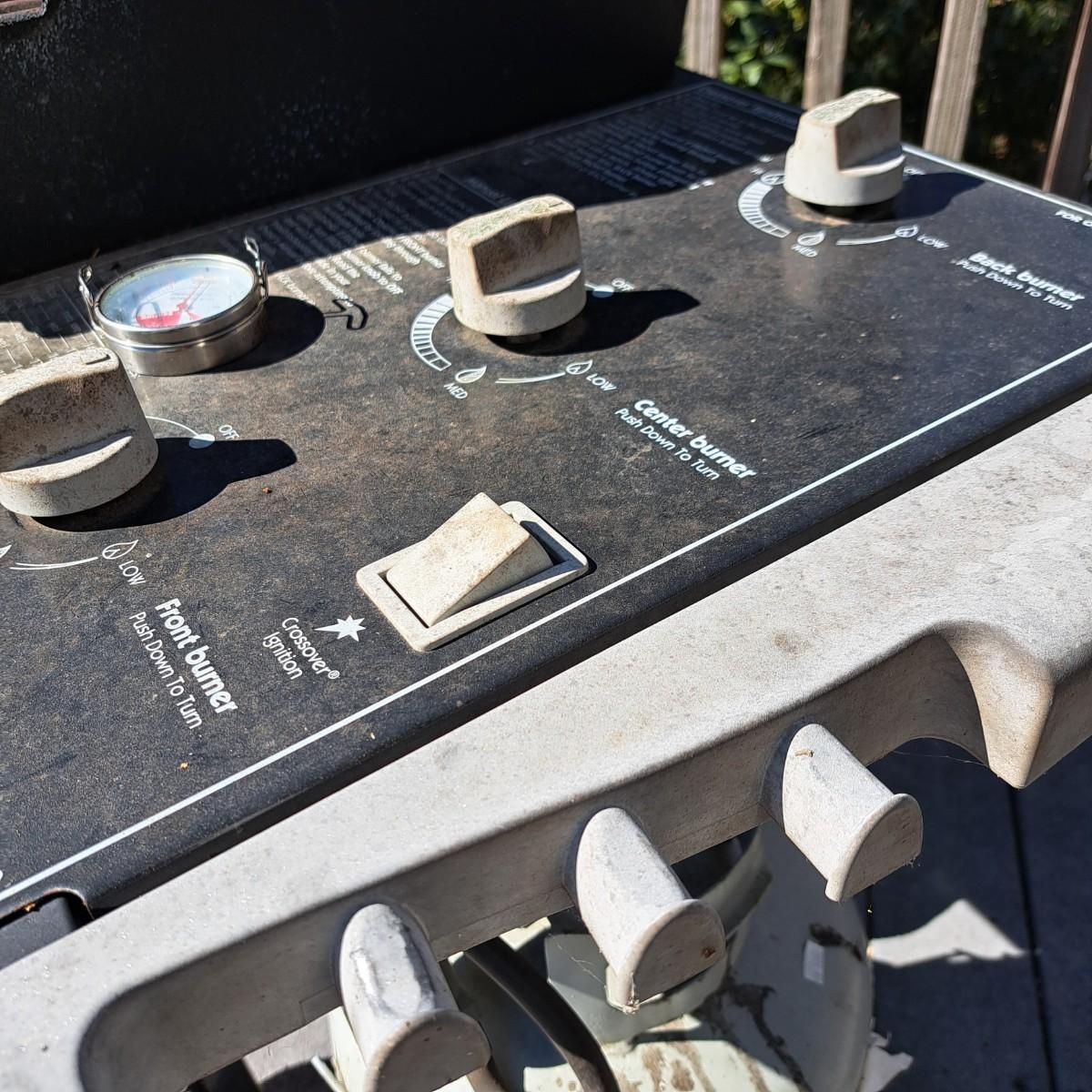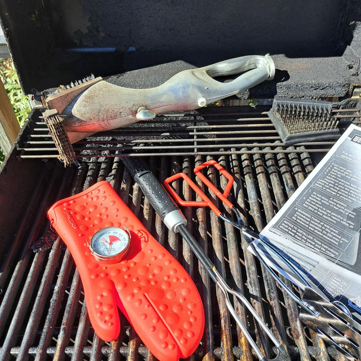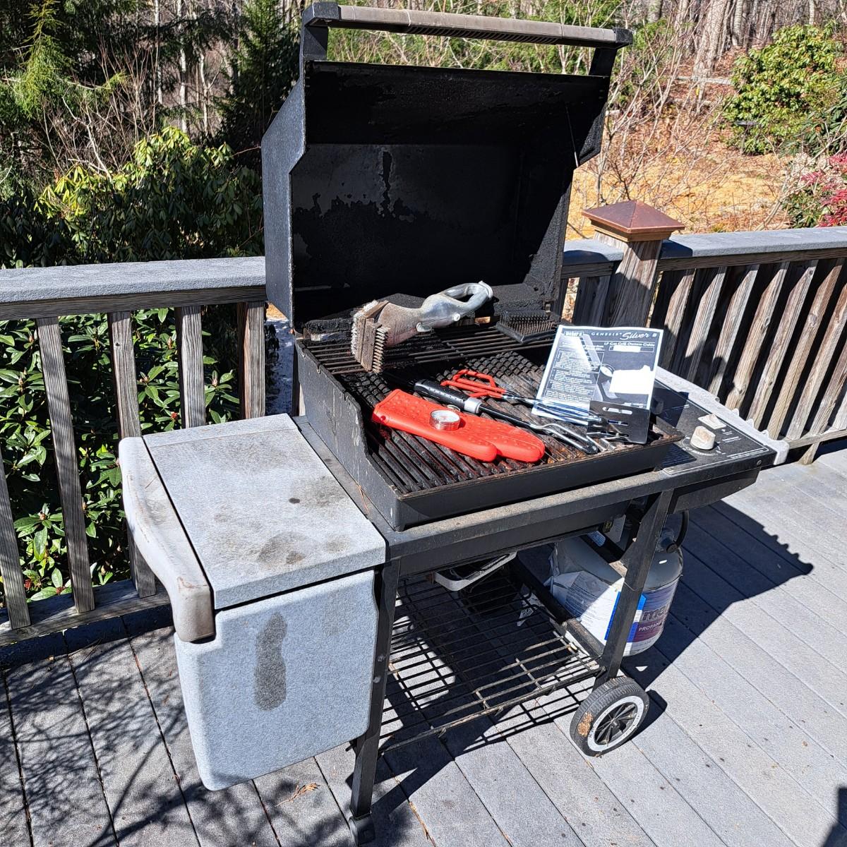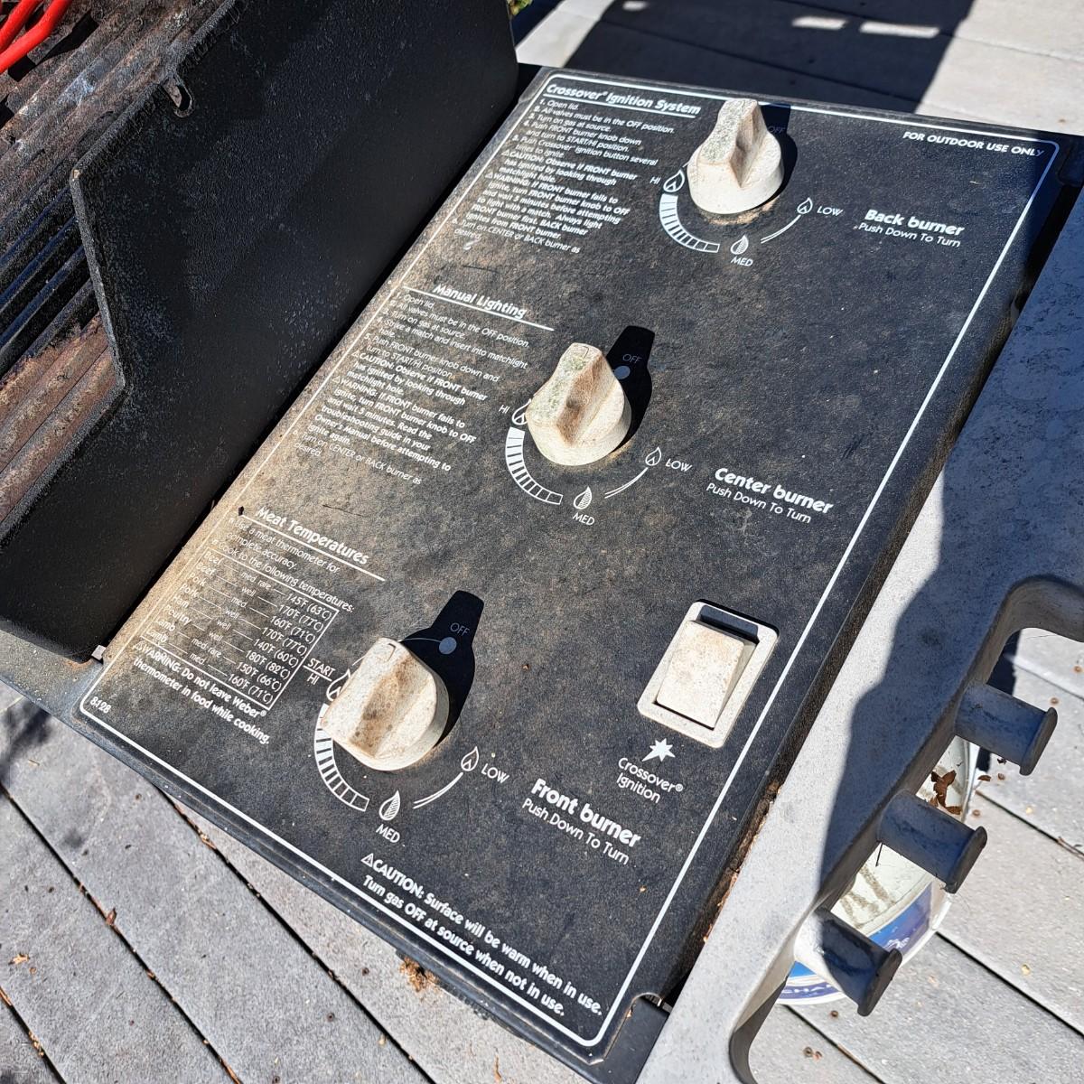 Weber model "Genesis Silver B" propane grill is 51" x 19" x 45"H and comes with a retractable arm/tray at one end for additional grilling space. Is equipped with a crossover ignition system, manual lighting and a meat temperatures adjustment. Plus, a handy equipment holder at end with a grease catcher. Included is a wire brush cleaner with attachments, tongs, fork, spatula thermometer and rubber glove. Complete with owner's manual! Grill is untested and contents of attached propane tank cannot be verified. Grill rack could use a bit of cleaning and there is a bit of creosote build-upon inside of cover. Get those burgers ready! Local pickup only.