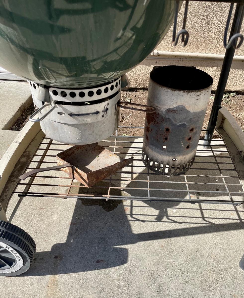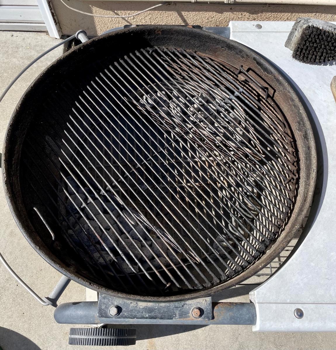 Webber kettle-style steel BBQ with bottom damper for regulating heat. Coals can be banked in 2 side compartments to allow center area of grill to be used to keep food warm. Accessories include BBQ gloves, lighter, grill cleaning brushes, metal ash pan, and Weber cookbook.