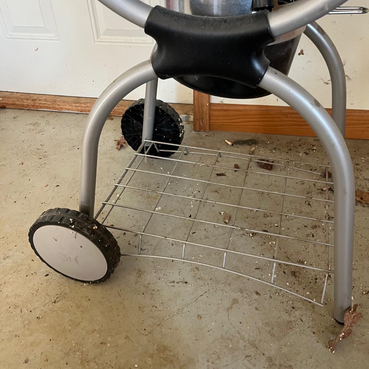 Lot includes a Weber One Touch Platinum charcoal grill and a Blue Rhino stainless grilling basket with removable handle. Grill appears to be in good condition, it is dirty and has used charcoal inside. Cart and grill measure 24” x 50” x 41”.