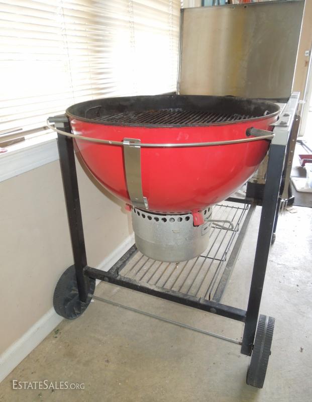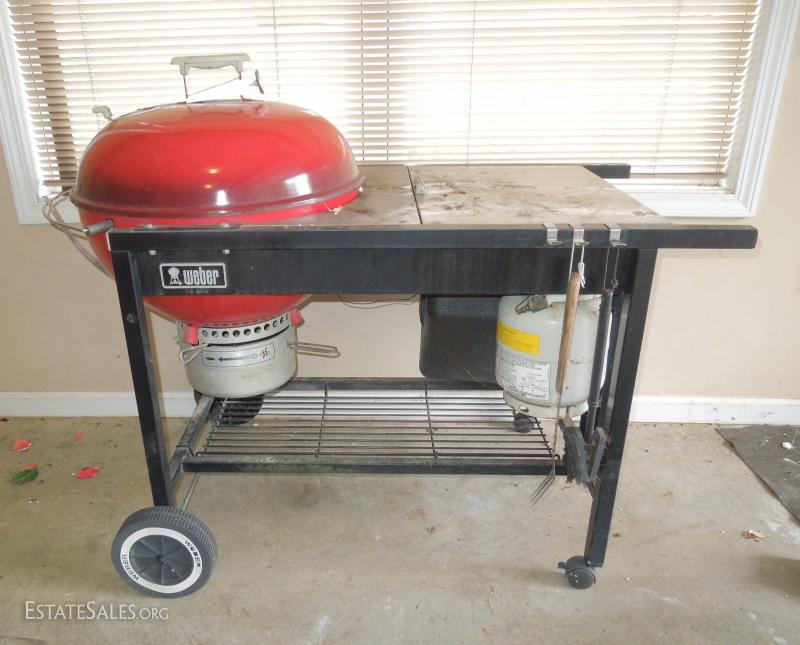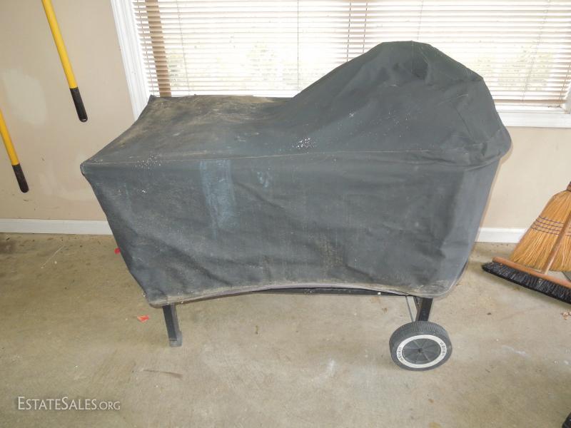 48x30x25 portable grill. Charcoal kettle is made of enameled porcelain. There is a small chip on lip. Surface is stainless and the legs and frame are painted metal. Needs cleaning. Cover has stiffened and is cracking in spots as shown in photo. 2 propane tanks.