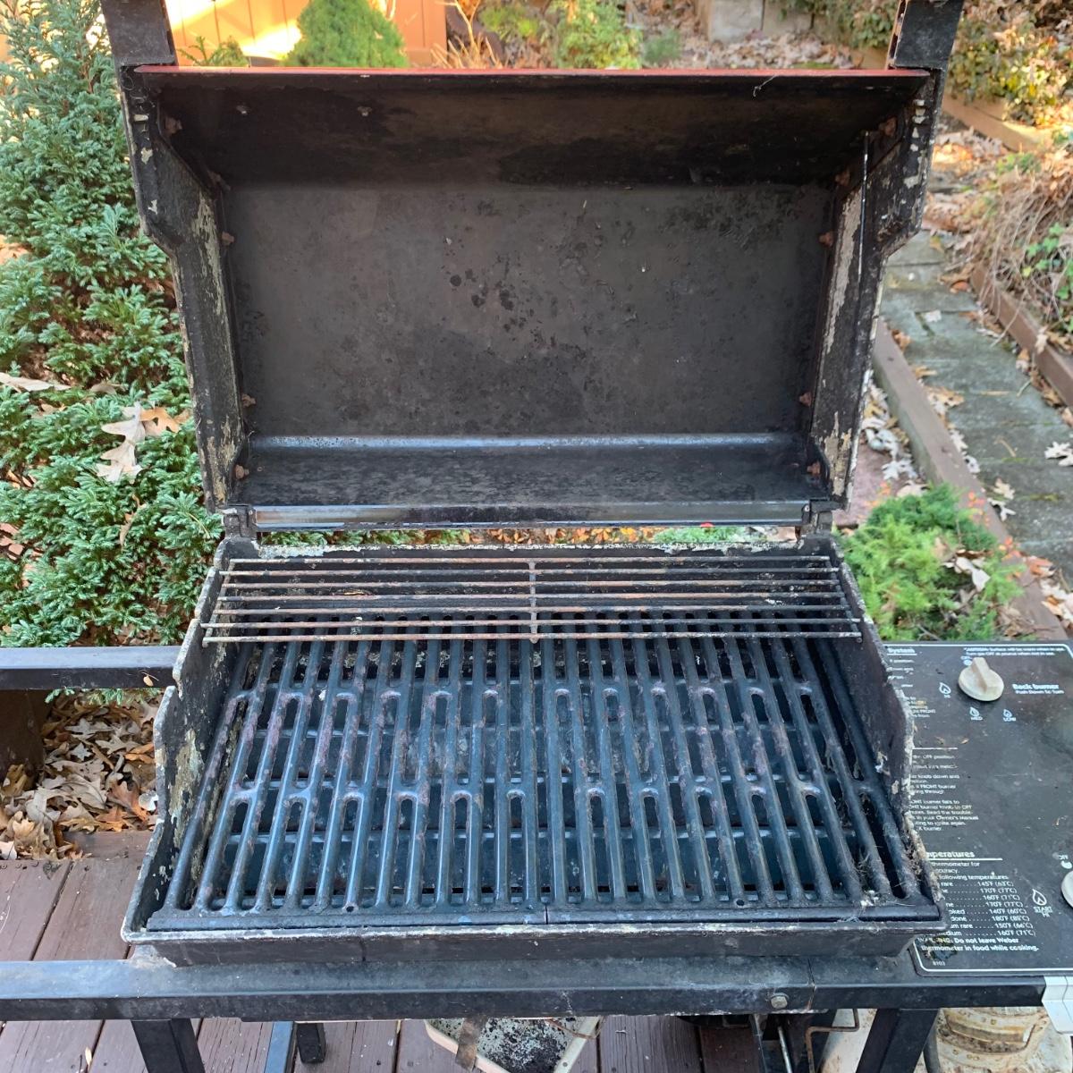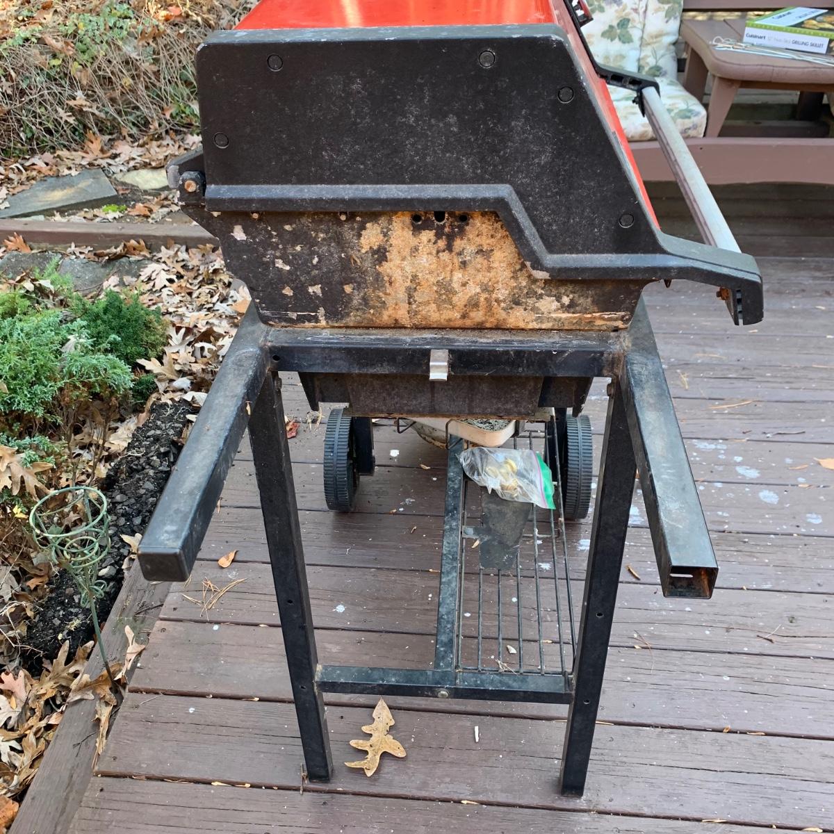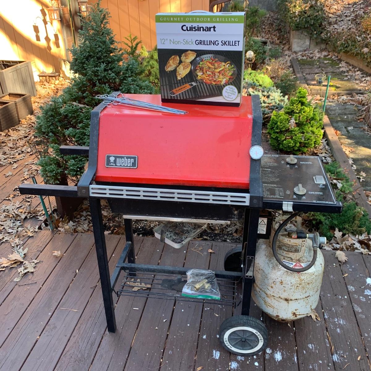 Weber grill with cover, 14 metal skewers, and a Cuisinart 12” Non-Stick Grilling Skillet that is new in its box. Weber grill is propane fueled. It has a red enamel lid. Grill measures approximately 46” x 22” x 40”H. There is a bit of rust throughout and the inside will require a deep cleaning. The cover is very dirty. There is a propane tank attached but its contents are not guaranteed. Unable to test grill; please come to preview to test functionality.