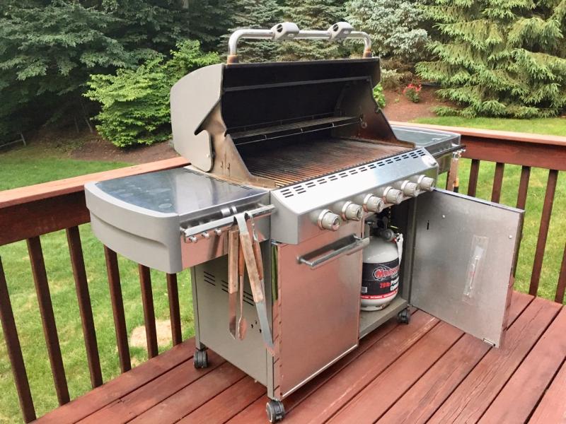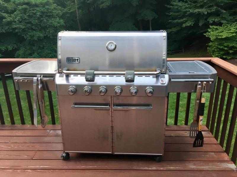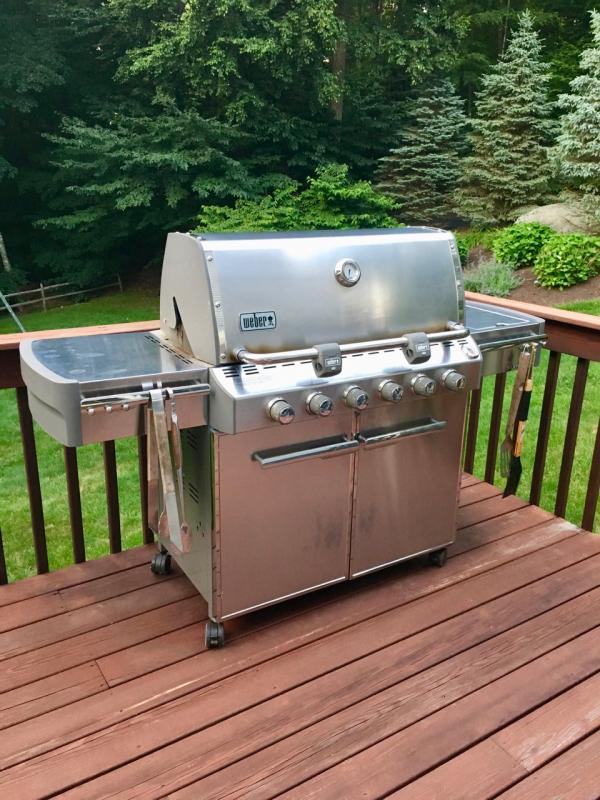 Weber Summit S620 Gas Grill SS LP. The Weber Summit is great for your outdoor grilling needs with it's 6 burners, Capacity is 693-square-inch primary cooking area and 145-square-inch warming rack for 838 square-inch total cooking area. Comes with fully enclosed stainless steel cart and porcelain-enameled cooking grates. Includes 2 heavy-duty front locking casters and 2 heavy-duty back swivel casters; 60,000 BTU per hour input. Original purchase price in 2011 was $1,700. Also includes cover & tank. ***CONDITION: Very Good, needs cleaning*** Local pick up only, Newtown CT ***VERY HEAVY***