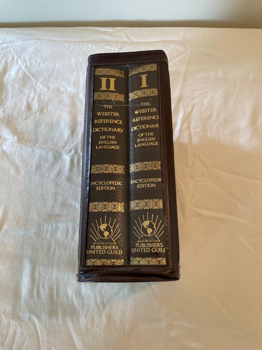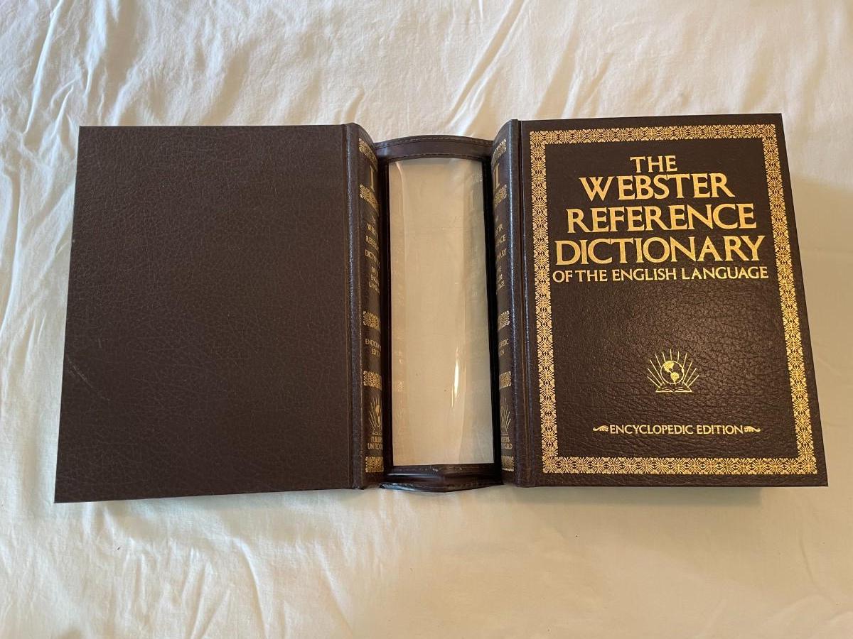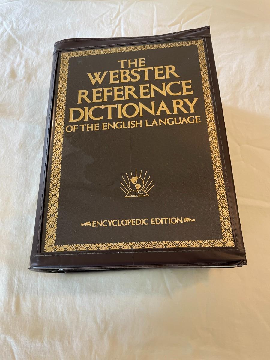 The Webster Reference Dictionary of the English Language, Encyclopedic Edition, features a hardcover design with detailed gold embossing on the cover. The dictionary is designed to serve as a comprehensive reference tool. C