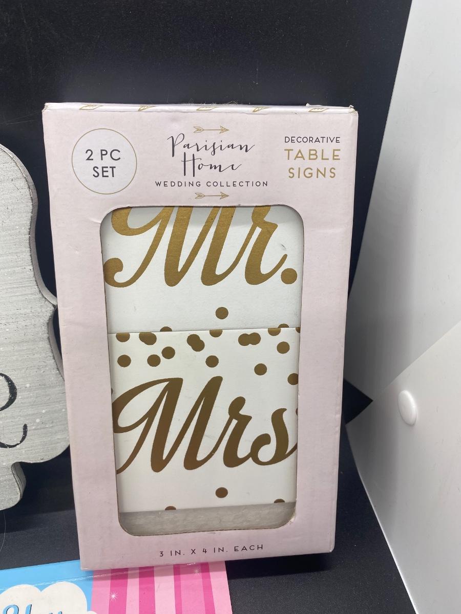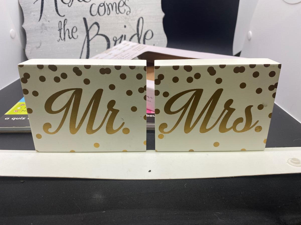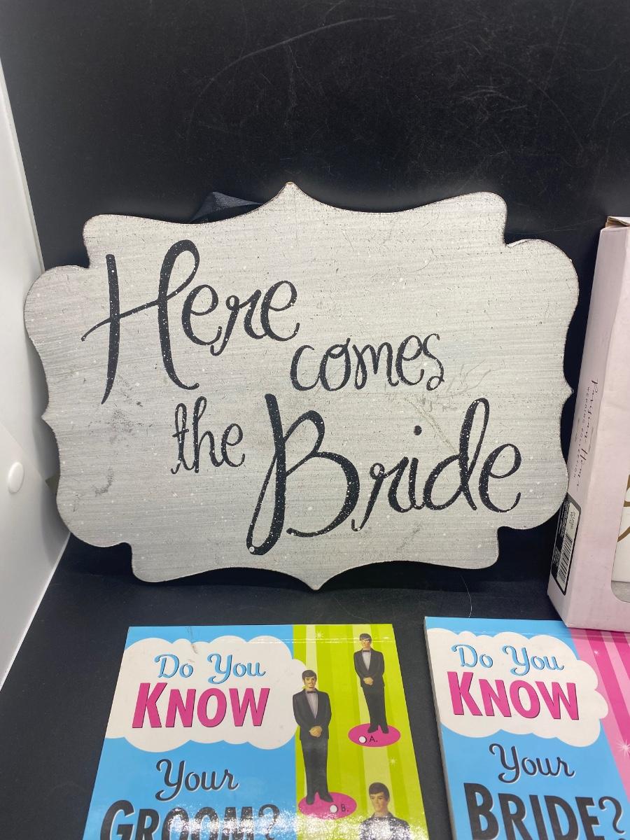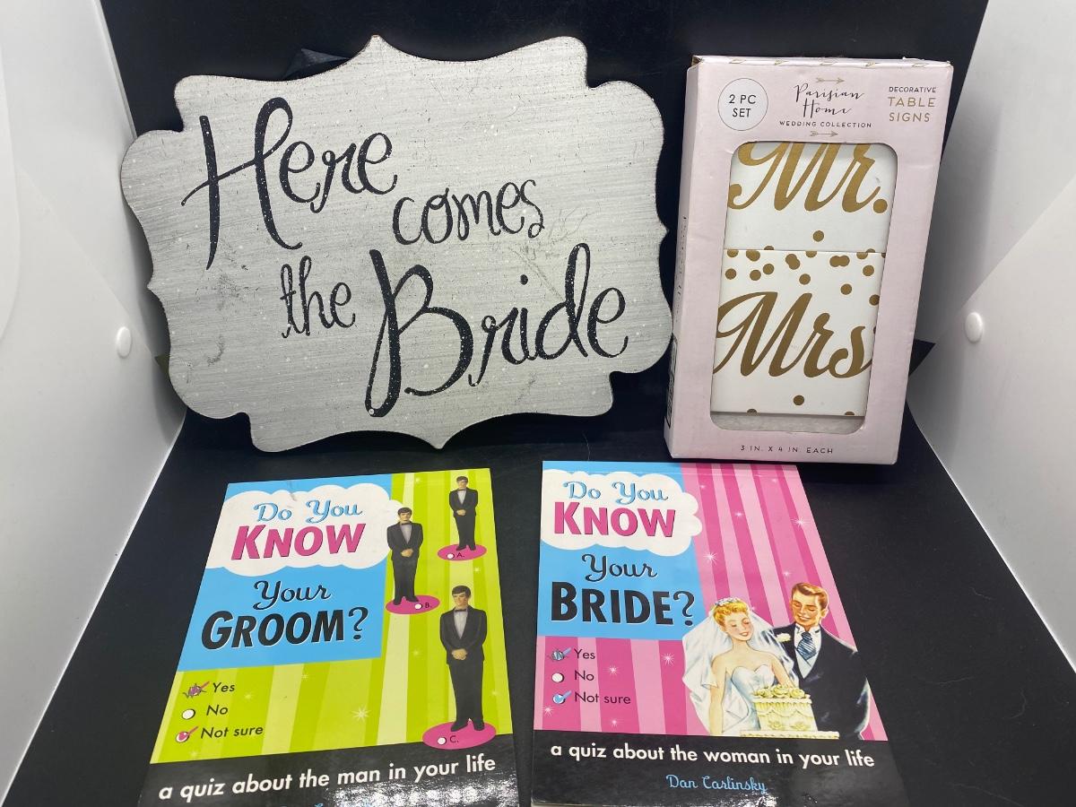 Variety of wedding related items. Here comes the bride wall sign, Mr. & Mrs. wood block table signs, and Pair of Do You Know quiz books. All are in good unused condition.