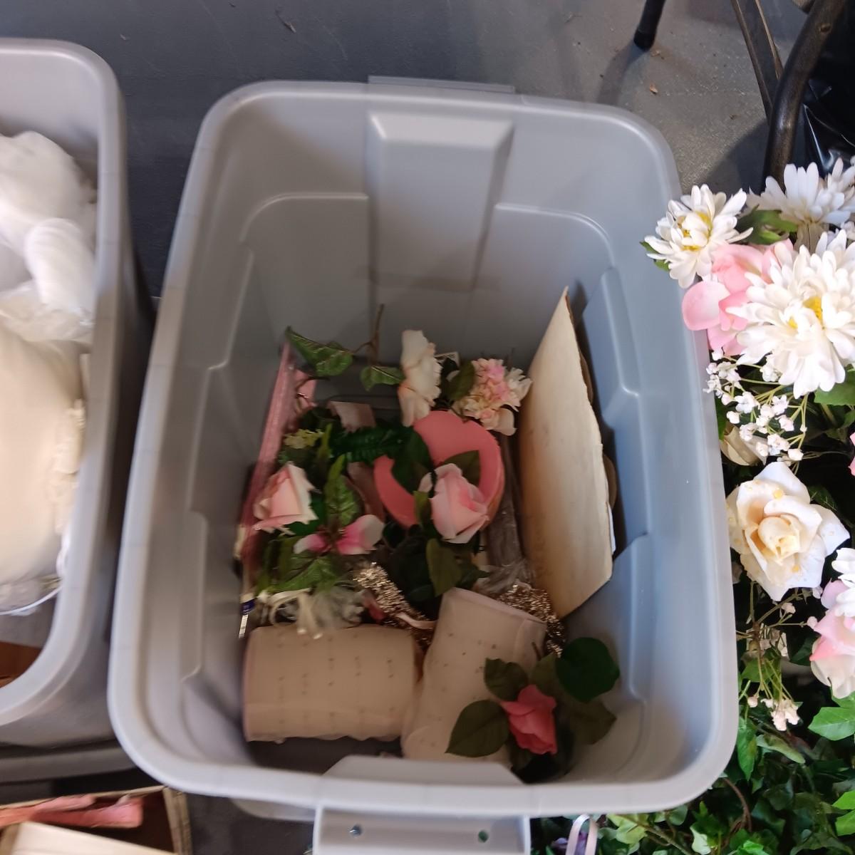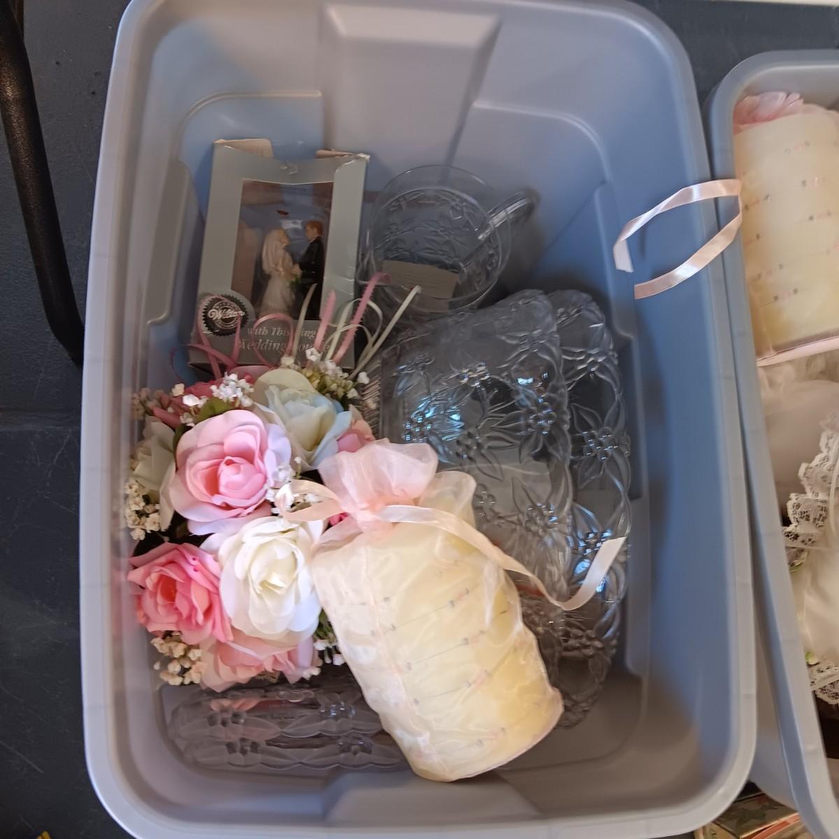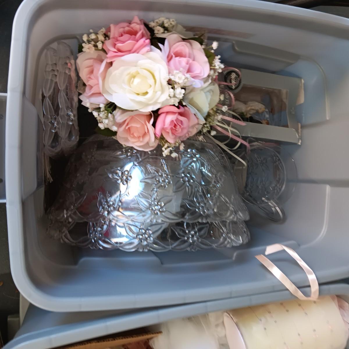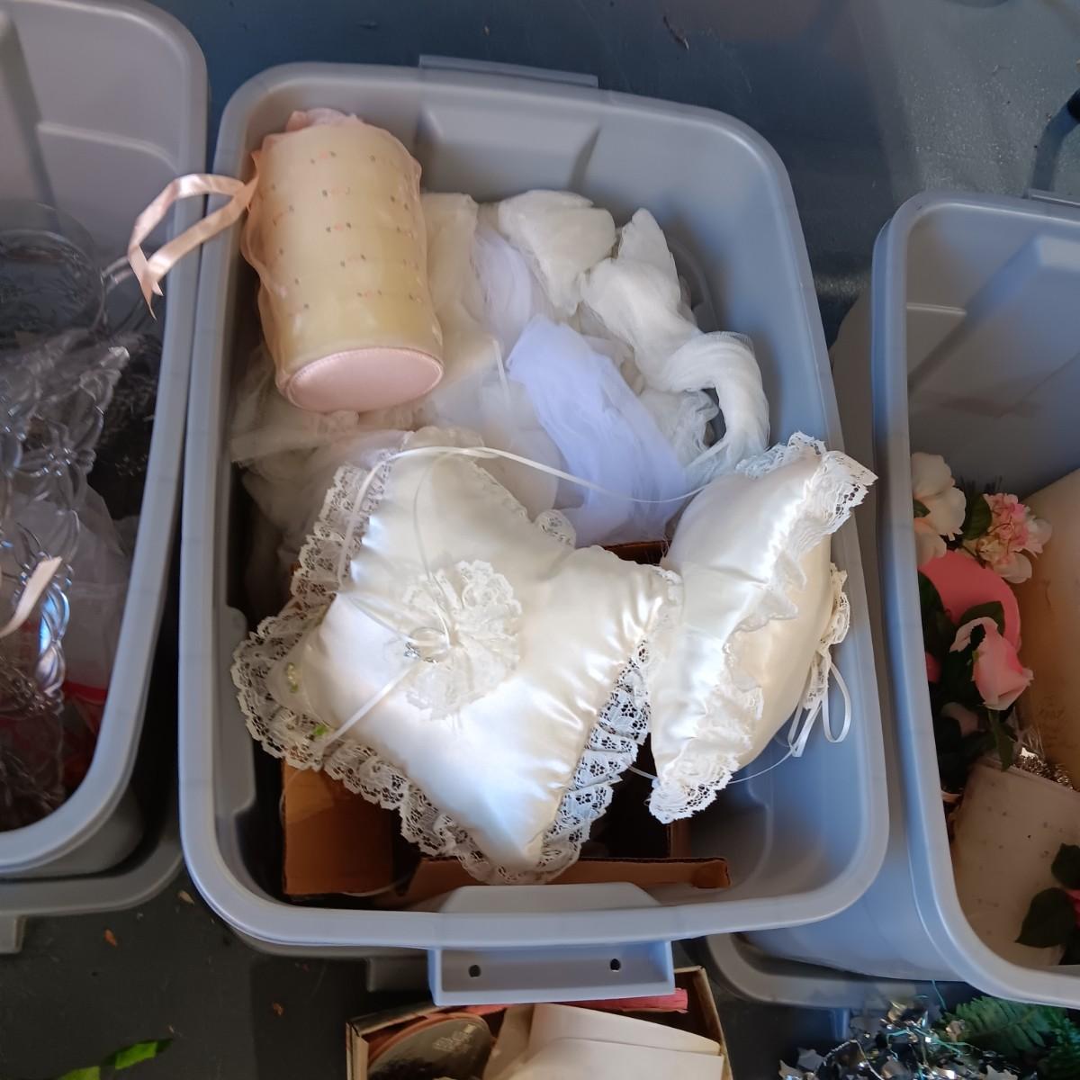 WEDDING DECORATIONS AND 3 STORAGE CONTAINERS
