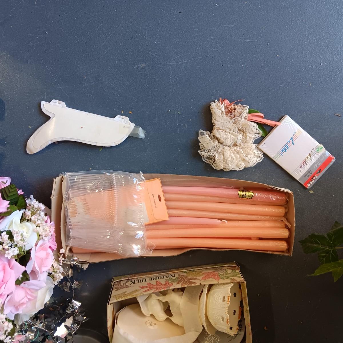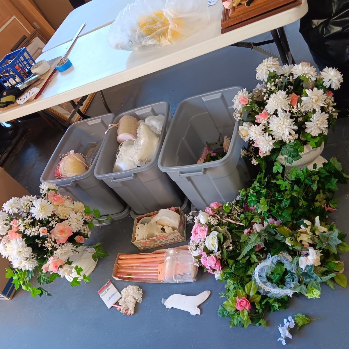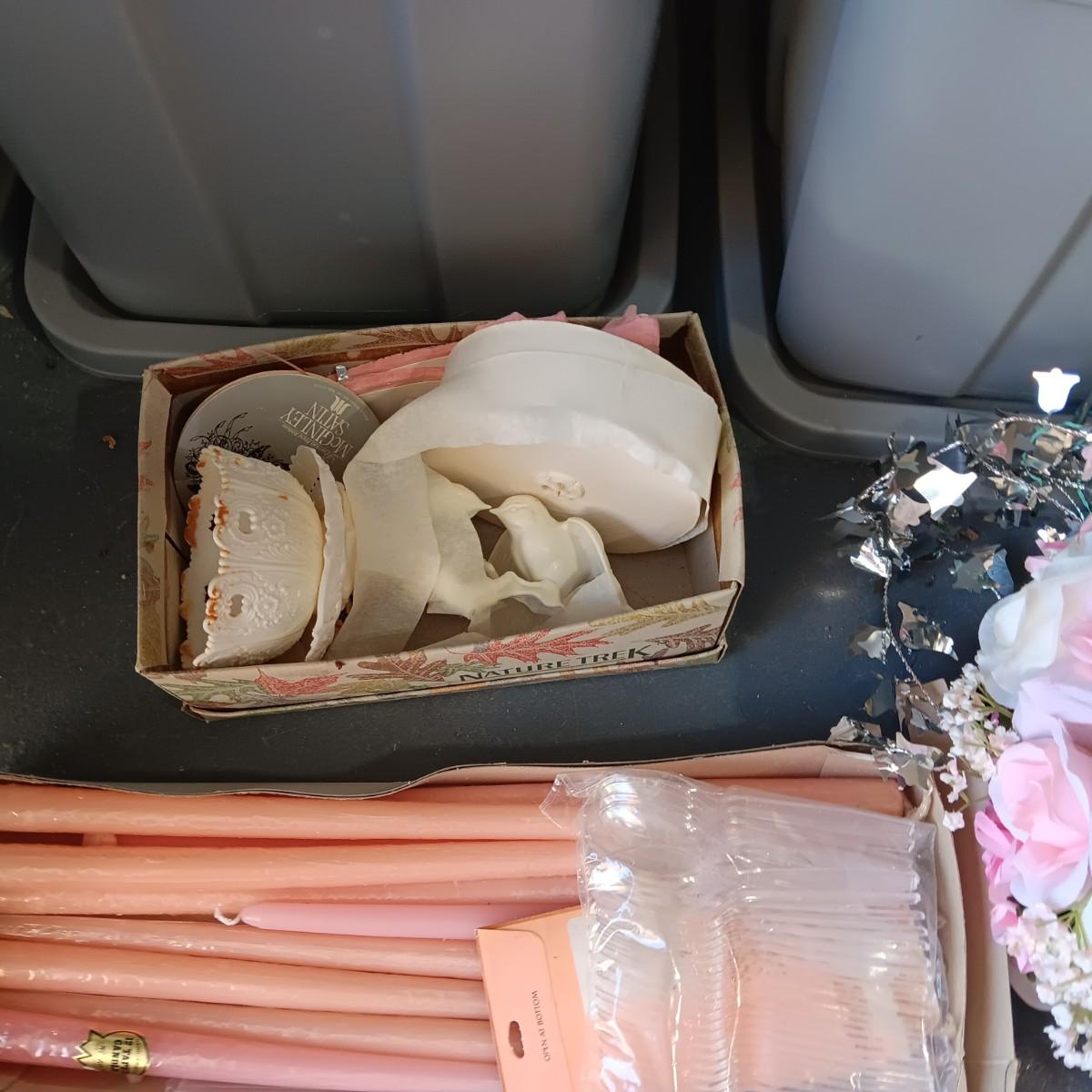 WEDDING DECORATIONS AND 3 STORAGE CONTAINERS