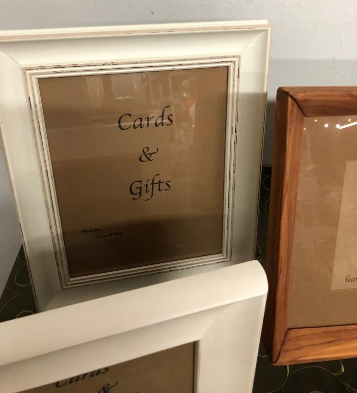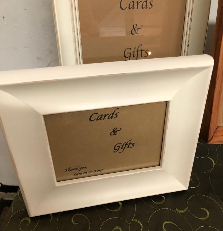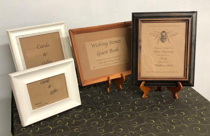 To help organize the wedding in frames..signs that read..Cards and Gifts..Wishing Stones..Guest Book..and Honey 4...Excellent condition....