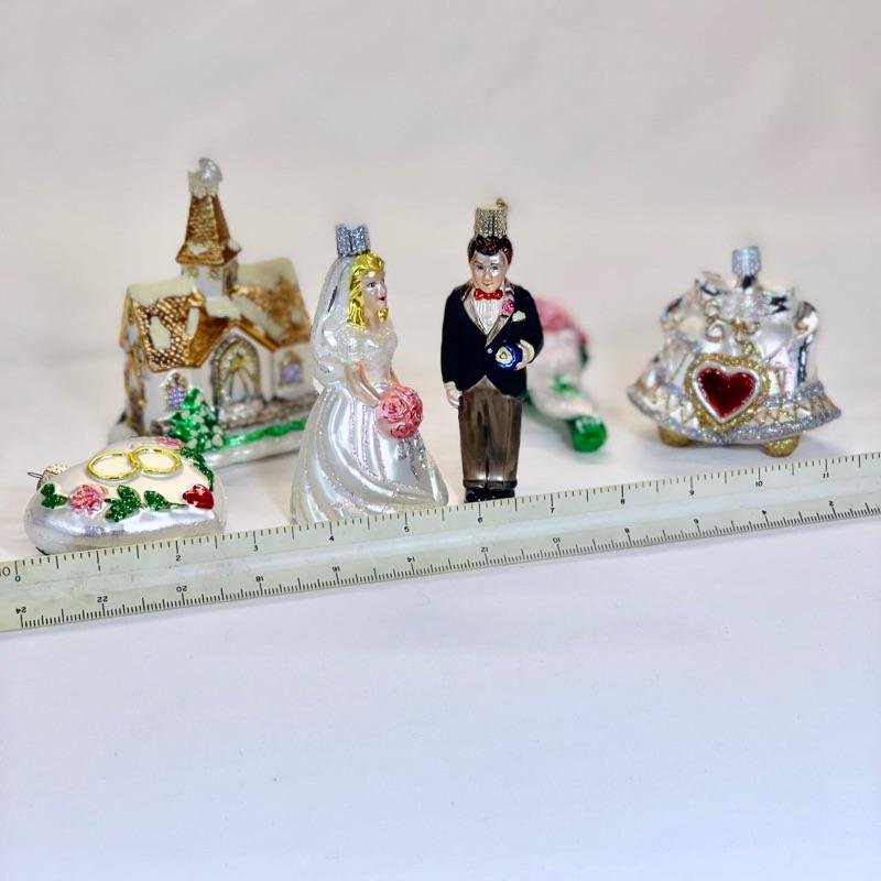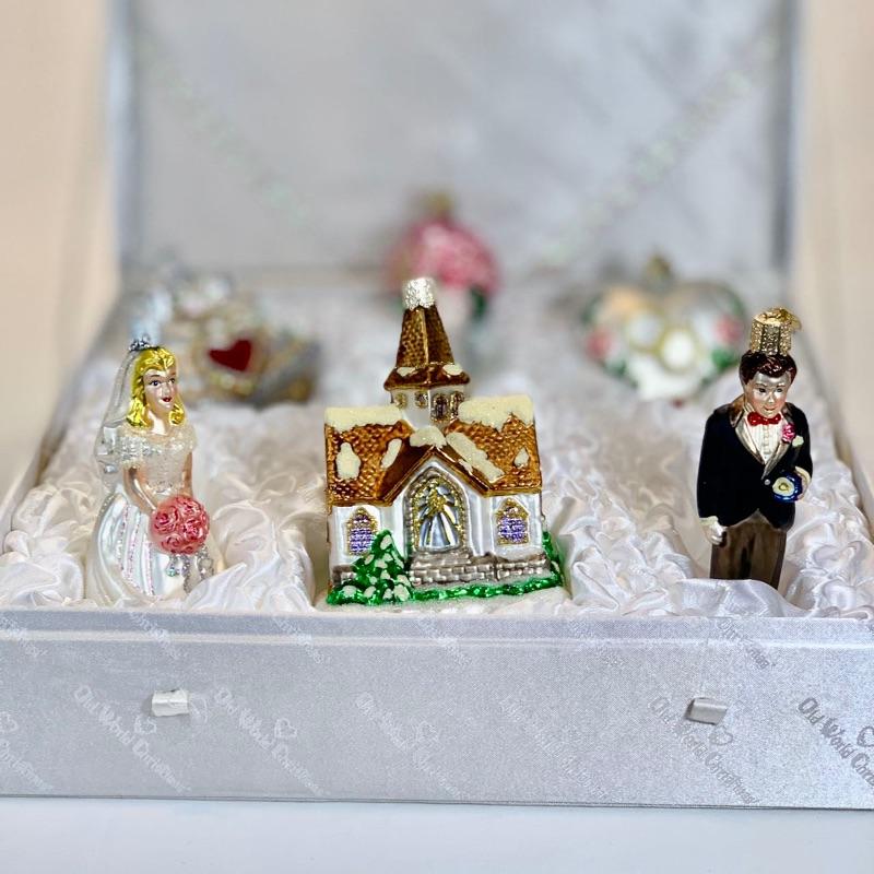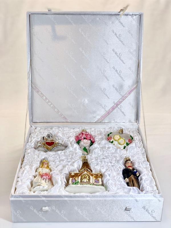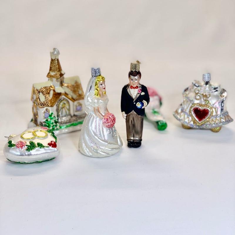 This delightful Wedding Collection includes six beautiful blown-glass ornaments, each hand-painted & glittered by artisans. Each collection comes packaged in a keepsake box. The set includes: Wedding Bells, Rose Bouquet, Wedding Heart, Bride, Wedding Chapel and Groom. The Wedding Collection makes a wonderful present & a cherished memento. Shipping available for extra cost.