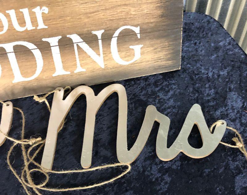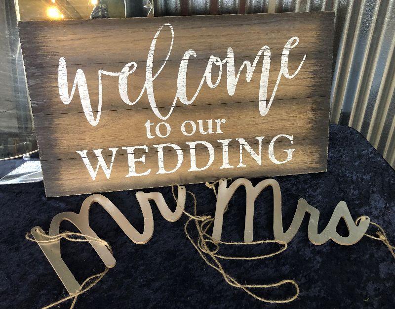 Welcome To Our Wedding 24 x 14" wooden sign and Mr and Mrs cutouts ready to display for your Nuptials...