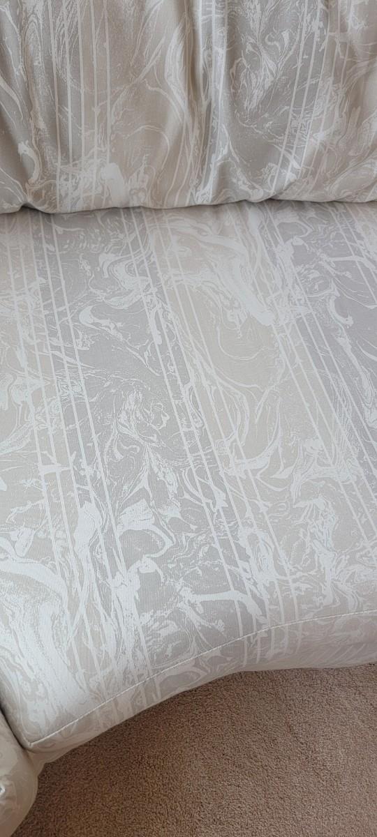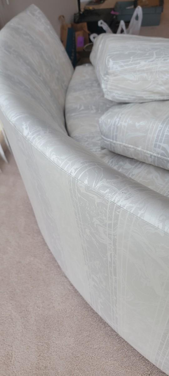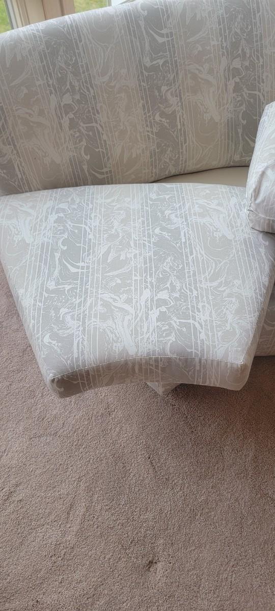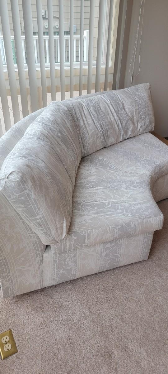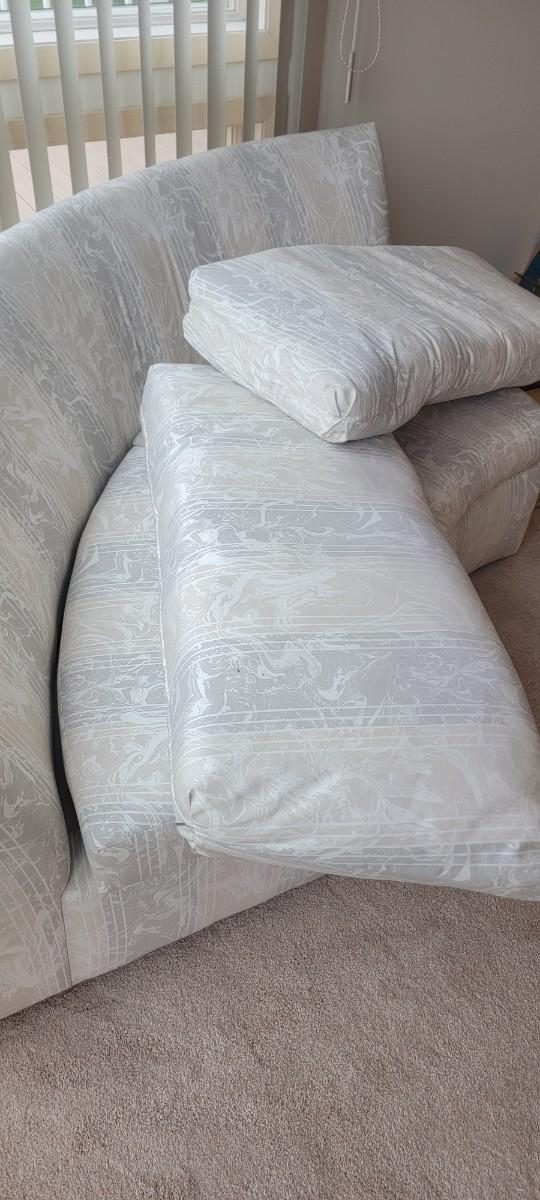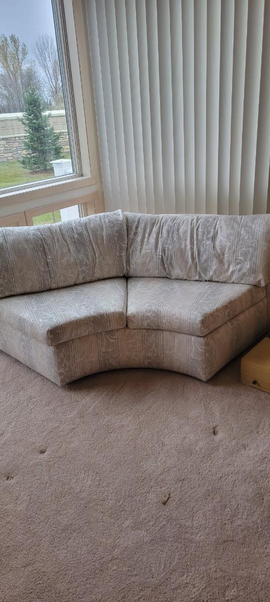 Neutral color wedge shape sofa. Back cushions loose. Lovely neutral colors. Appropriate 78" x 29" x 17".