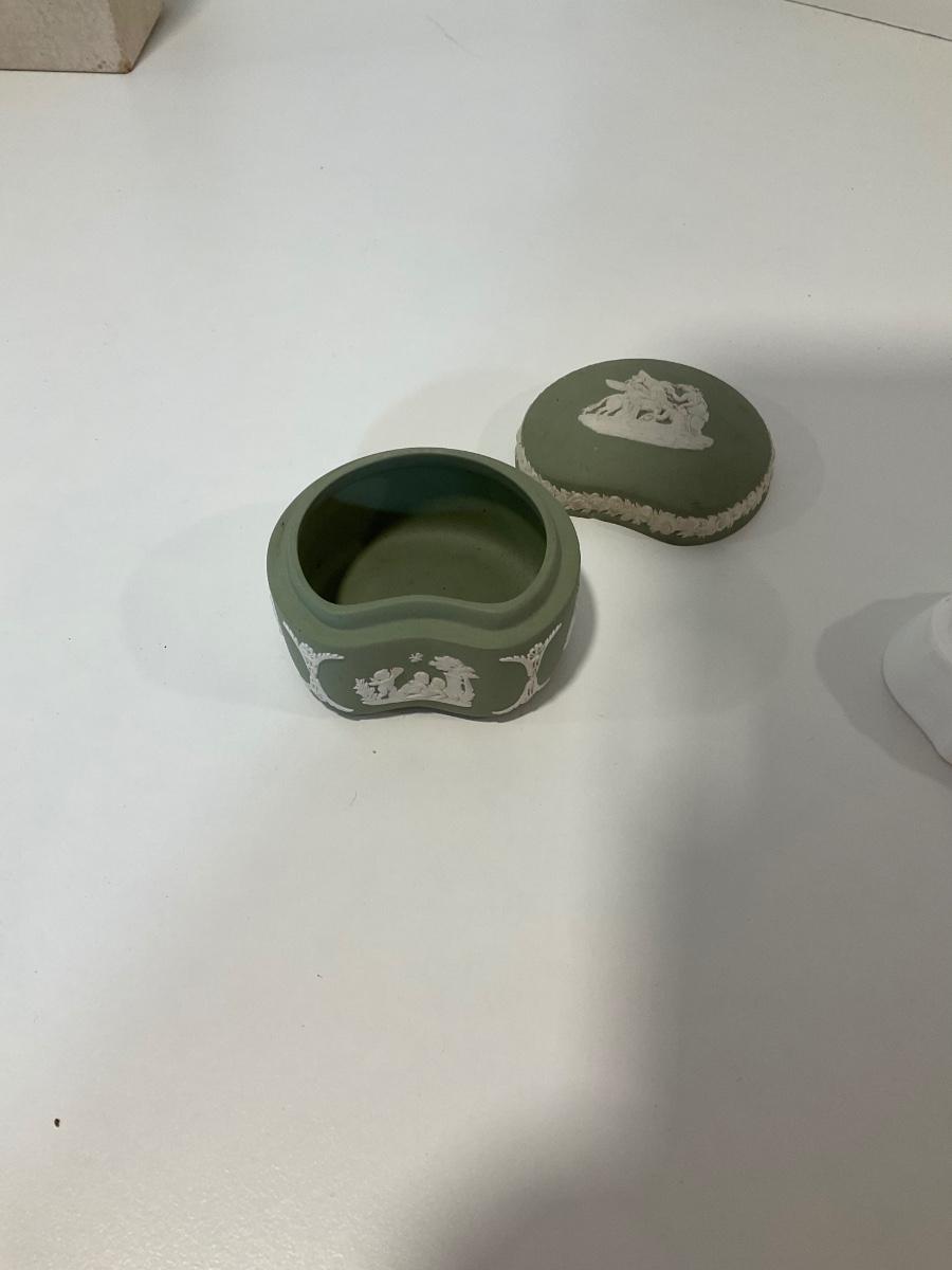 2 green wedge wood - 1 is dish and 1 is jar with lid