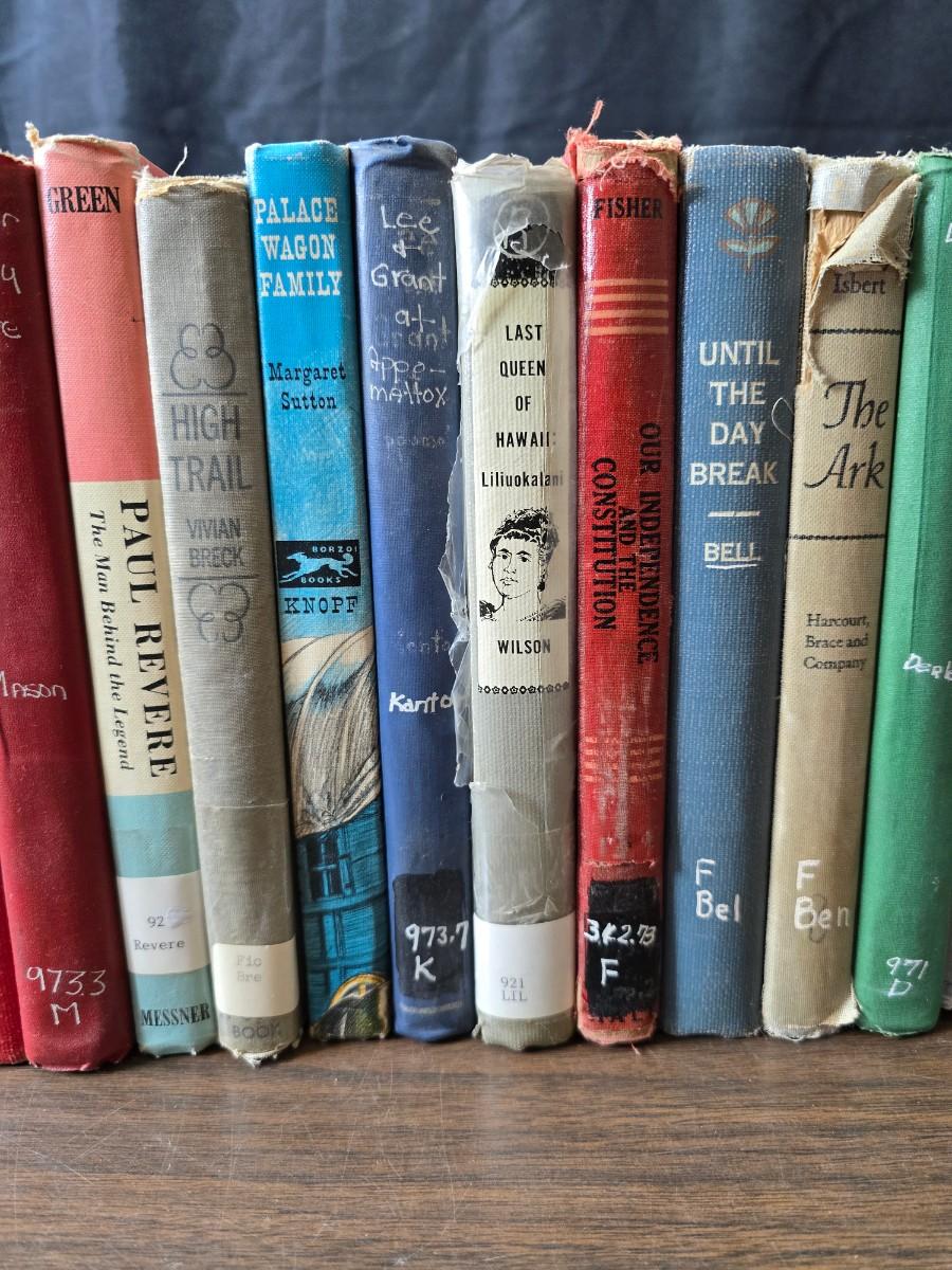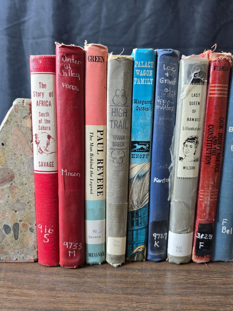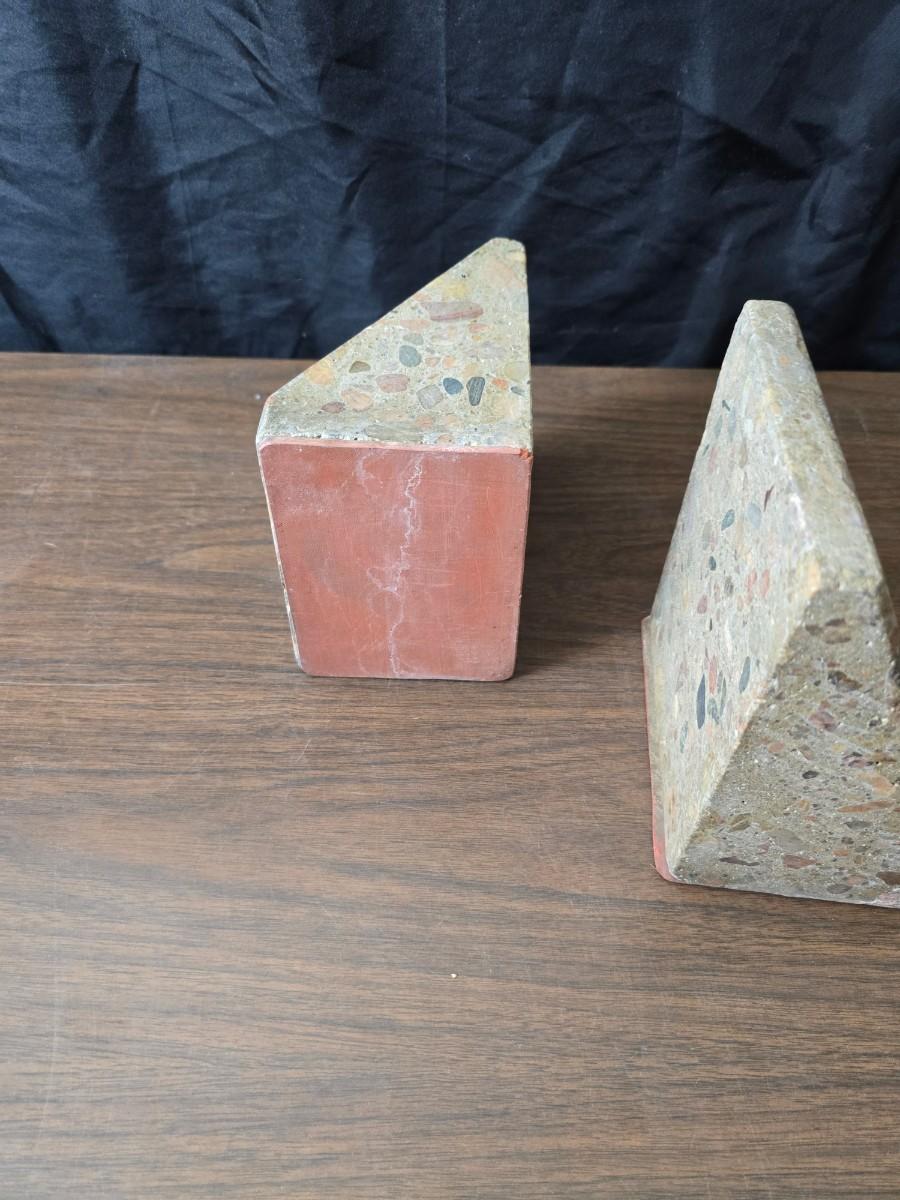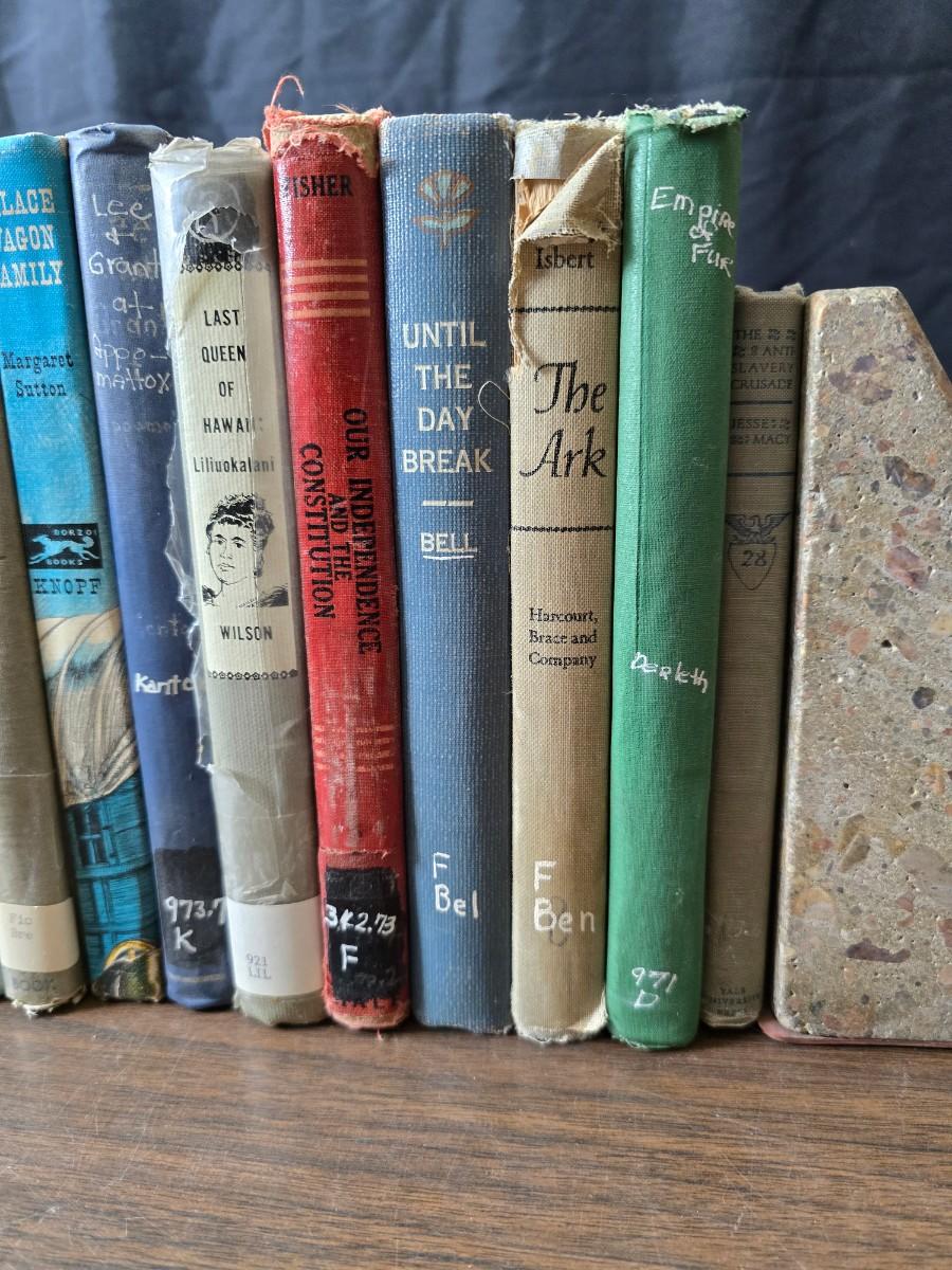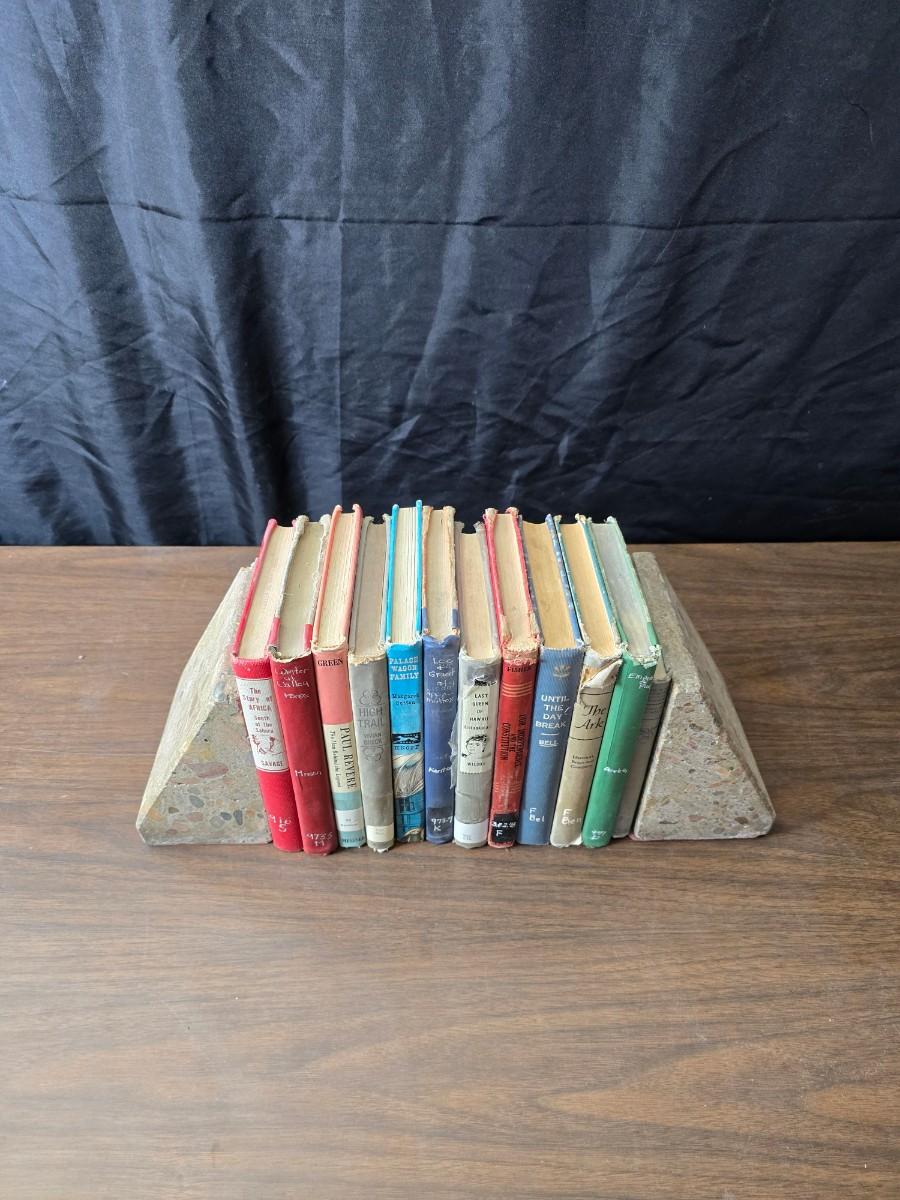 Wedge-shaped fossil stone bookends with a collection of vintage books