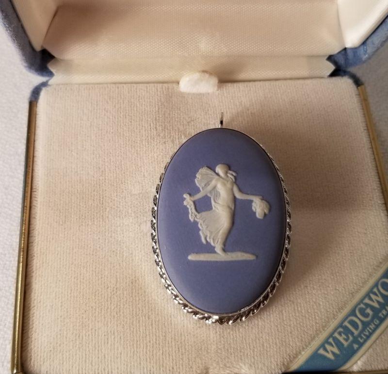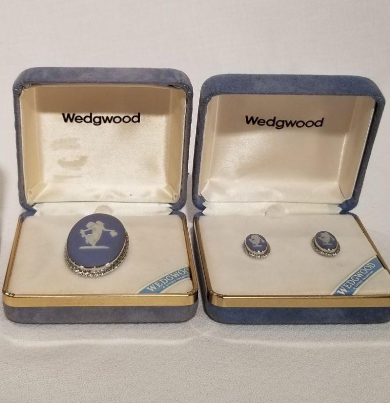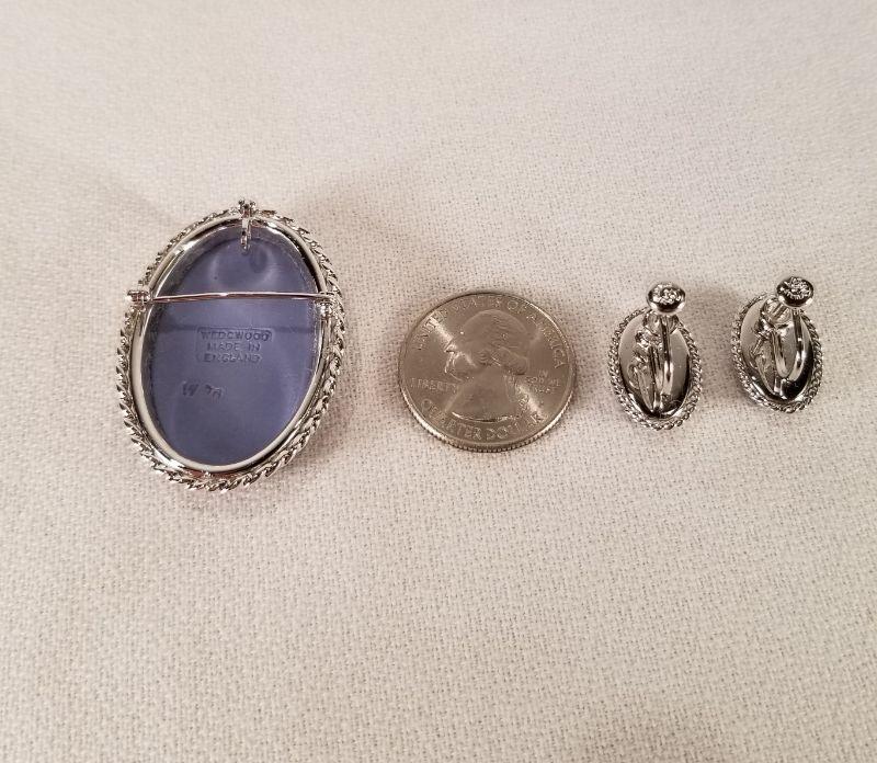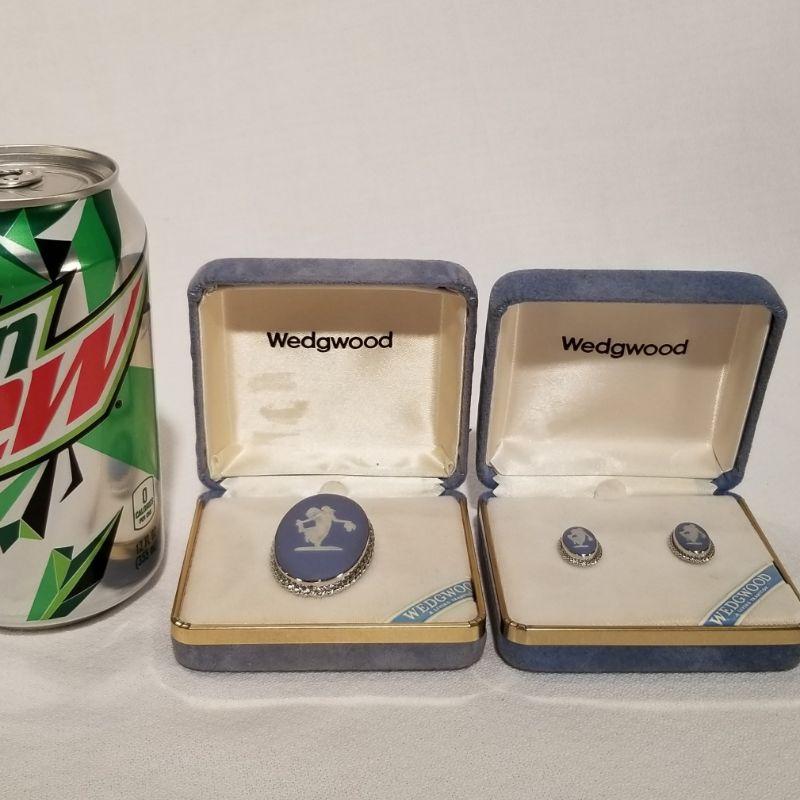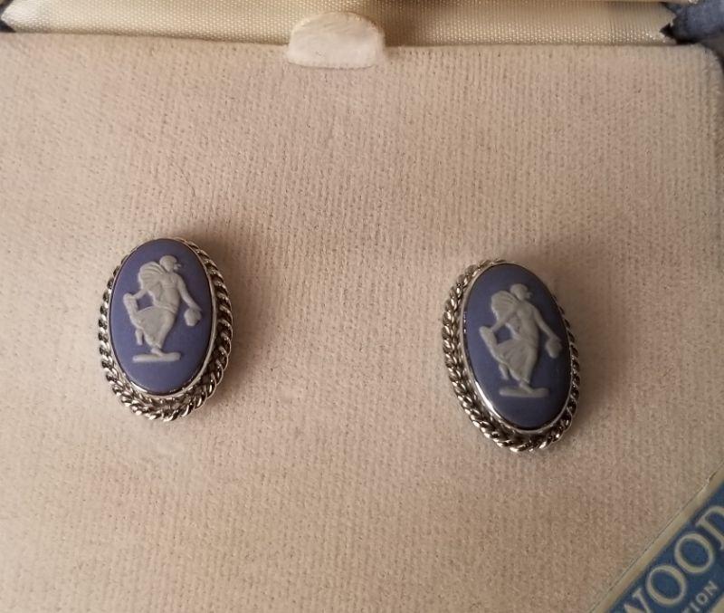 Wedgwood and Sterling Jewelry. Cameo-essence in original boxes. Screw-on type earrings, marked sterling and a brooch with a pendant hook for use as a necklace. Both appear unused ““ in as new condition. What an amazing birthday or anniversary gift these would make.