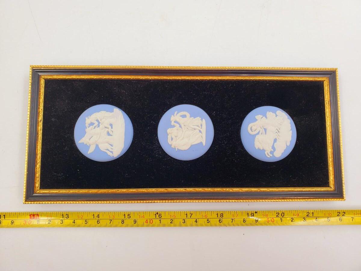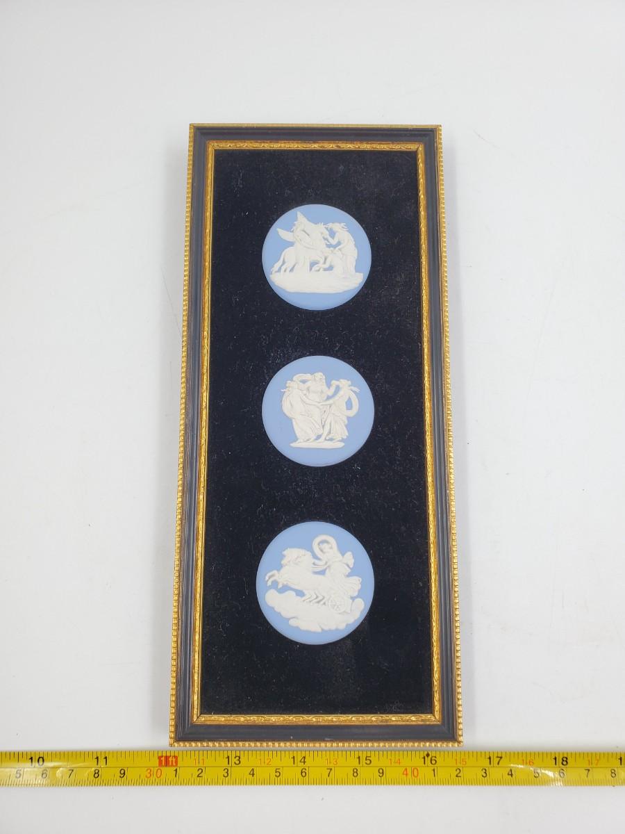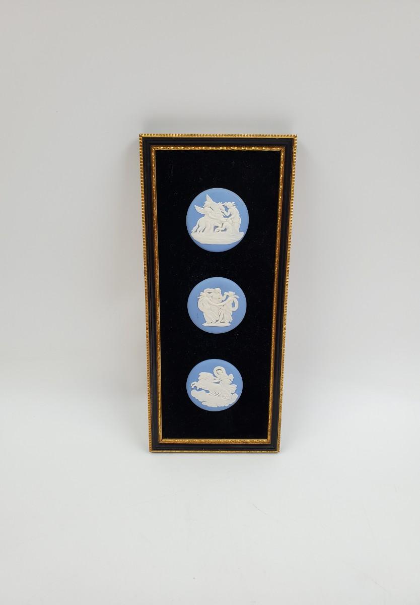 WEDGEWOOD BLUE AND WHITE CAMEO MEDALLIONS ENCASED IN A FRAME/PLAQUE