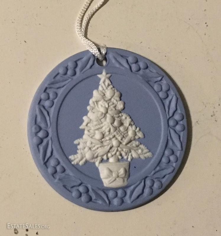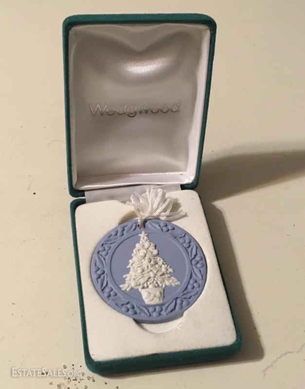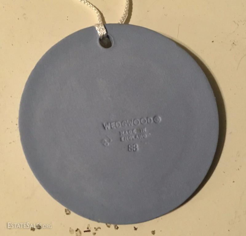 Blue Wedgewood Christmas tree ornament is stamped with the words "Wedgewood made In England 88" and comes in it's original box.