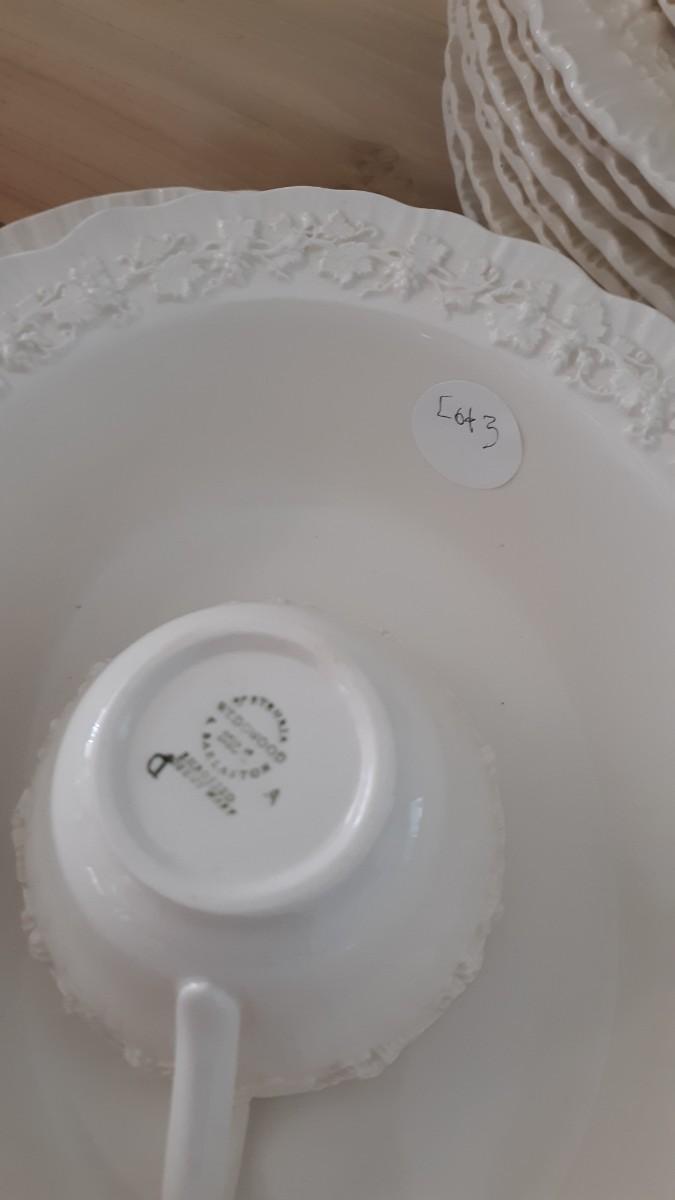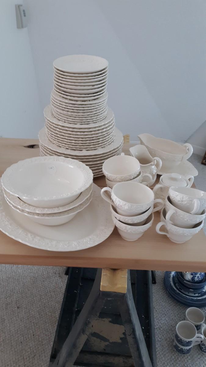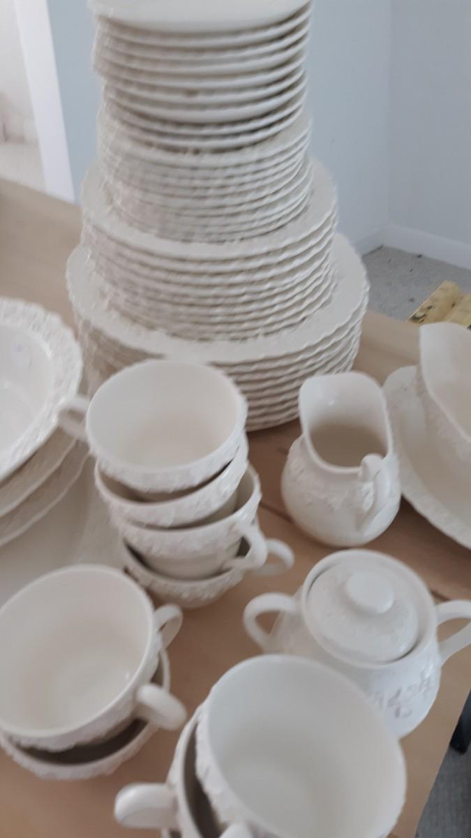 Beautiful Wedgewood Embossed Queensware China. Lots of pieces in this collection. You are buying the white Wedgewood that is on the table.
