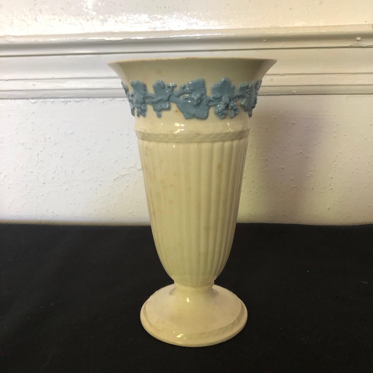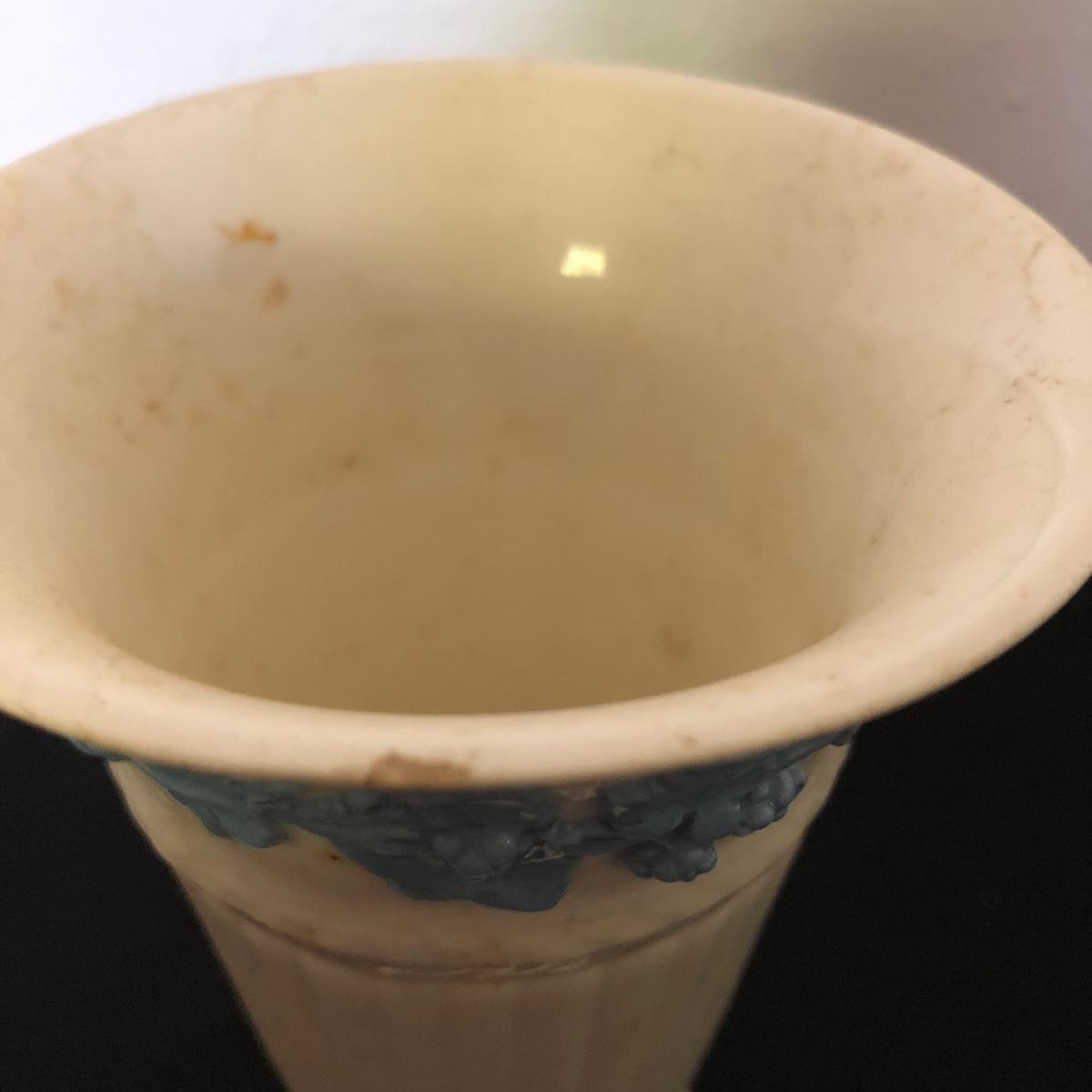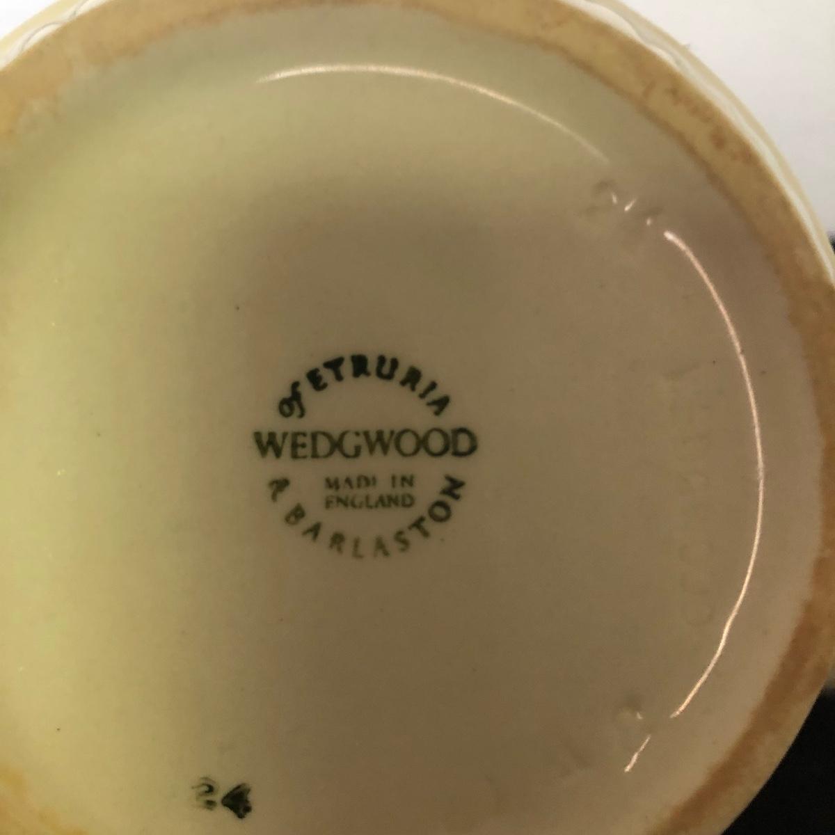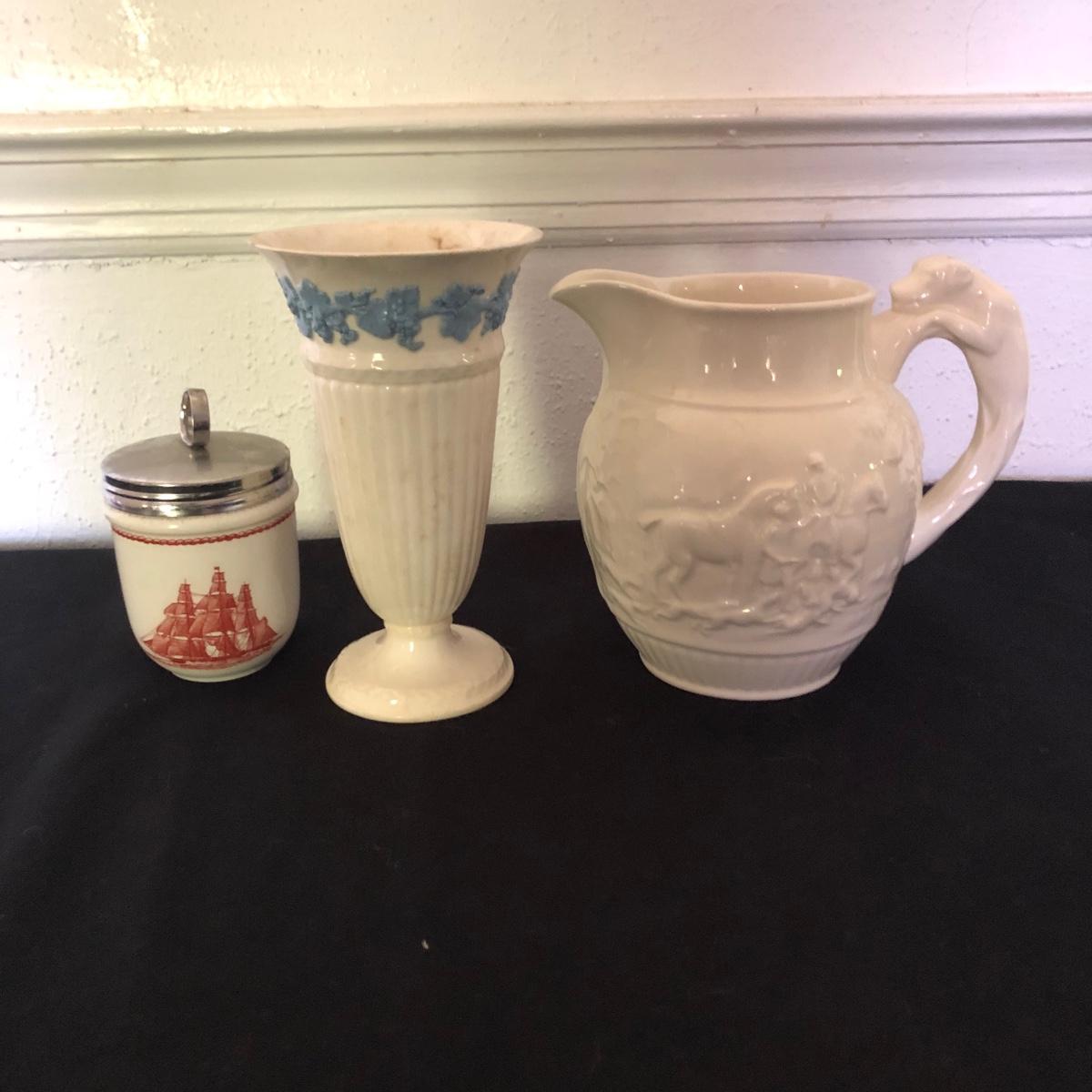 Lot includes trio of Wedgwood featuring a vase, pitcher and a egg coddler. Vase has chip on rim, see pictures. Vase measures 3.75”D x 6.5”.