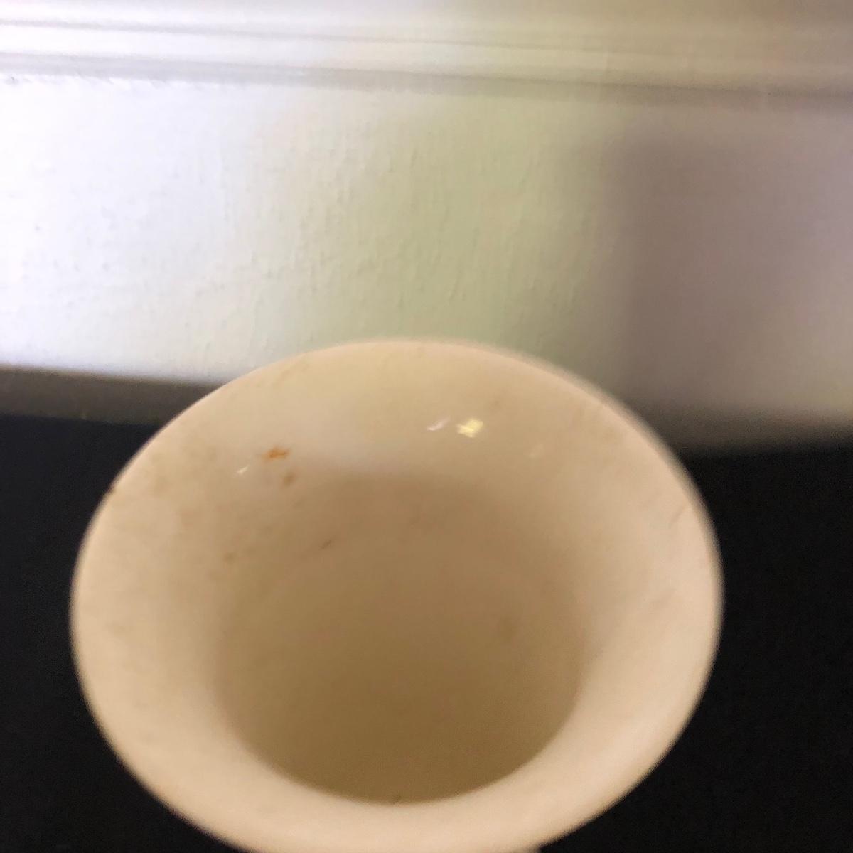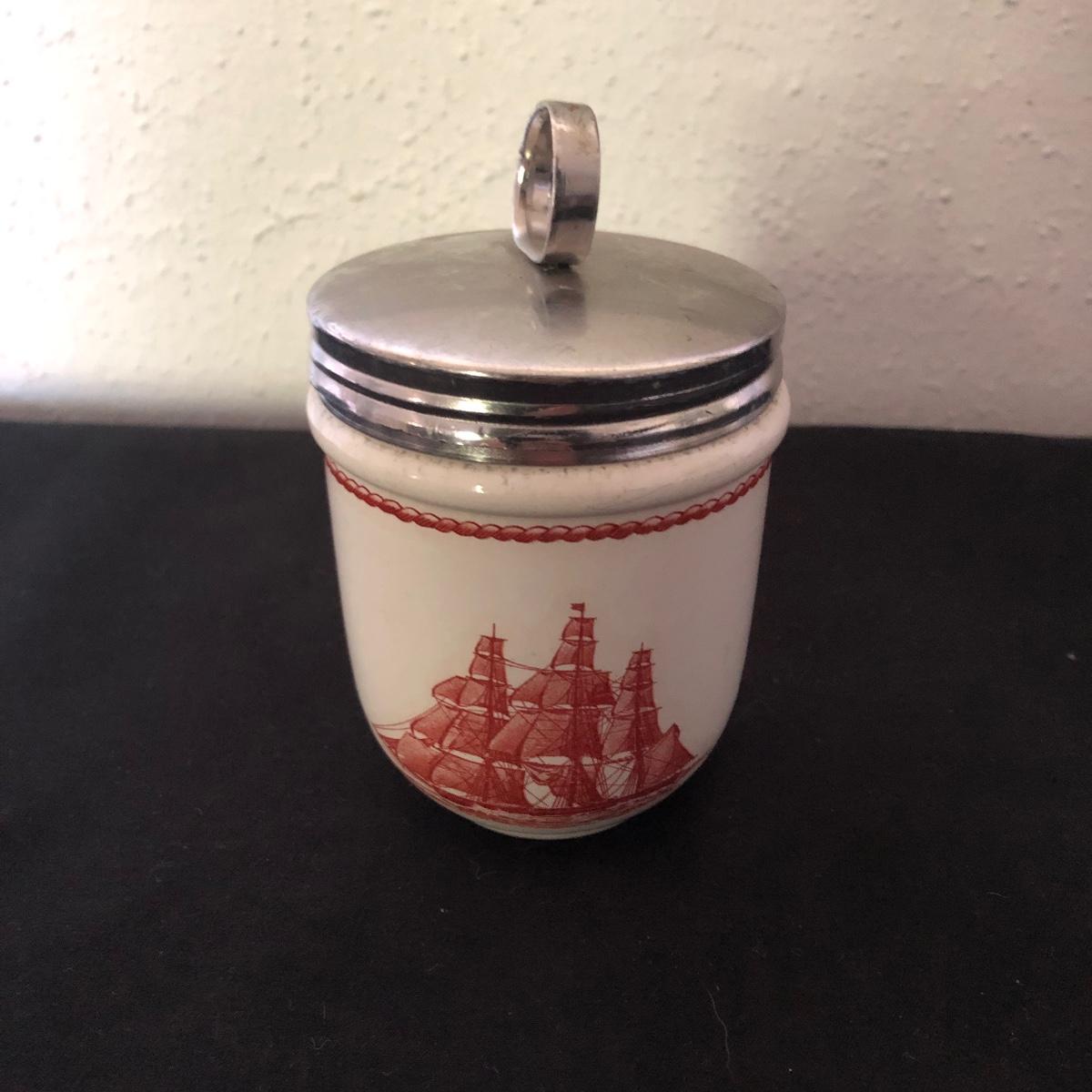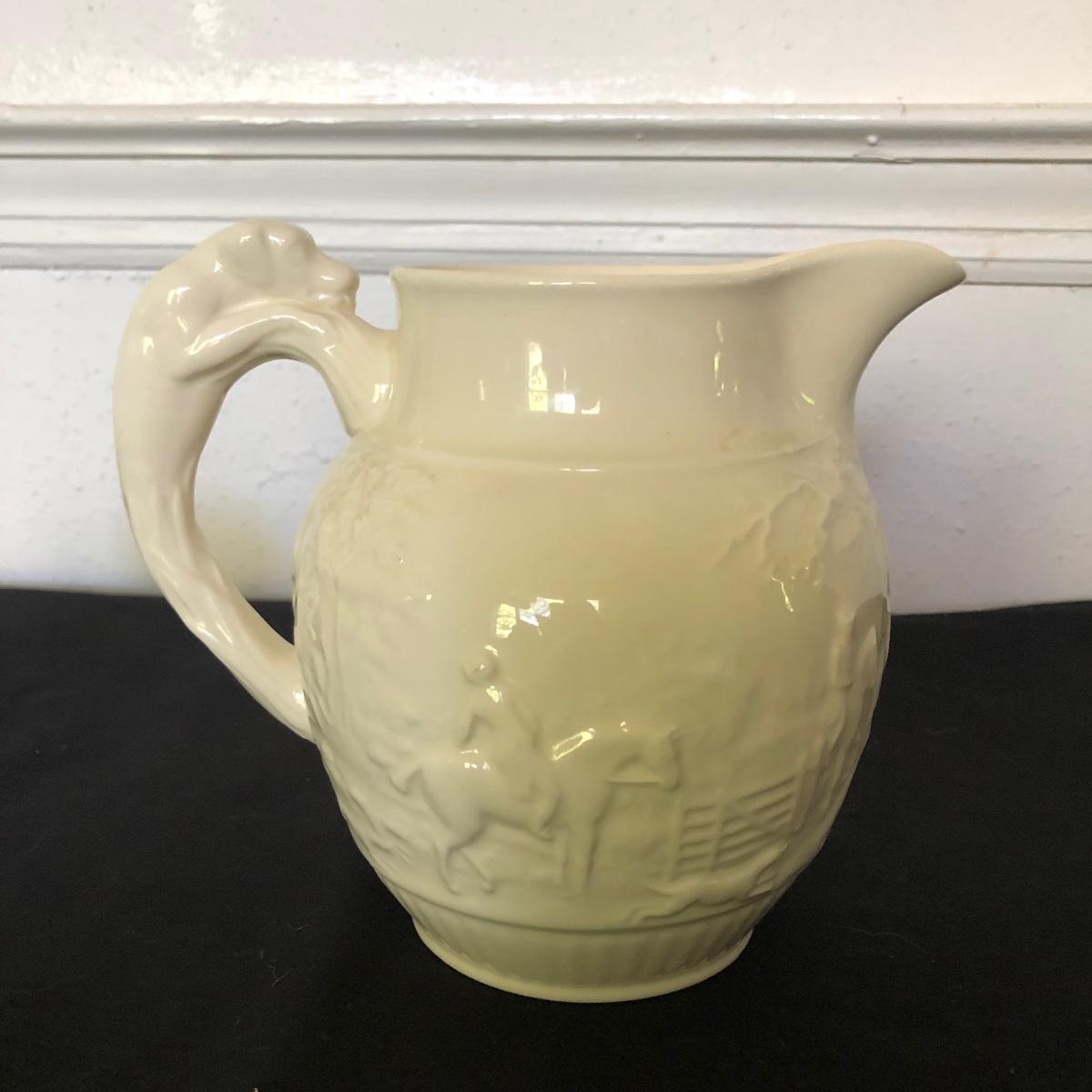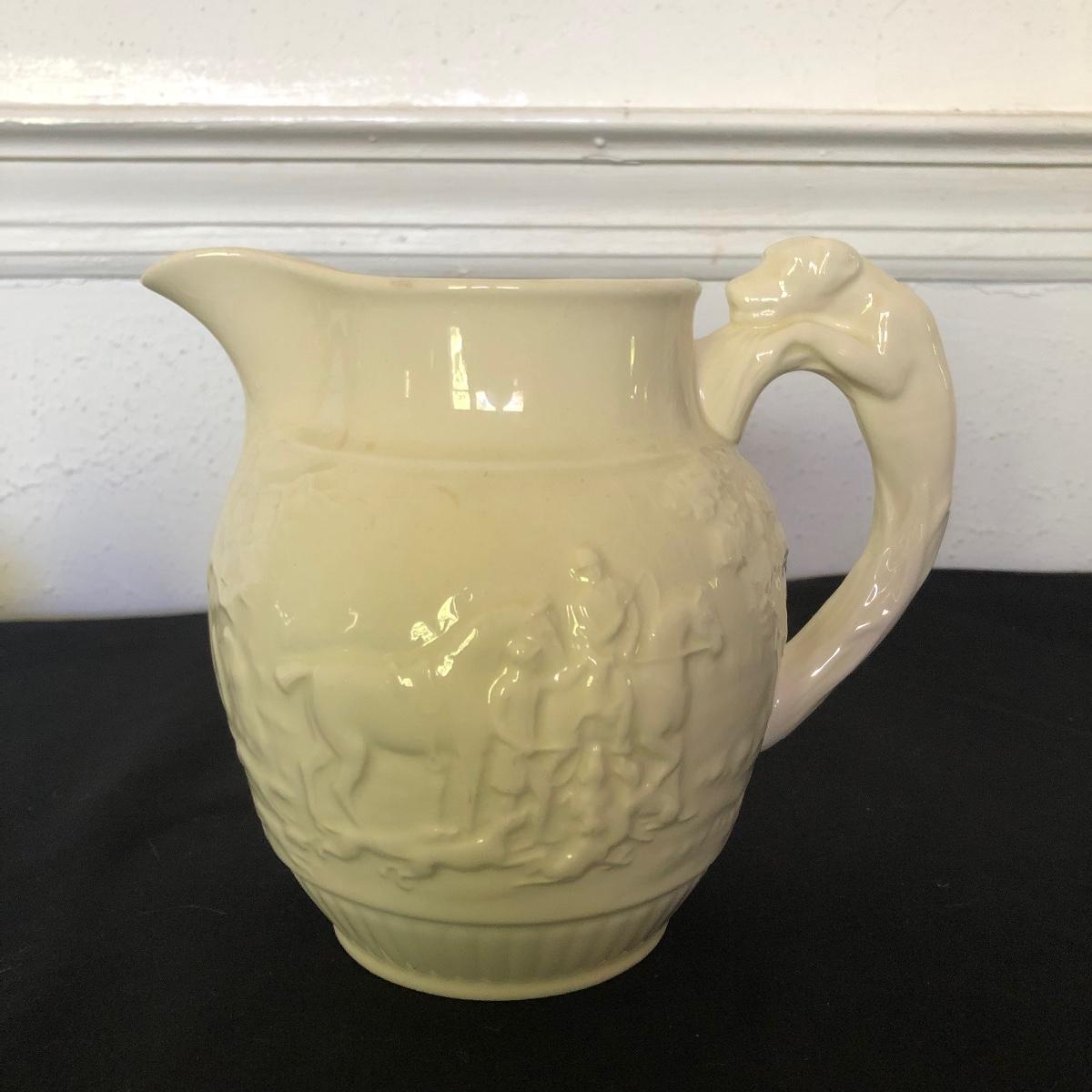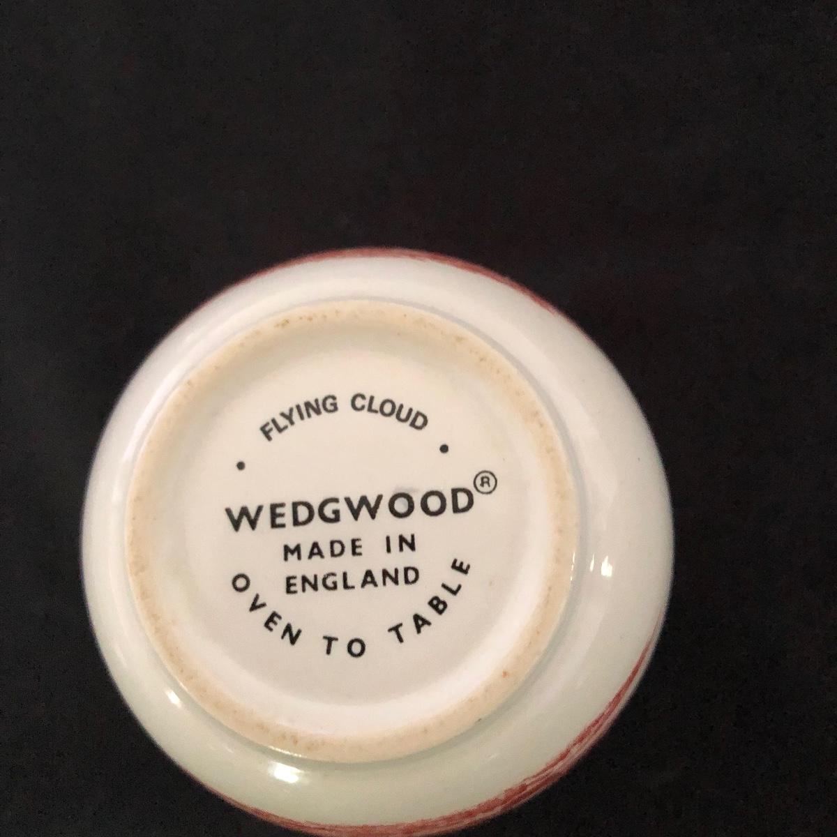 Lot includes trio of Wedgwood featuring a vase, pitcher and a egg coddler. Vase has chip on rim, see pictures. Vase measures 3.75”D x 6.5”.
