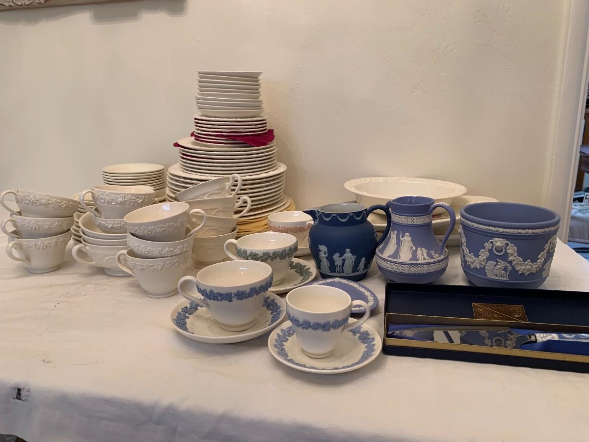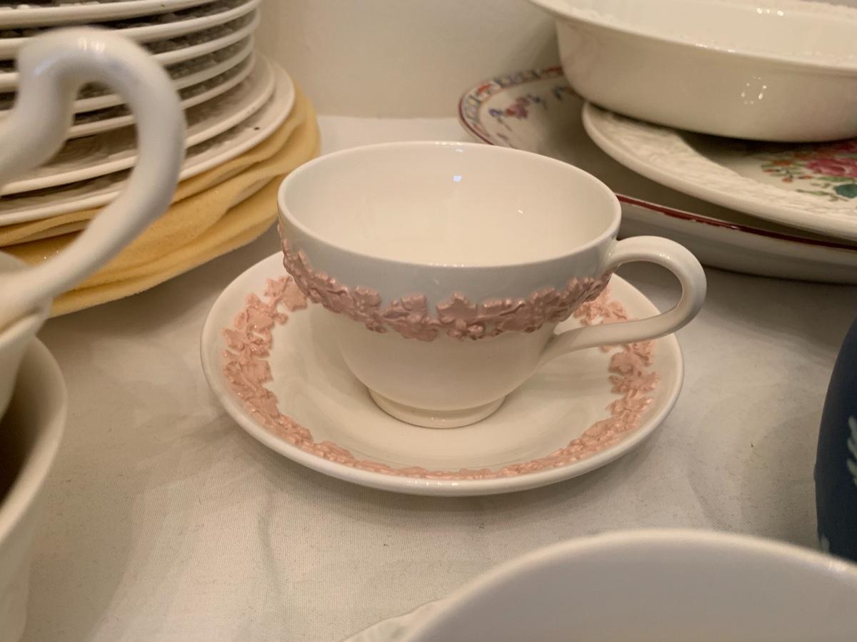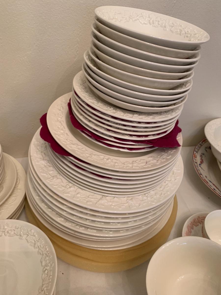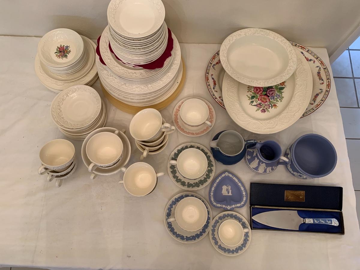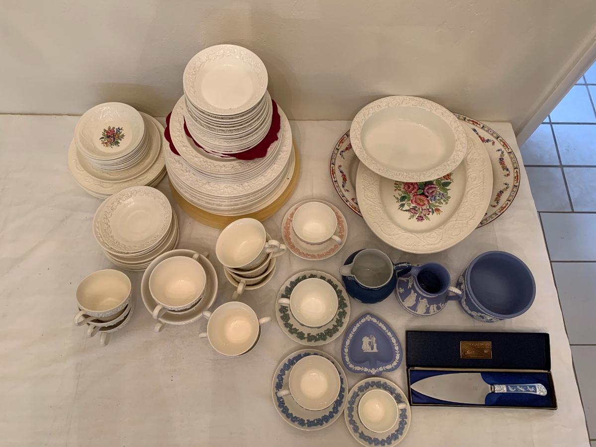 Large lot of various patterns of Wedgewood china. Serving pieces, tea cups, dishes set.