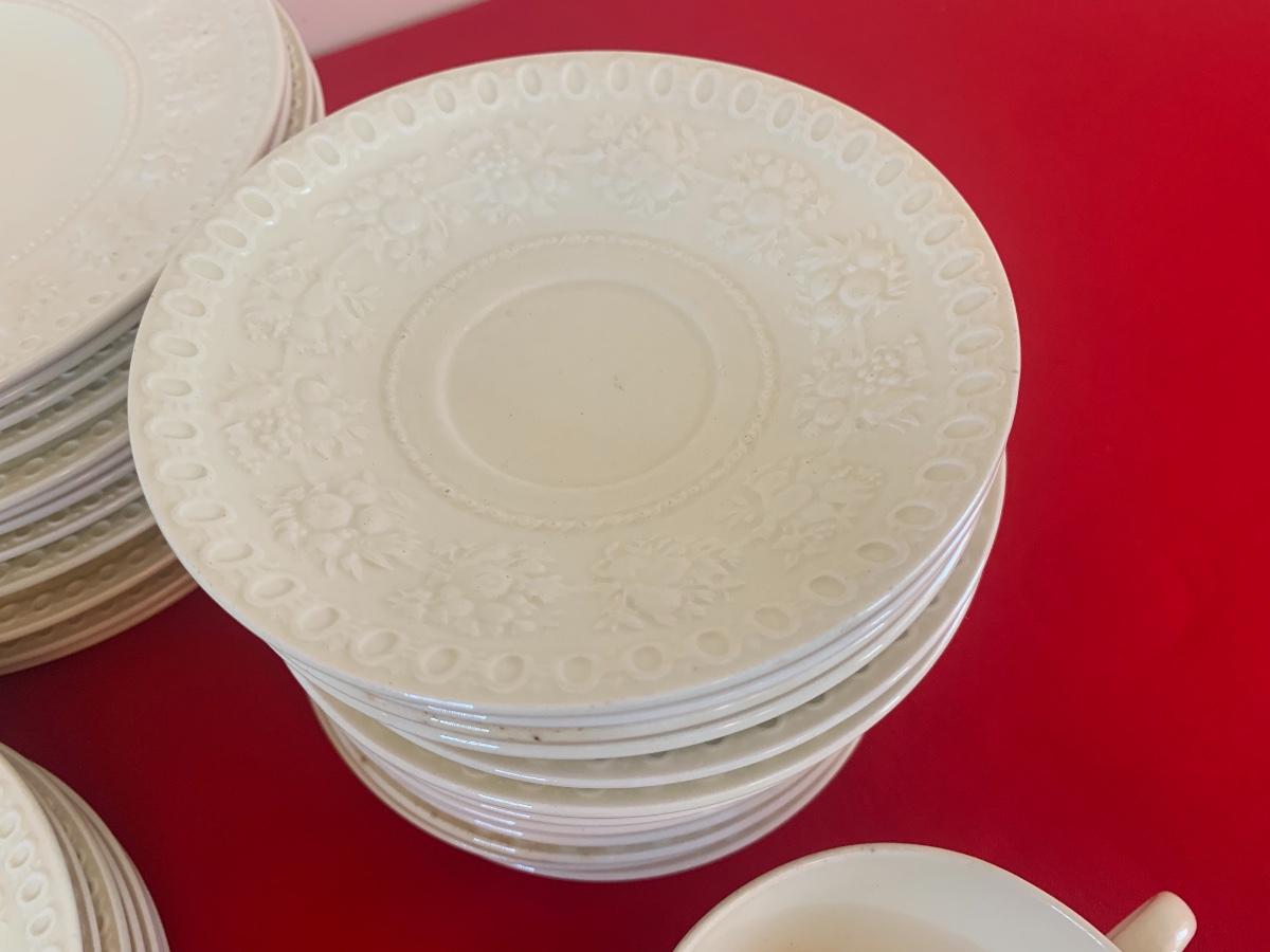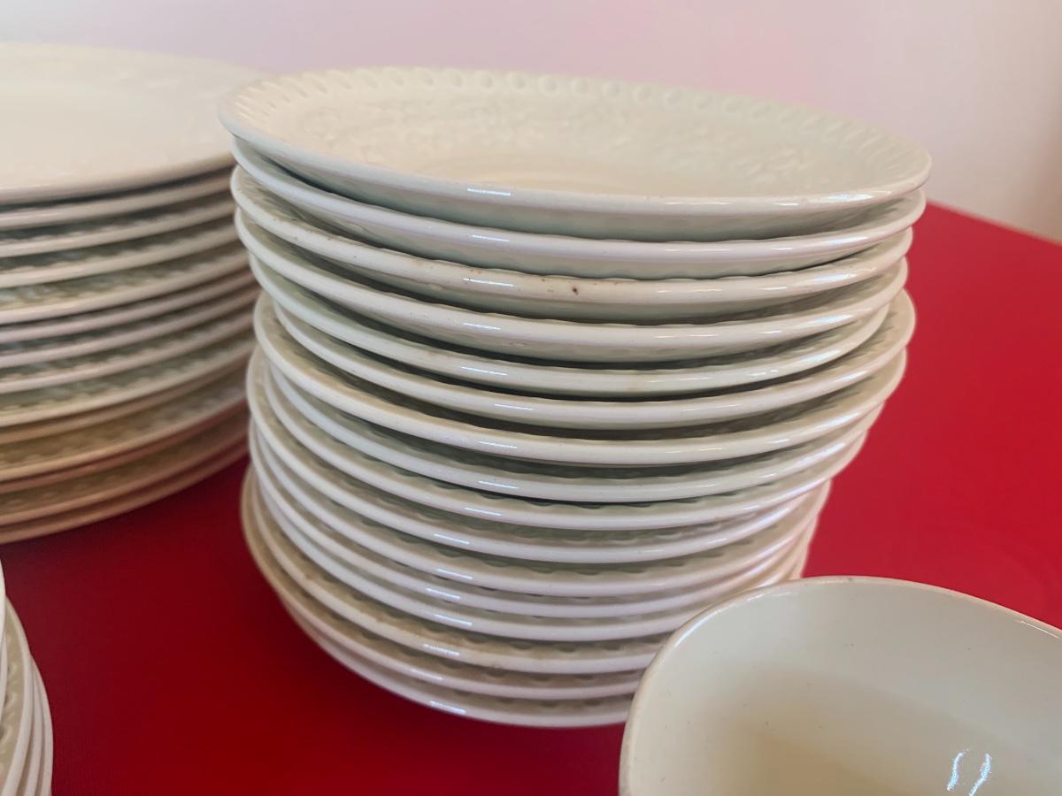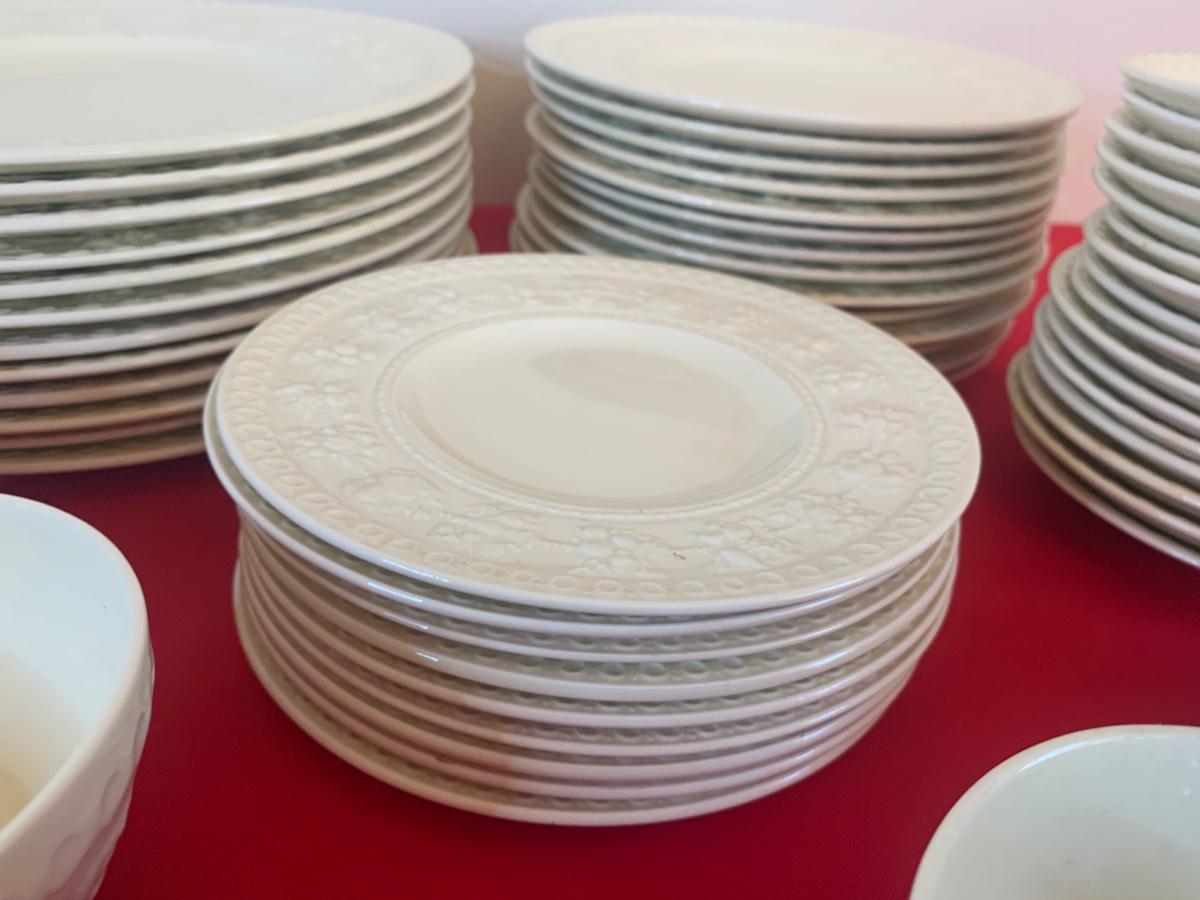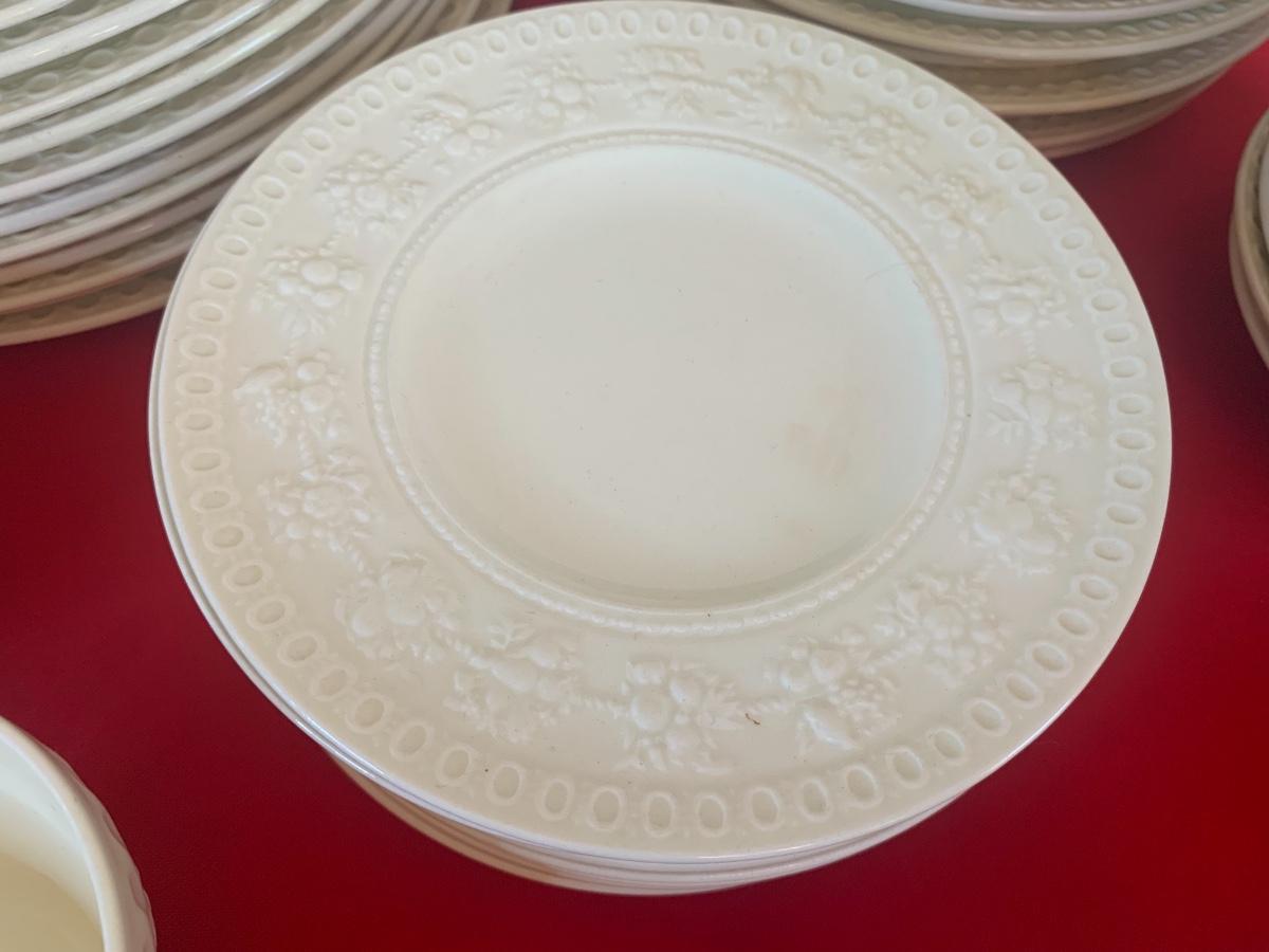 Lot includes 65 pieces of Wedgewood and Barlaston of Etruria Wellesley USA china. Ivory color with fruit and botanical rim design. Most of the pieces are in good condition for age, a couple pieces in each stack have some discoloration and crazing.