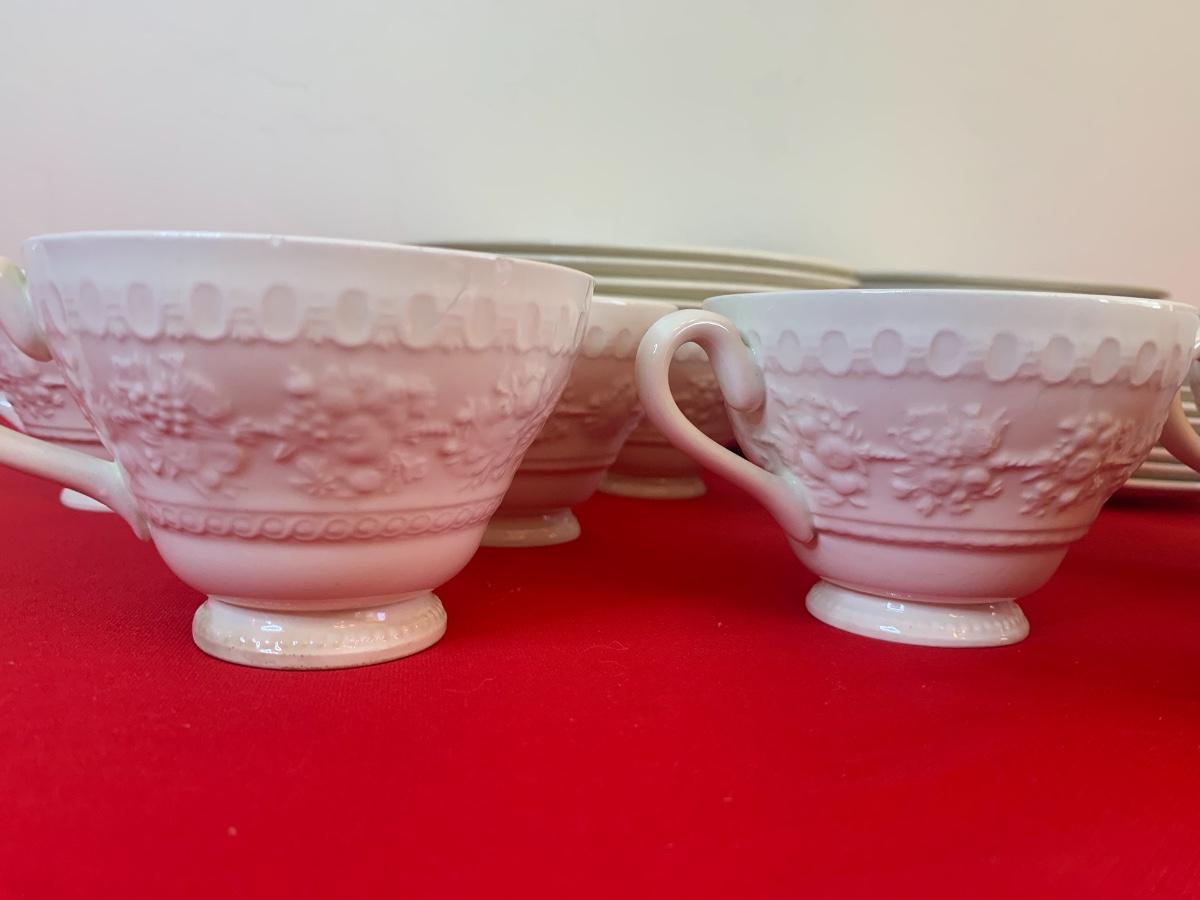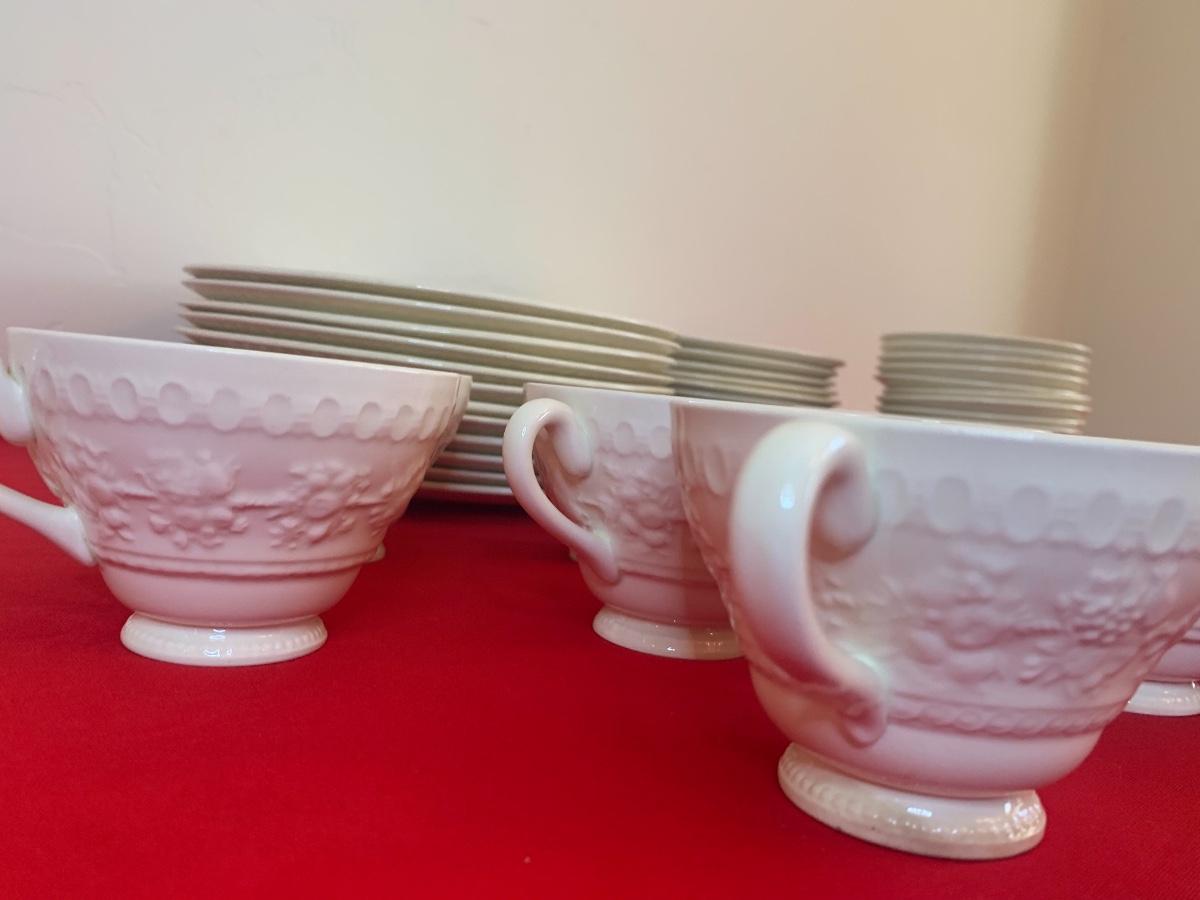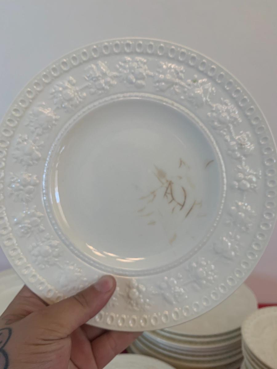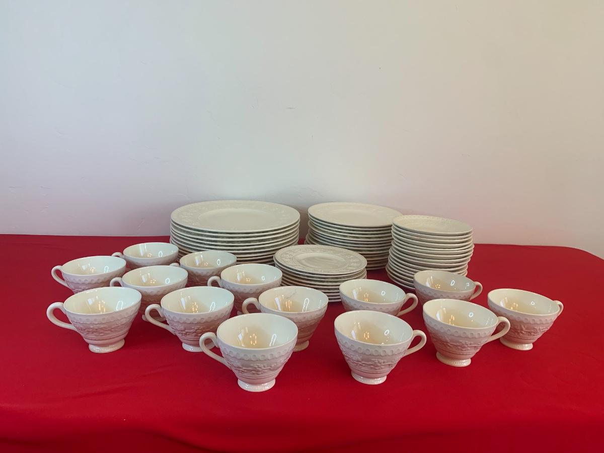 Lot includes 65 pieces of Wedgewood and Barlaston of Etruria Wellesley USA china. Ivory color with fruit and botanical rim design. Most of the pieces are in good condition for age, a couple pieces in each stack have some discoloration and crazing.