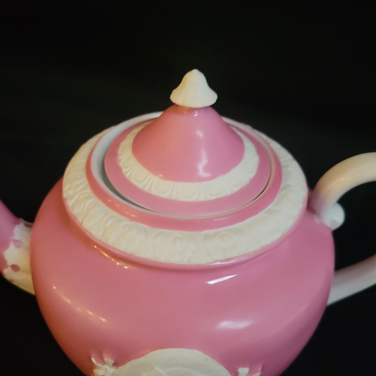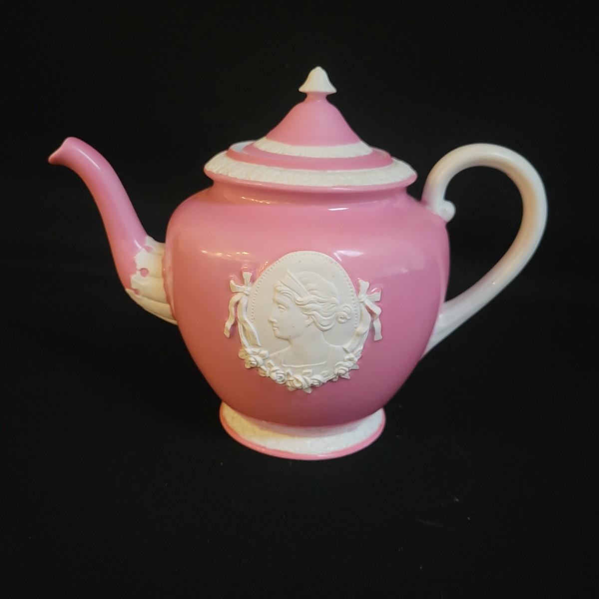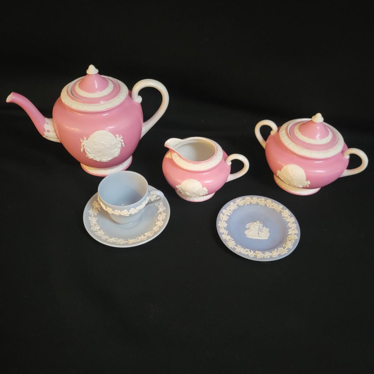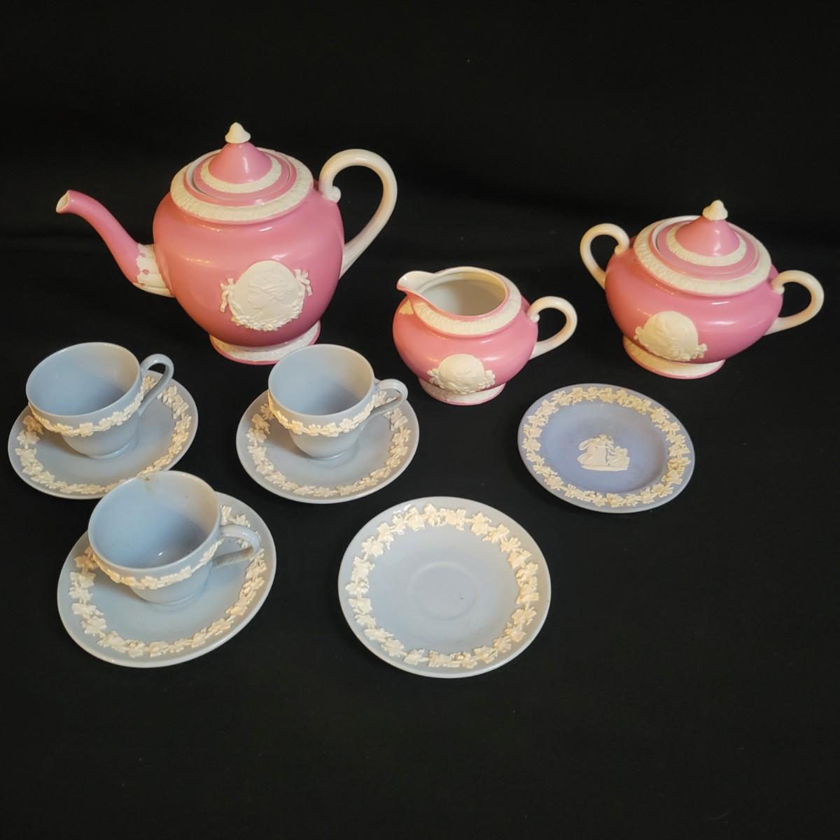 A collection of eight Wedgwood teacups and saucers in a light blue color with white details. Also included is a three piece tea set in a mauve color with white details by Czecholsovachia Mustershutz. The teapot measures approximately 9" x 5" x 6.5"H. Shipping available