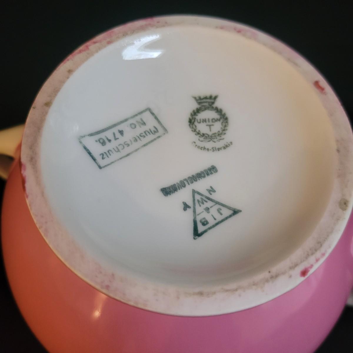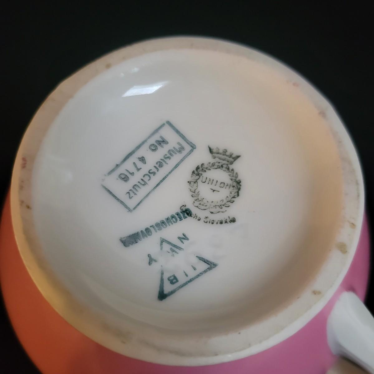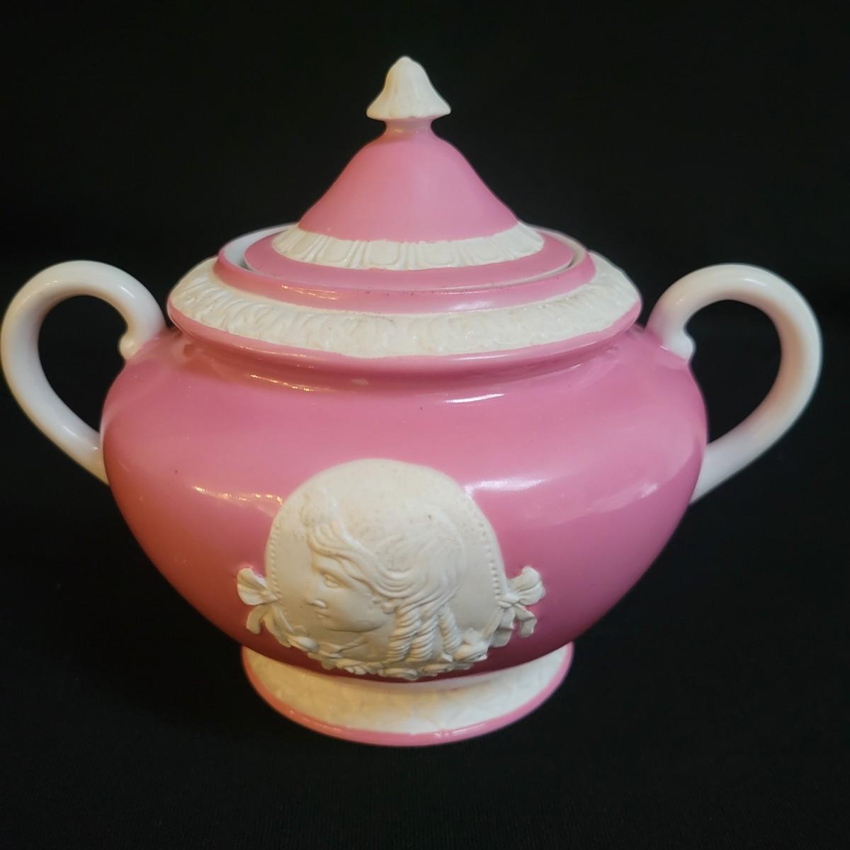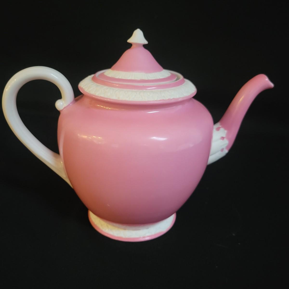 A collection of eight Wedgwood teacups and saucers in a light blue color with white details. Also included is a three piece tea set in a mauve color with white details by Czecholsovachia Mustershutz. The teapot measures approximately 9" x 5" x 6.5"H. Shipping available