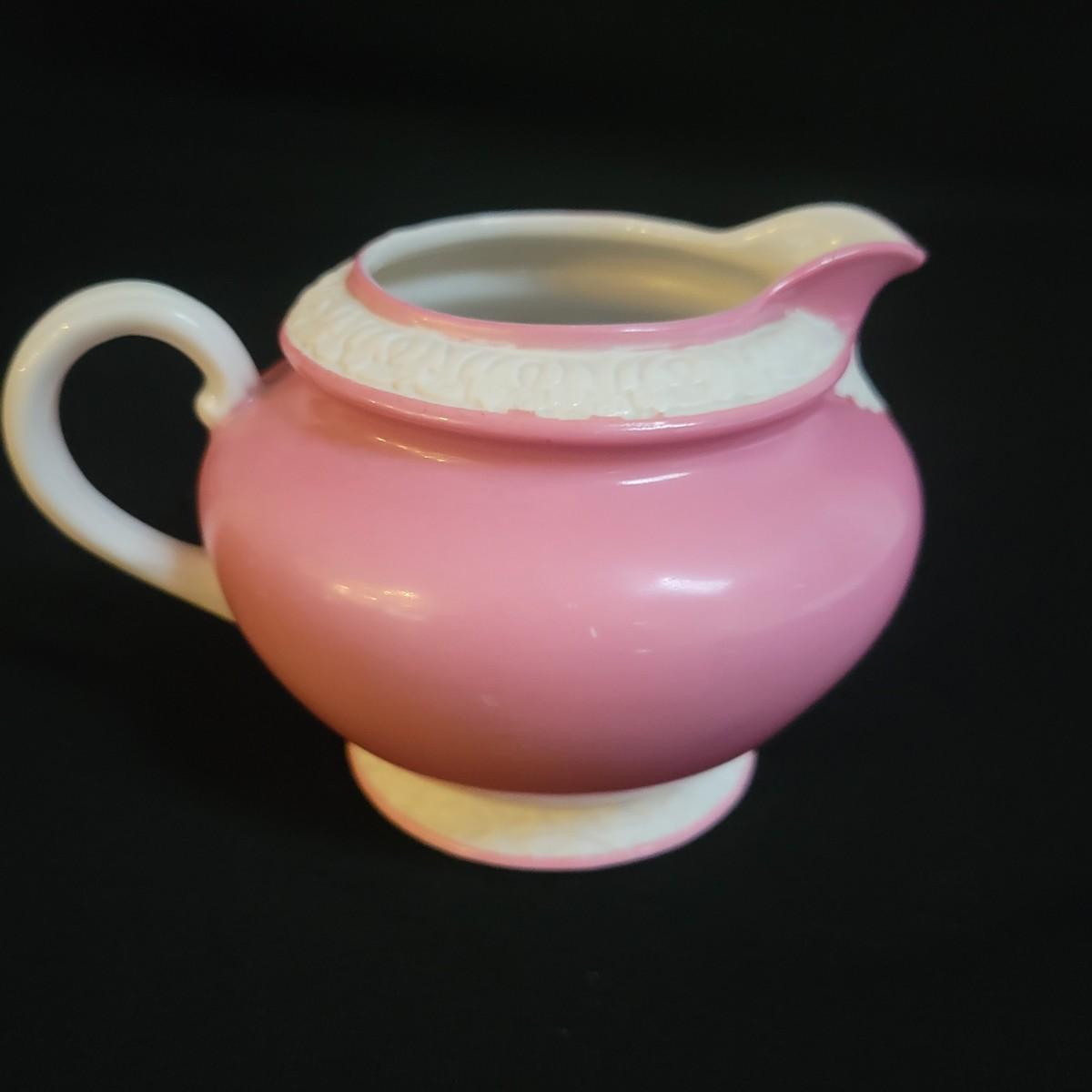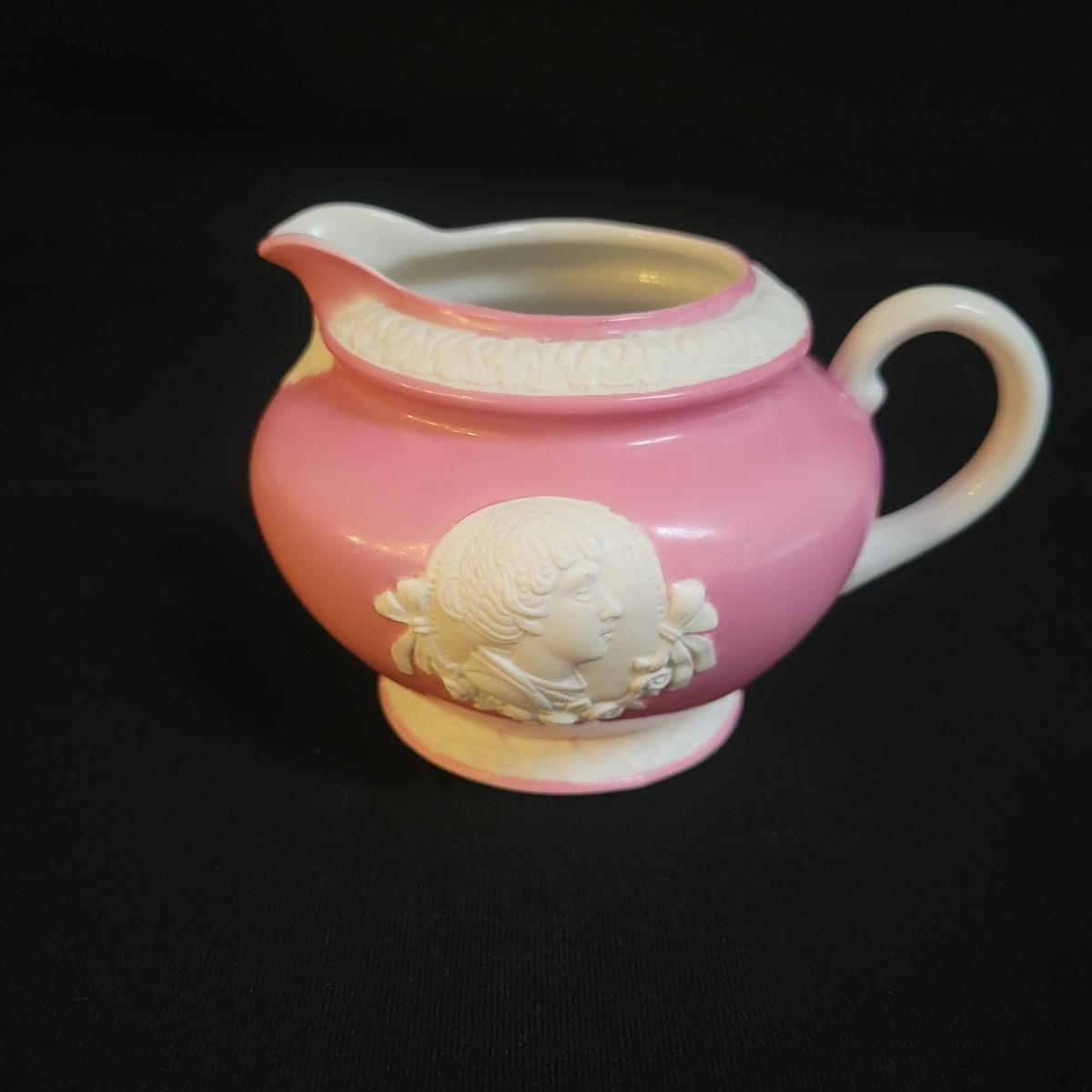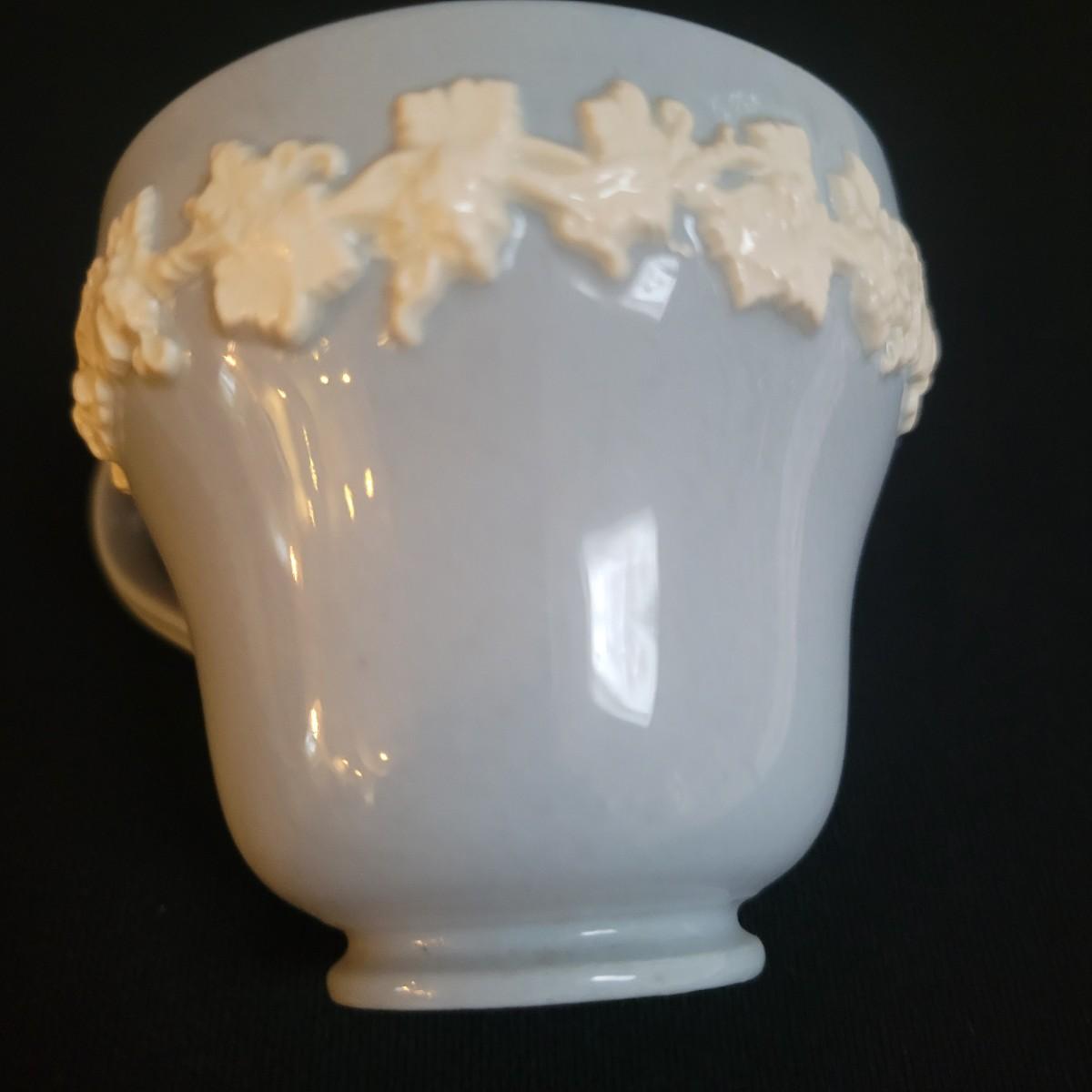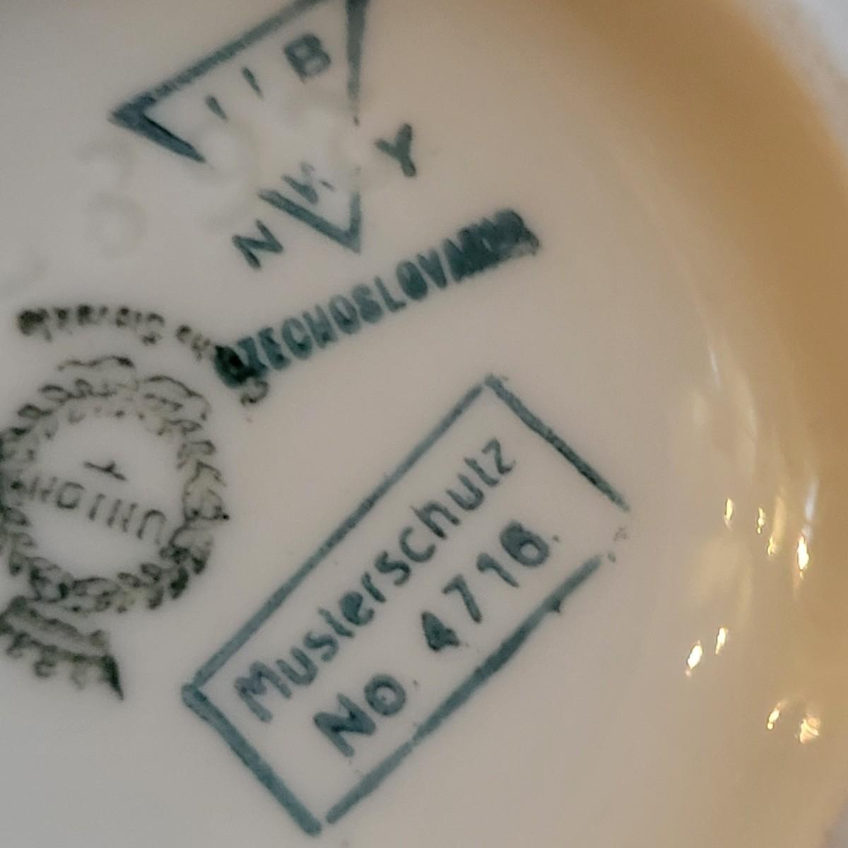 A collection of eight Wedgwood teacups and saucers in a light blue color with white details. Also included is a three piece tea set in a mauve color with white details by Czecholsovachia Mustershutz. The teapot measures approximately 9" x 5" x 6.5"H. Shipping available