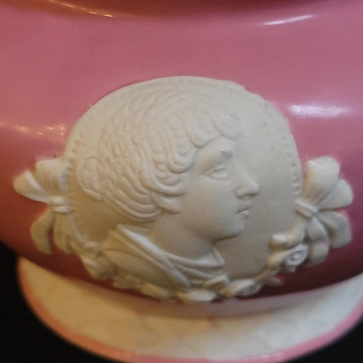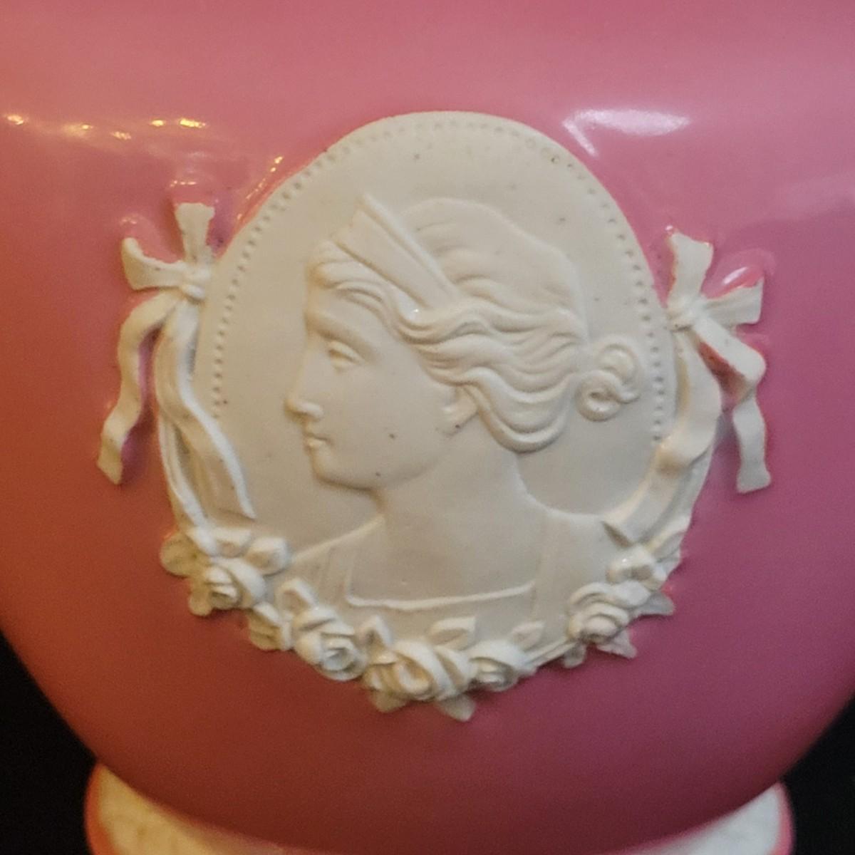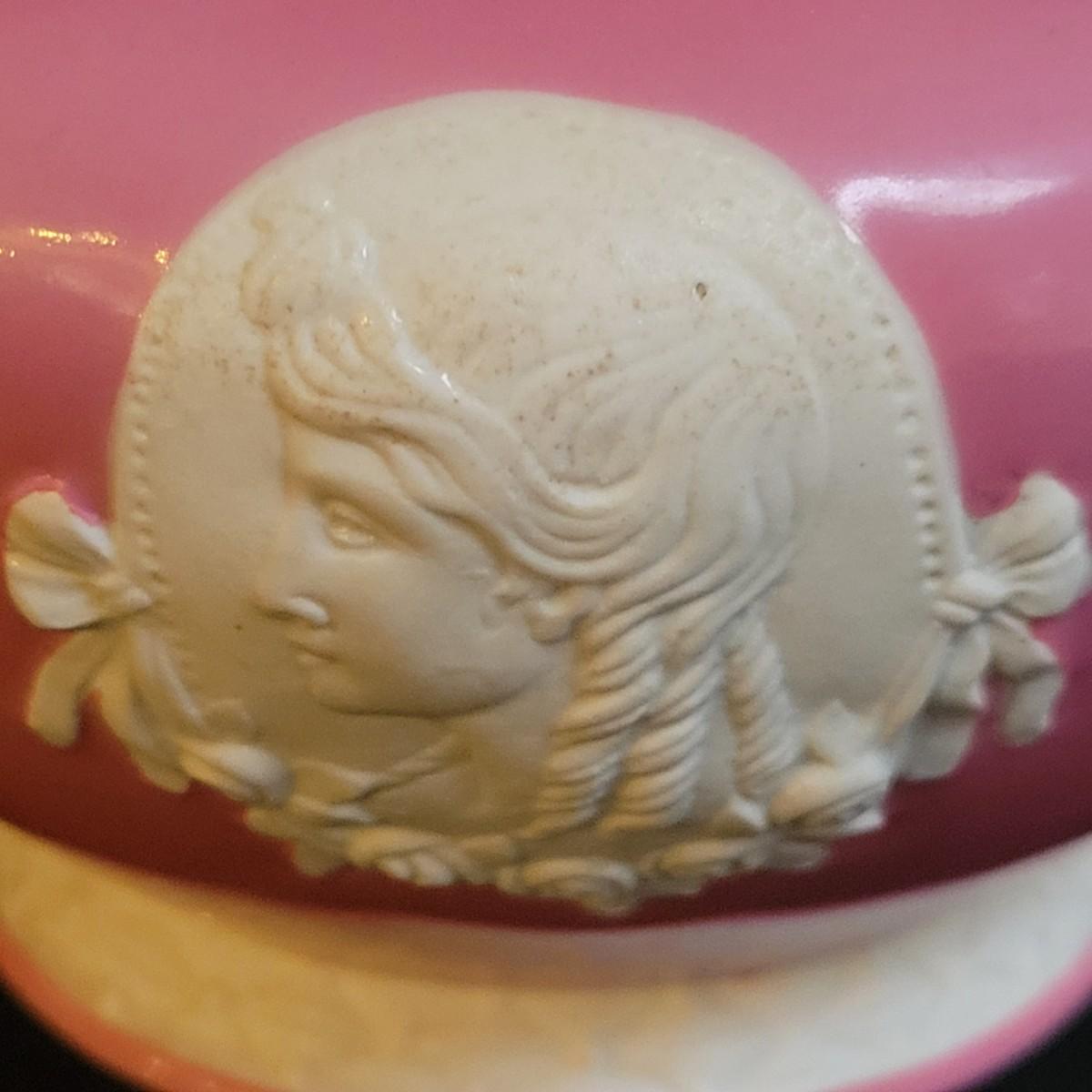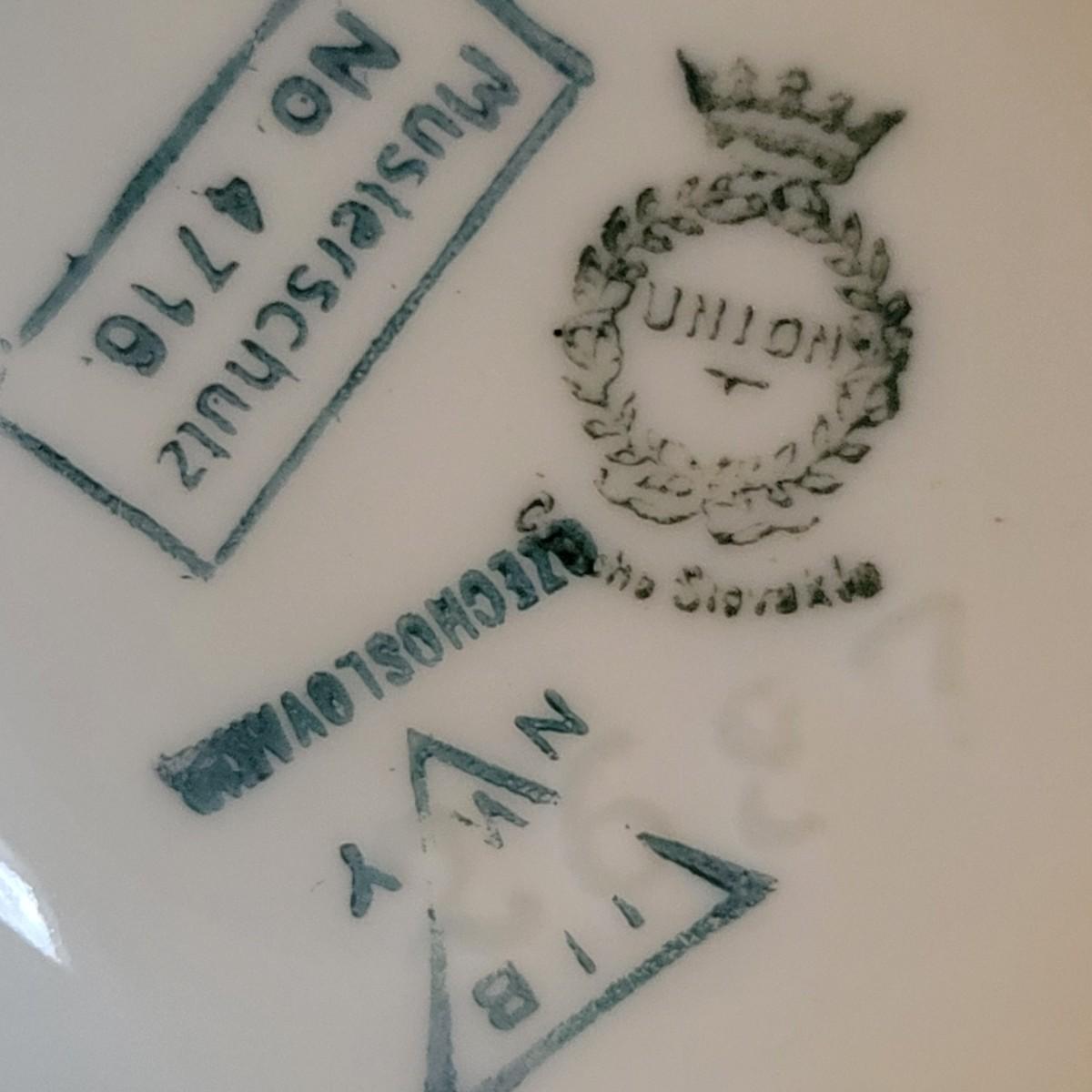 A collection of eight Wedgwood teacups and saucers in a light blue color with white details. Also included is a three piece tea set in a mauve color with white details by Czecholsovachia Mustershutz. The teapot measures approximately 9" x 5" x 6.5"H. Shipping available