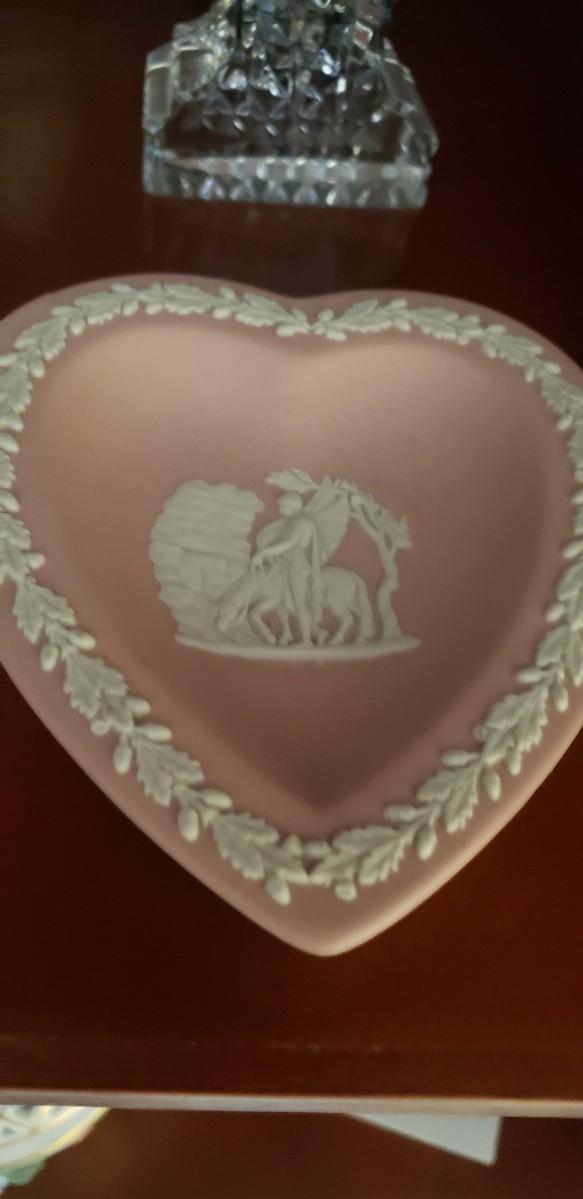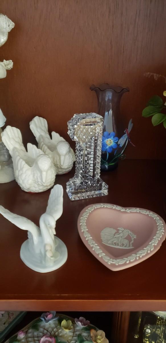 Pink Wedgewood heart dish, #1 Tiffany crystal, dove candle holders, glass vase, swan figure