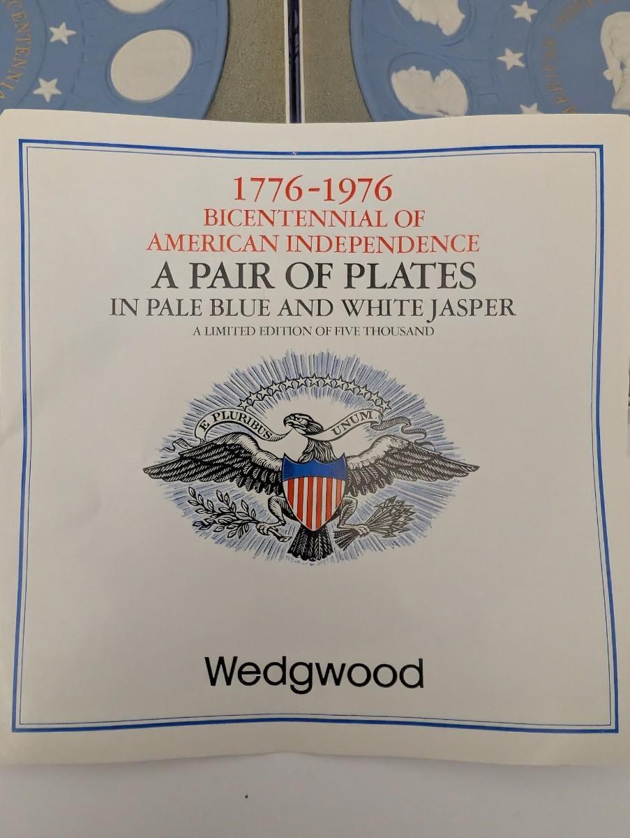 Limited edition Wedgwood bicentennial plate set crafted in pale blue and white jasperware to commemorate American Independence 1776–1976. Includes two decorative plates featuring patriotic eagle and historic portrait designs, original box, and paperwork insert. Collectible heritage set celebrating U.S. history.