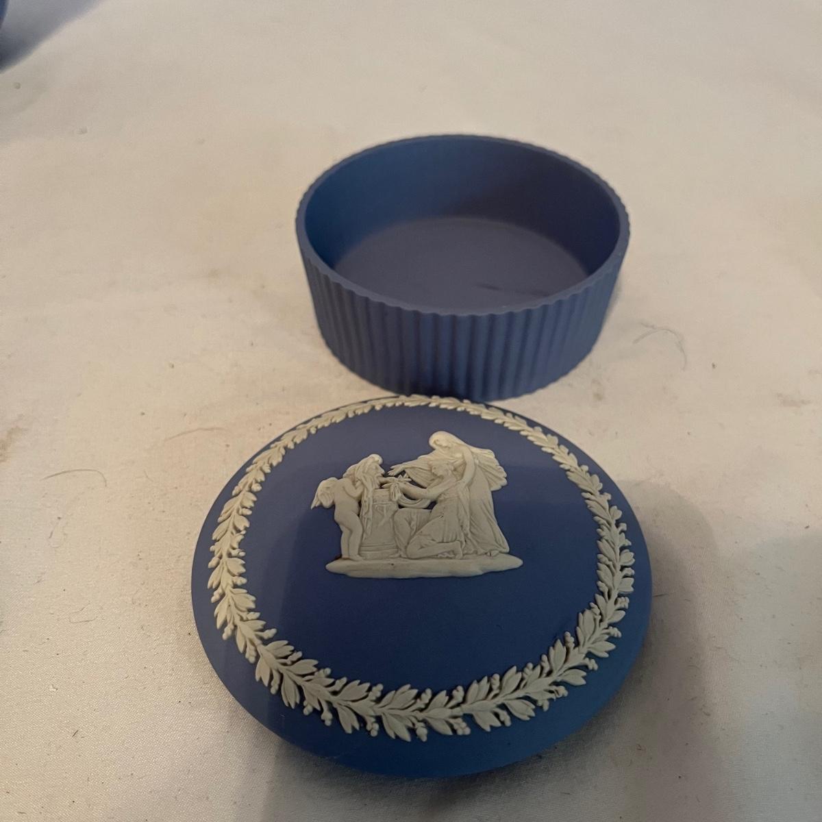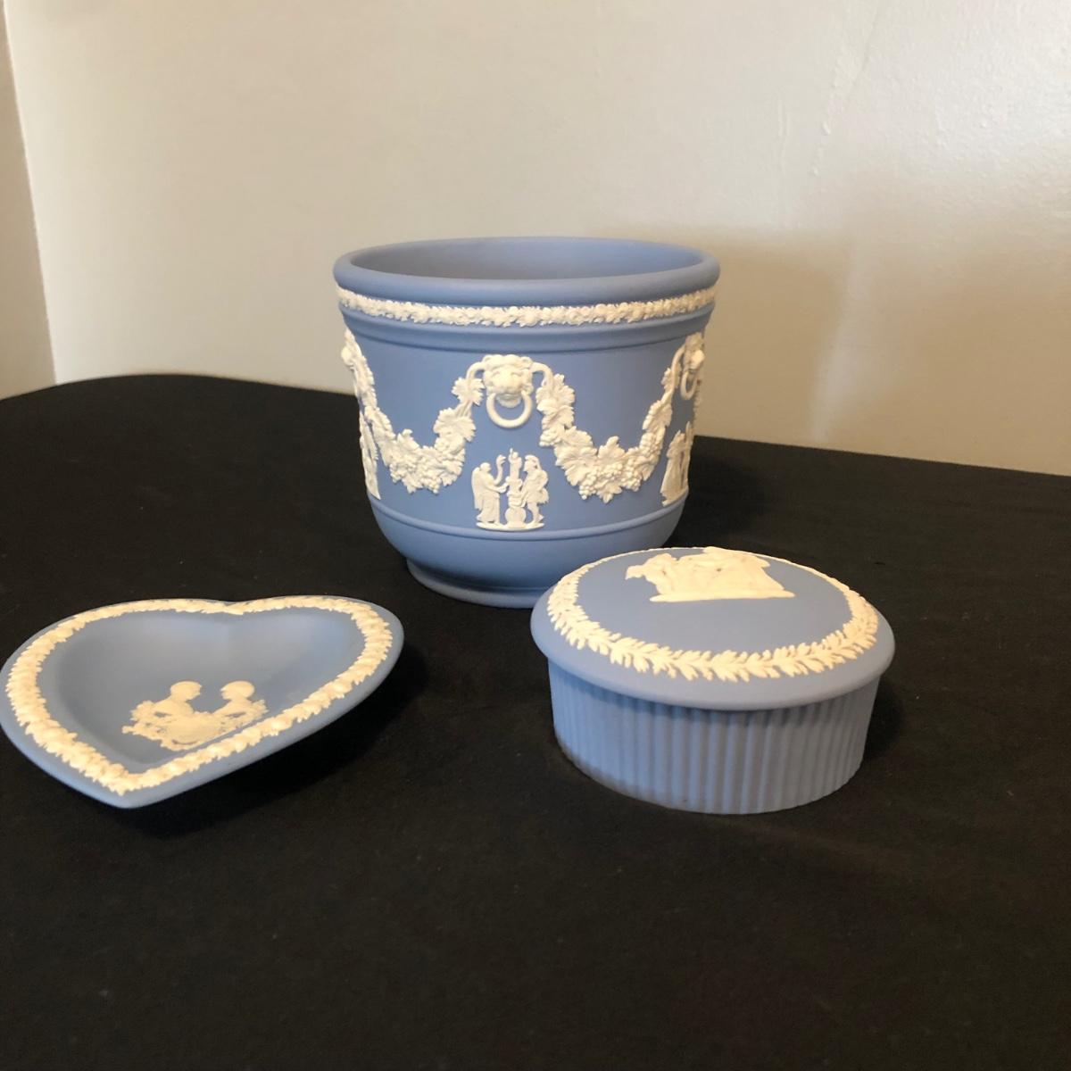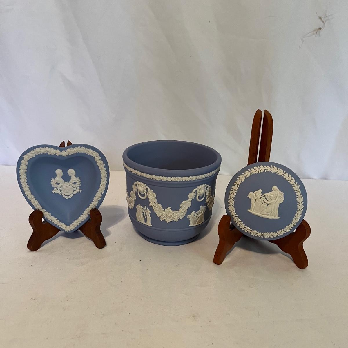 Lot includes a bowl, heart shaped dish and a lidded container. All items are marked Wedgwood Made in England. Bowl measures 5”D x 4.5” tall.