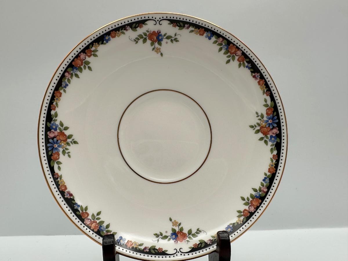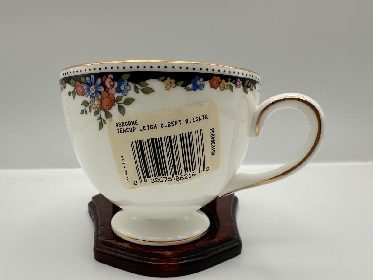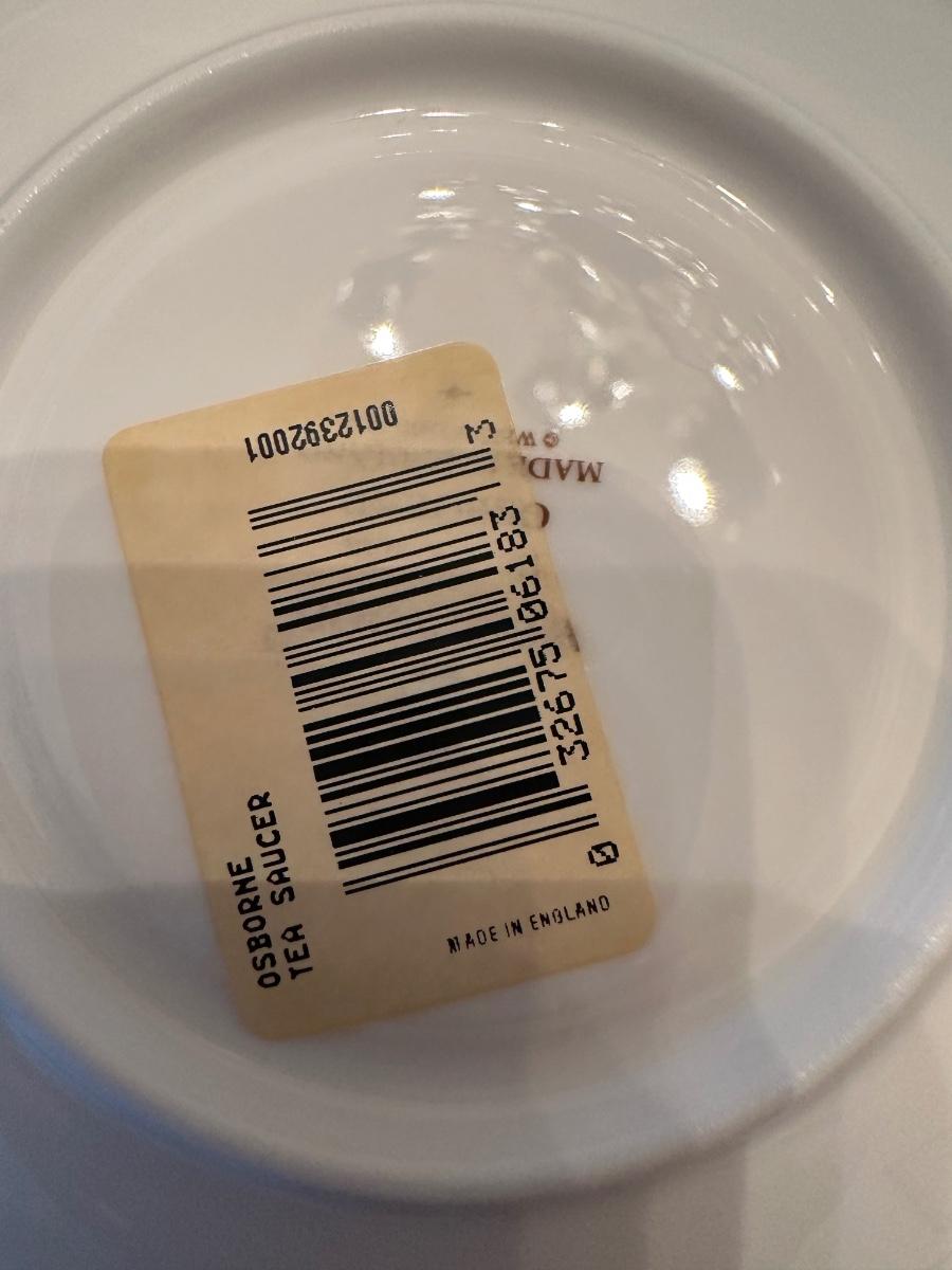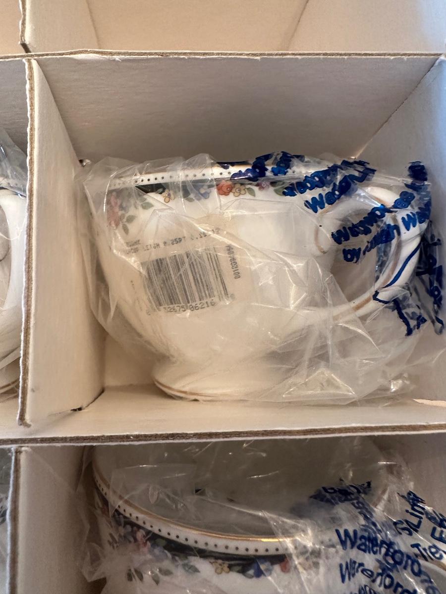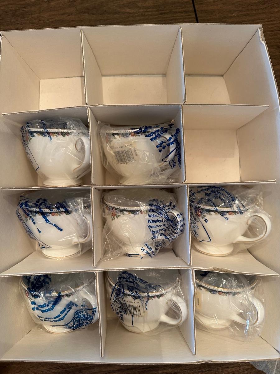 The cups remain in their original packaging with tags still attached, and the saucers also retain their tags. A matching dinner plate set is available in the auction.