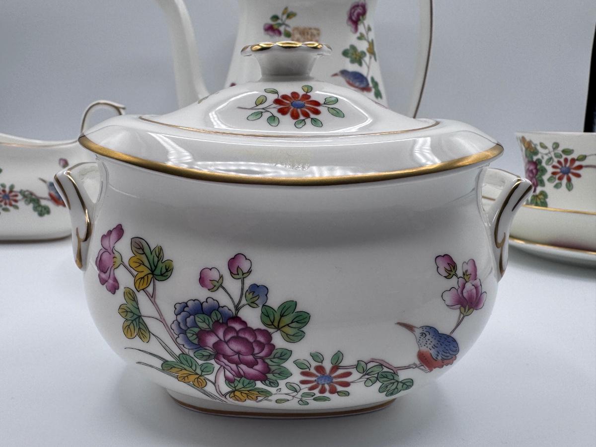Exquisite Wedgwood “Cuckoo” tea set crafted from fine bone china, showcasing vibrant floral motifs and colorful birds in the iconic Cuckoo pattern. This set is perfect for collectors, afternoon tea lovers, or anyone who appreciates timeless English elegance.