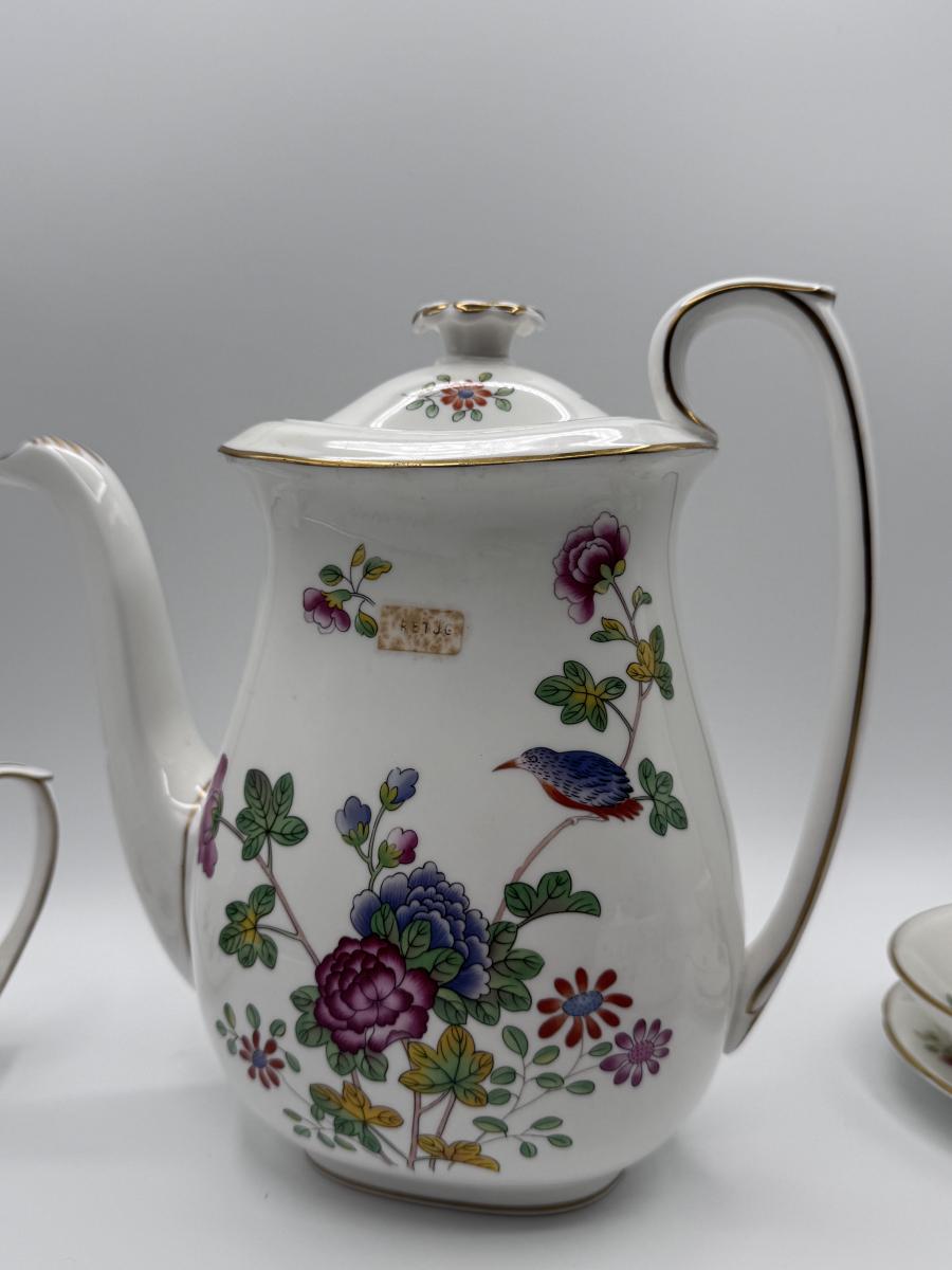 Exquisite Wedgwood “Cuckoo” tea set crafted from fine bone china, showcasing vibrant floral motifs and colorful birds in the iconic Cuckoo pattern. This set is perfect for collectors, afternoon tea lovers, or anyone who appreciates timeless English elegance.