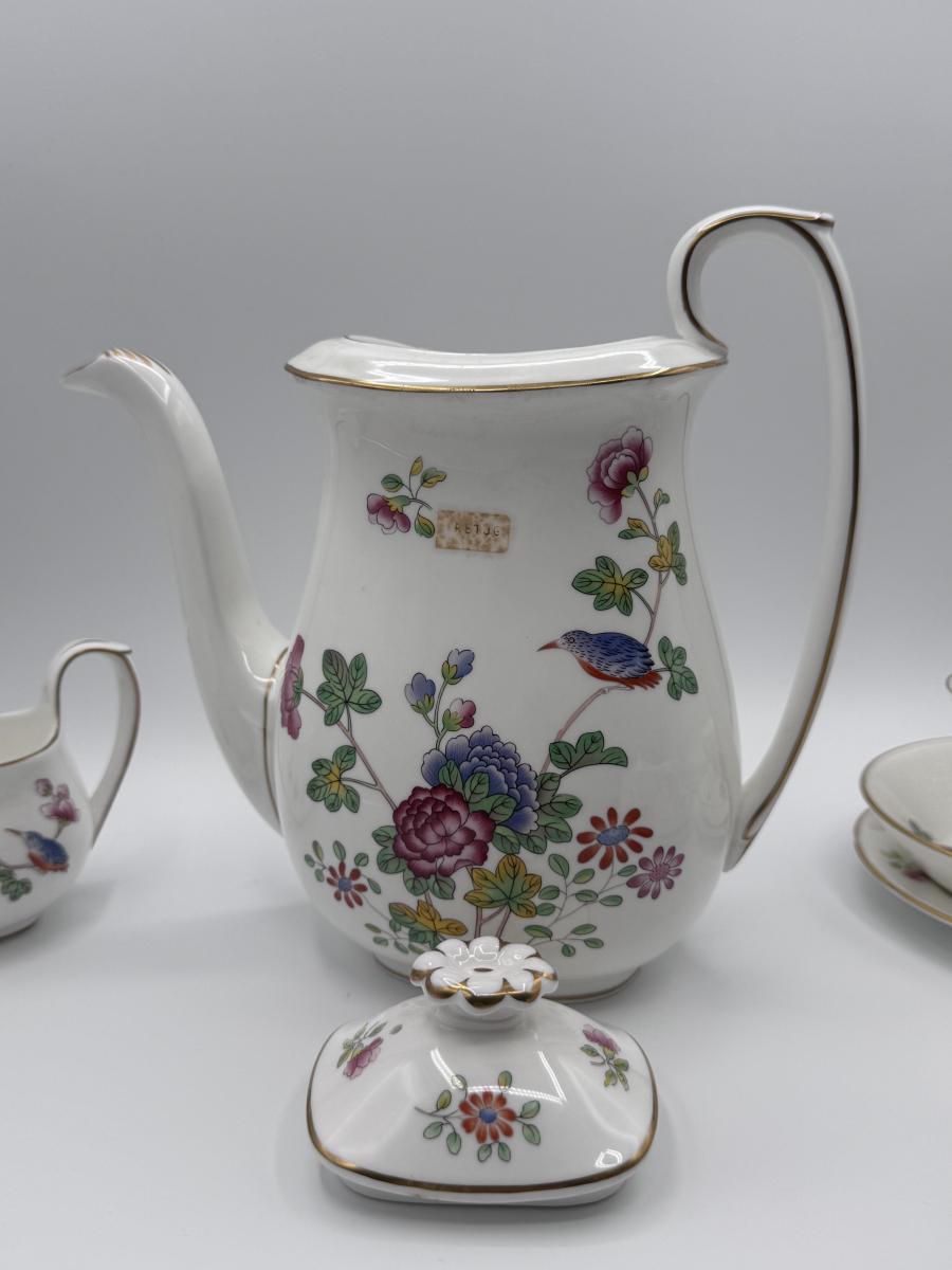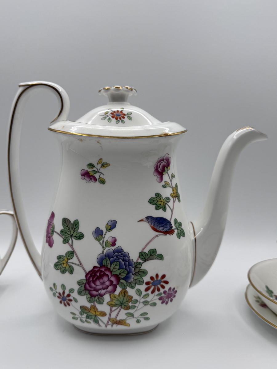 Exquisite Wedgwood “Cuckoo” tea set crafted from fine bone china, showcasing vibrant floral motifs and colorful birds in the iconic Cuckoo pattern. This set is perfect for collectors, afternoon tea lovers, or anyone who appreciates timeless English elegance.