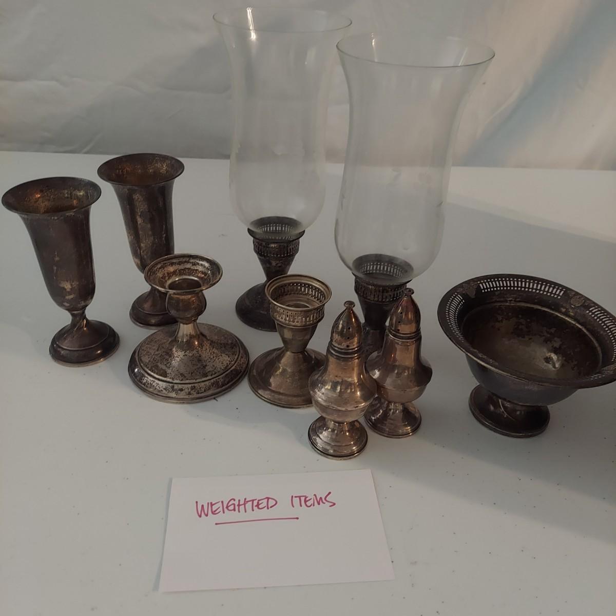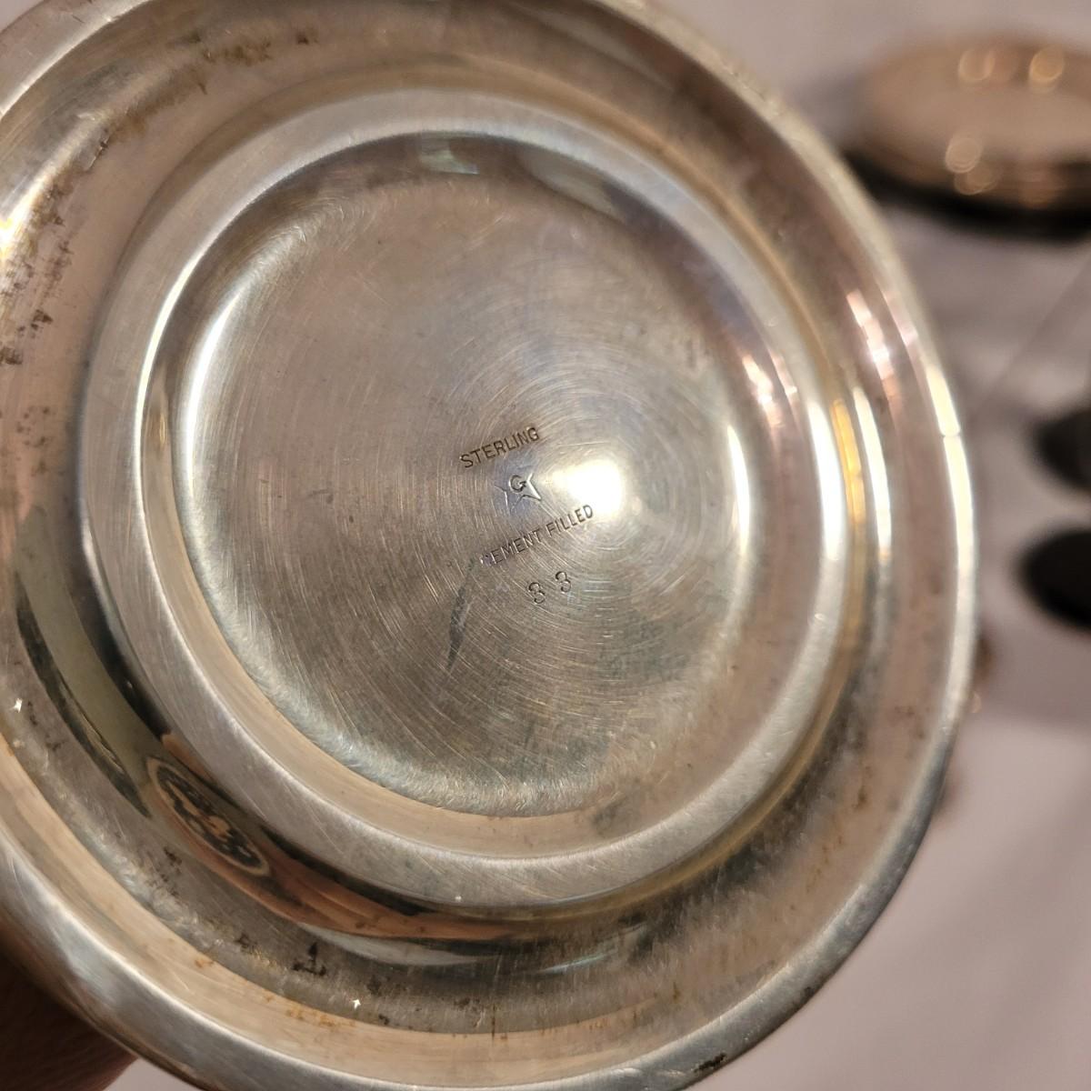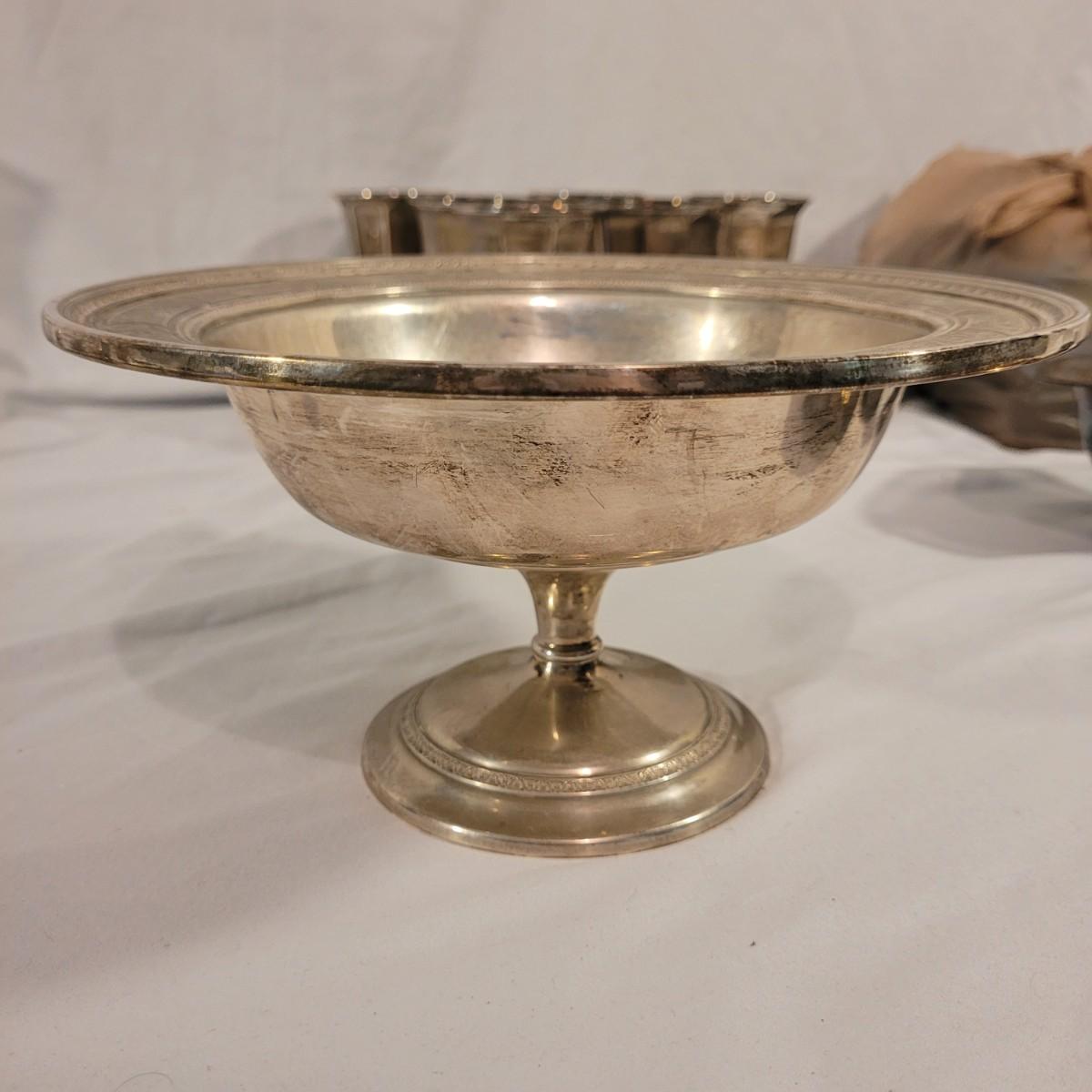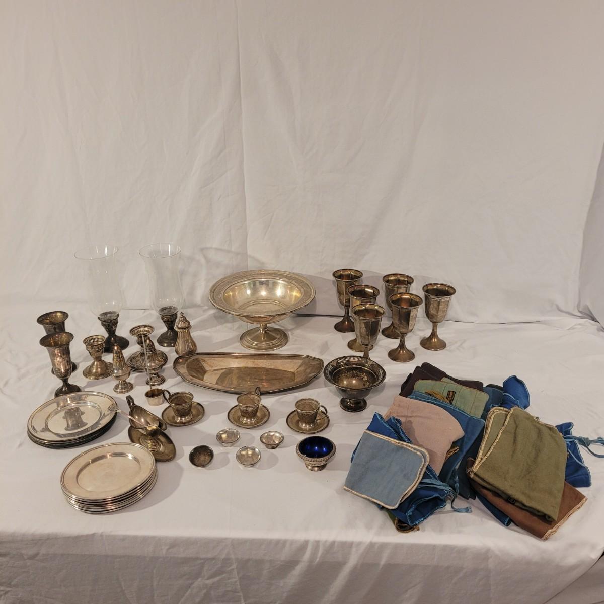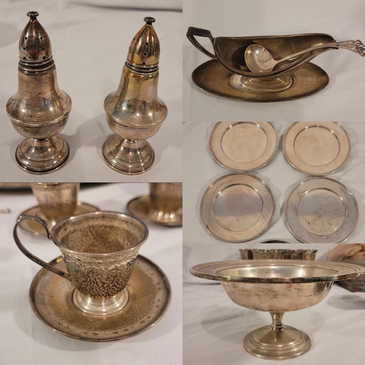 This large assortment of sterling silver pieces include a Wedgwood compote footed bowl, Gorham candlestick holders, demitasse espresso cups (no inserts), goblets, salt and pepper shakers, gravy boat, small plates, a serving tray and more. A large collection of felt polishing cloths included as well. Compote bowl measures approximately 10”D x 5.5”H. Shipping available. All sales are final. No returns or refunds. Please bid accordingly. Starting bid is at or near melt value.
