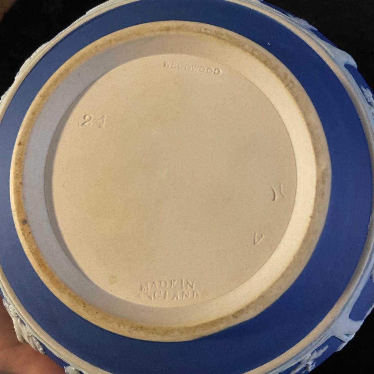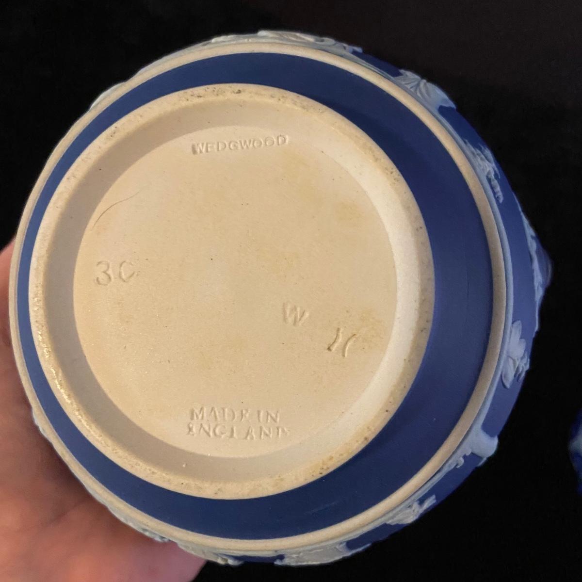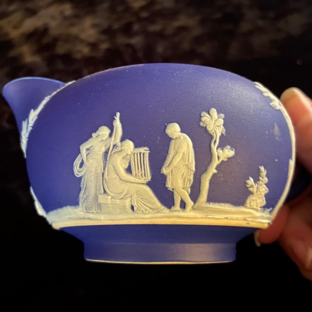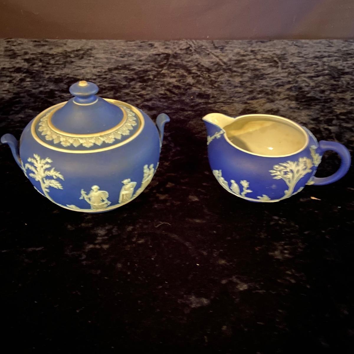 This lot includes a Wedgwood jasperware teapot with stand, creamer and covered sugar bowl. Each porcelain piece is stamped with ‘Wedgwood’ and “Made in England”. The stand has a 6.5”D and the sugar bowl has a 5.5”D. Shipping available.