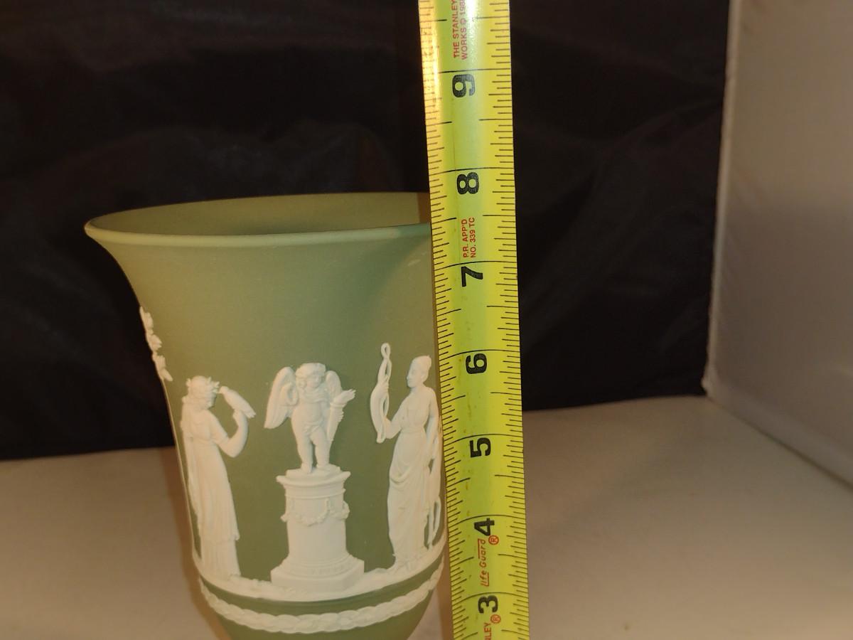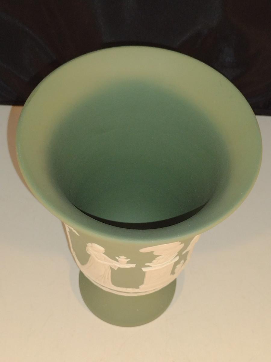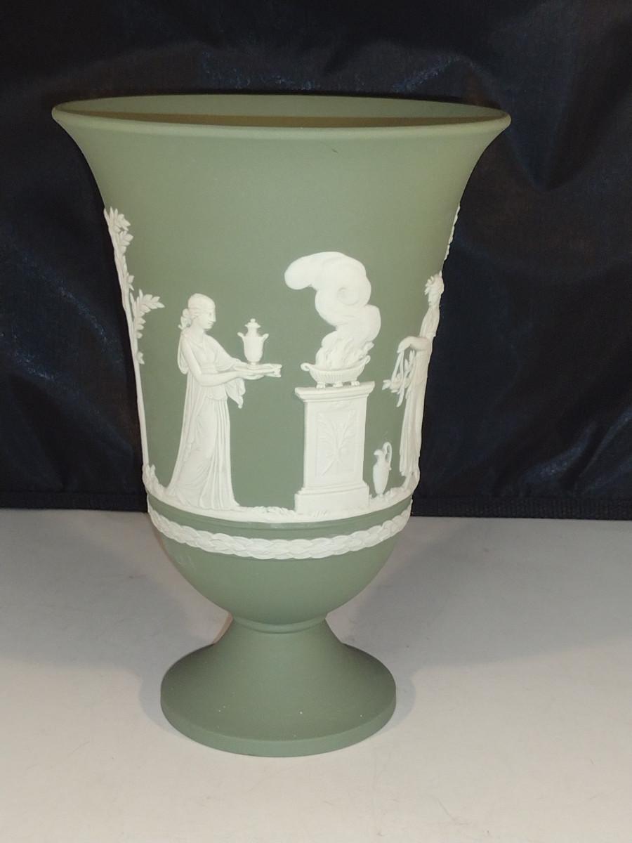Wedgwood Jasperware Flared Top Pedestal Arcadian Vase- White on Celadon (DR)