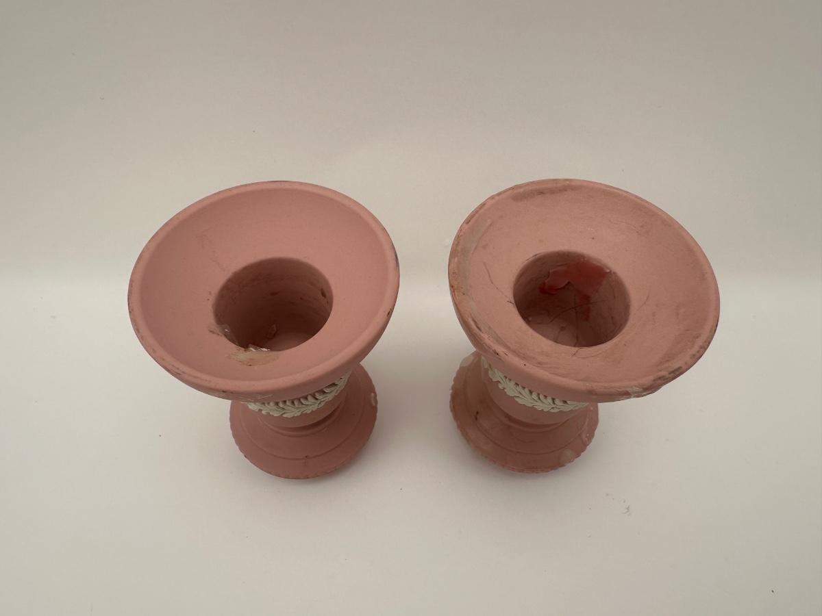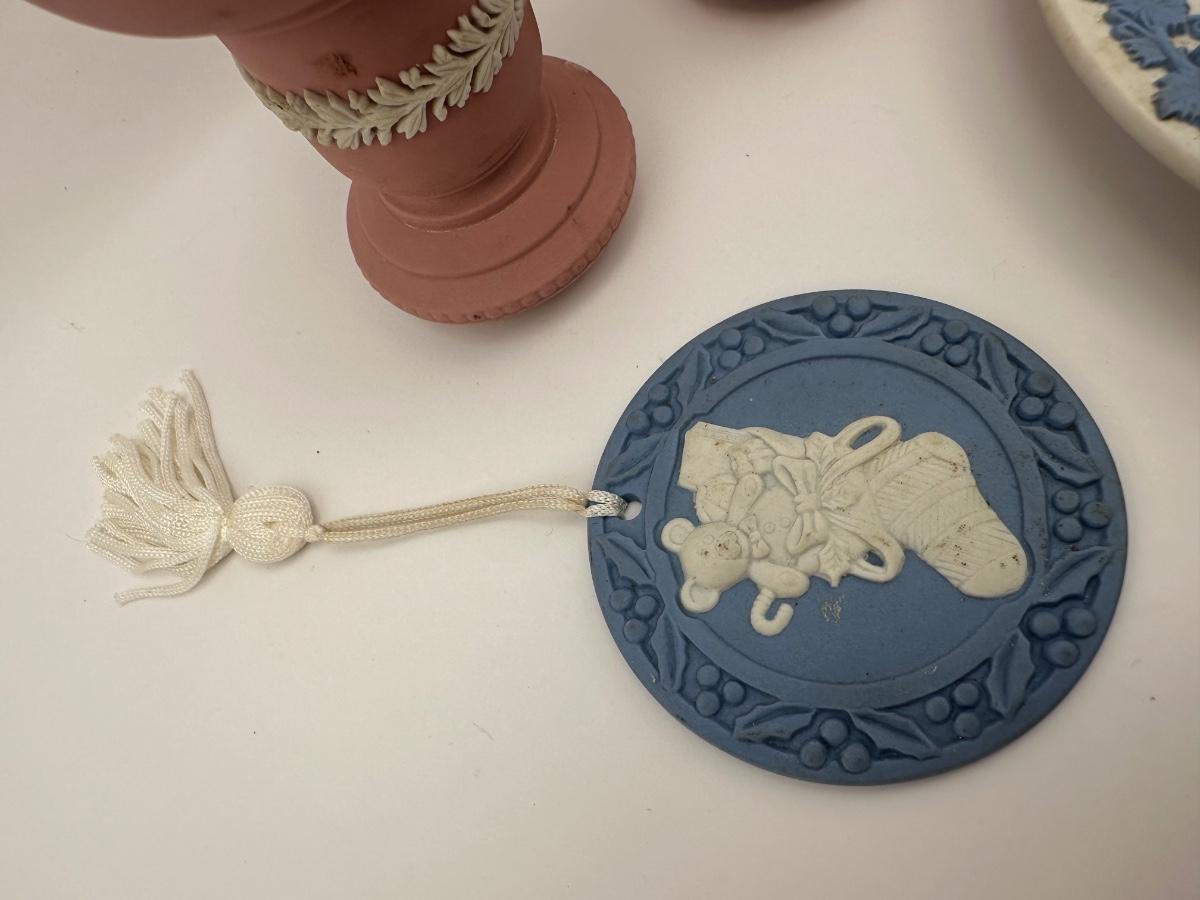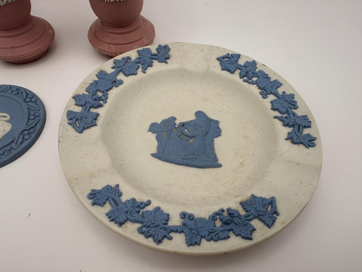 Lot of Wedgwood jasperware including blue and white ashtray, blue hanging ornament, and pair of pink candle holders with applied white decoration. Light surface wear consistent with age